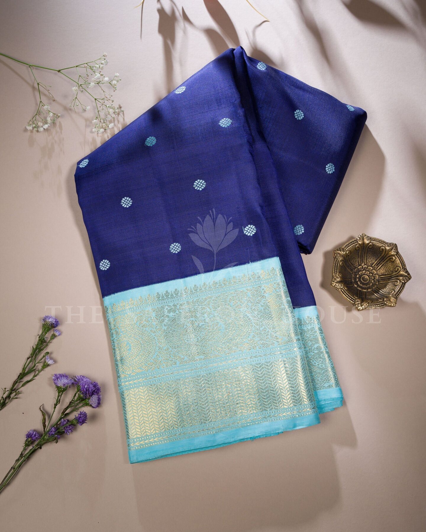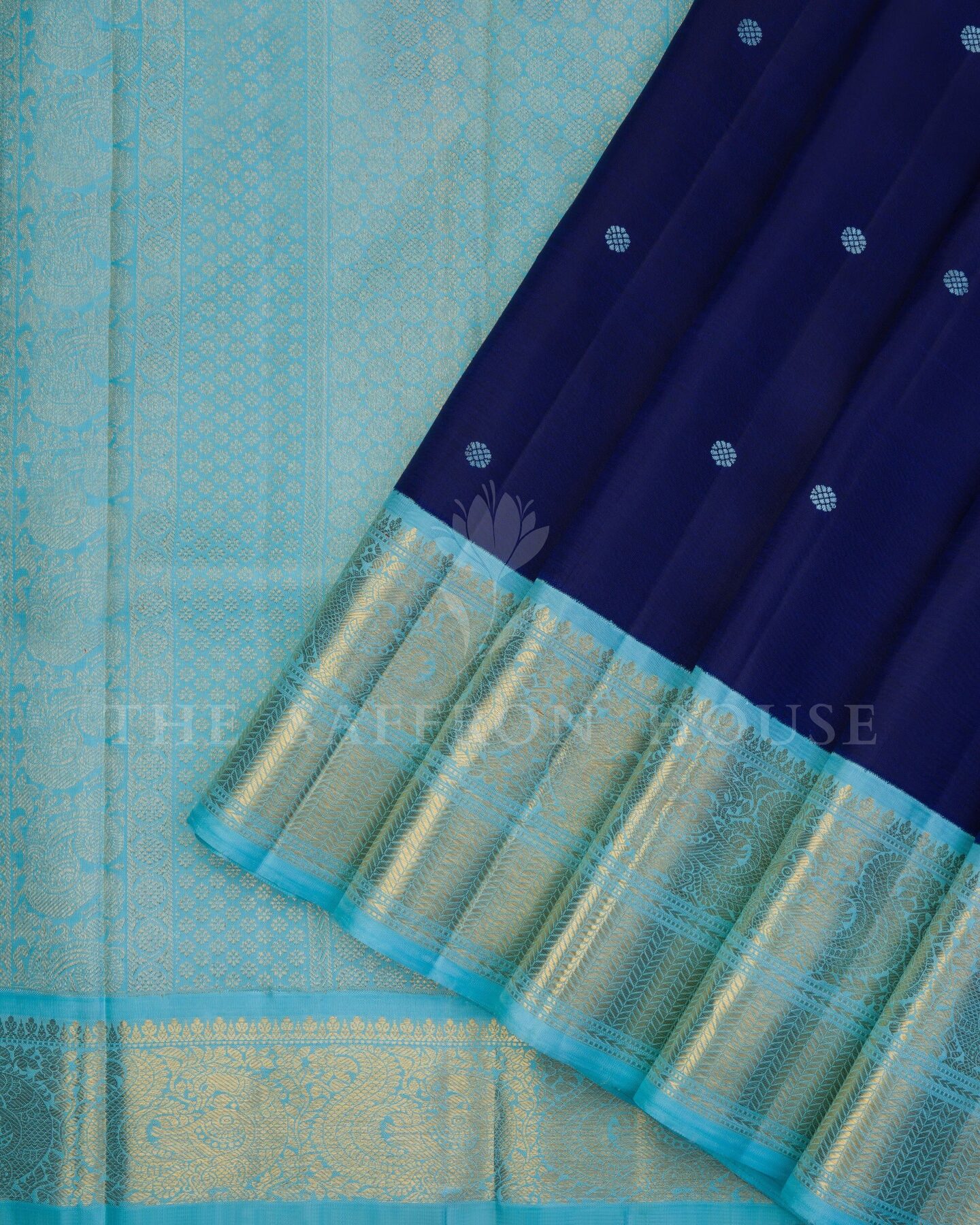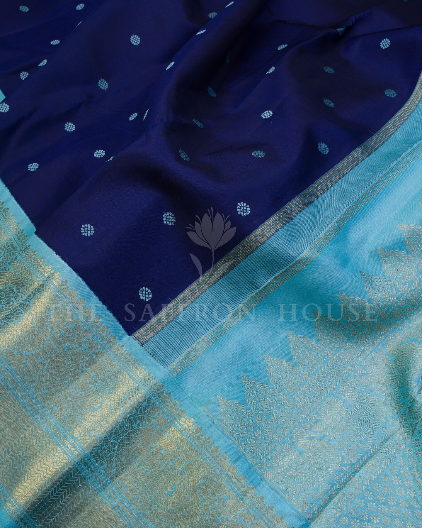 There is something about the interplay of navy blue and sky blue that feels both ancient and alive. This Handwoven Kanjivaram silk saree opens with radiant in its own quiet way, its surface shimmering with the unhurried rhythm of the loom.