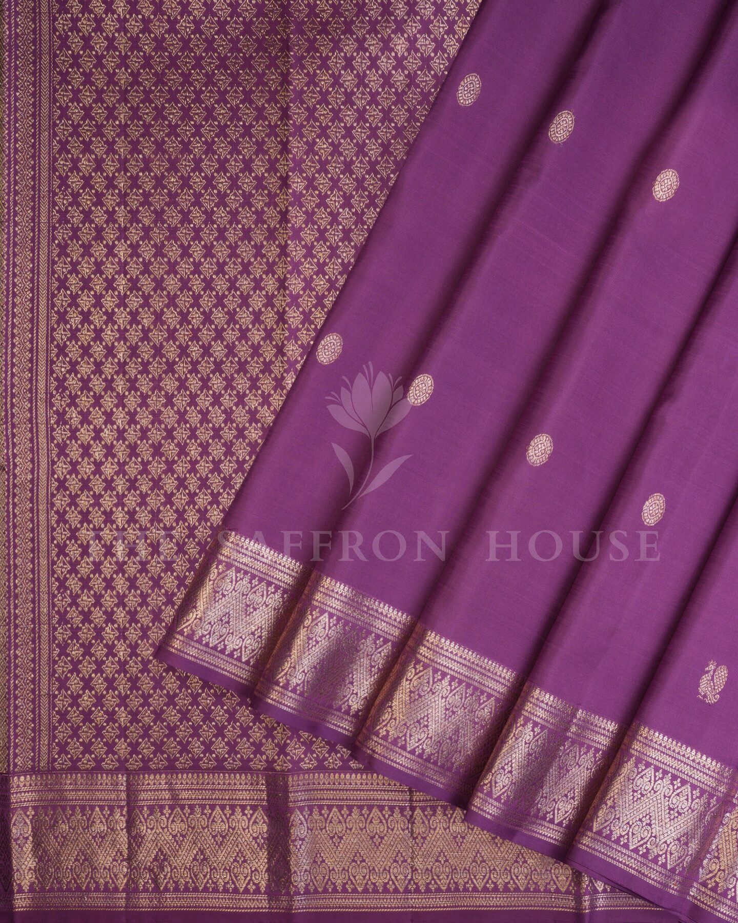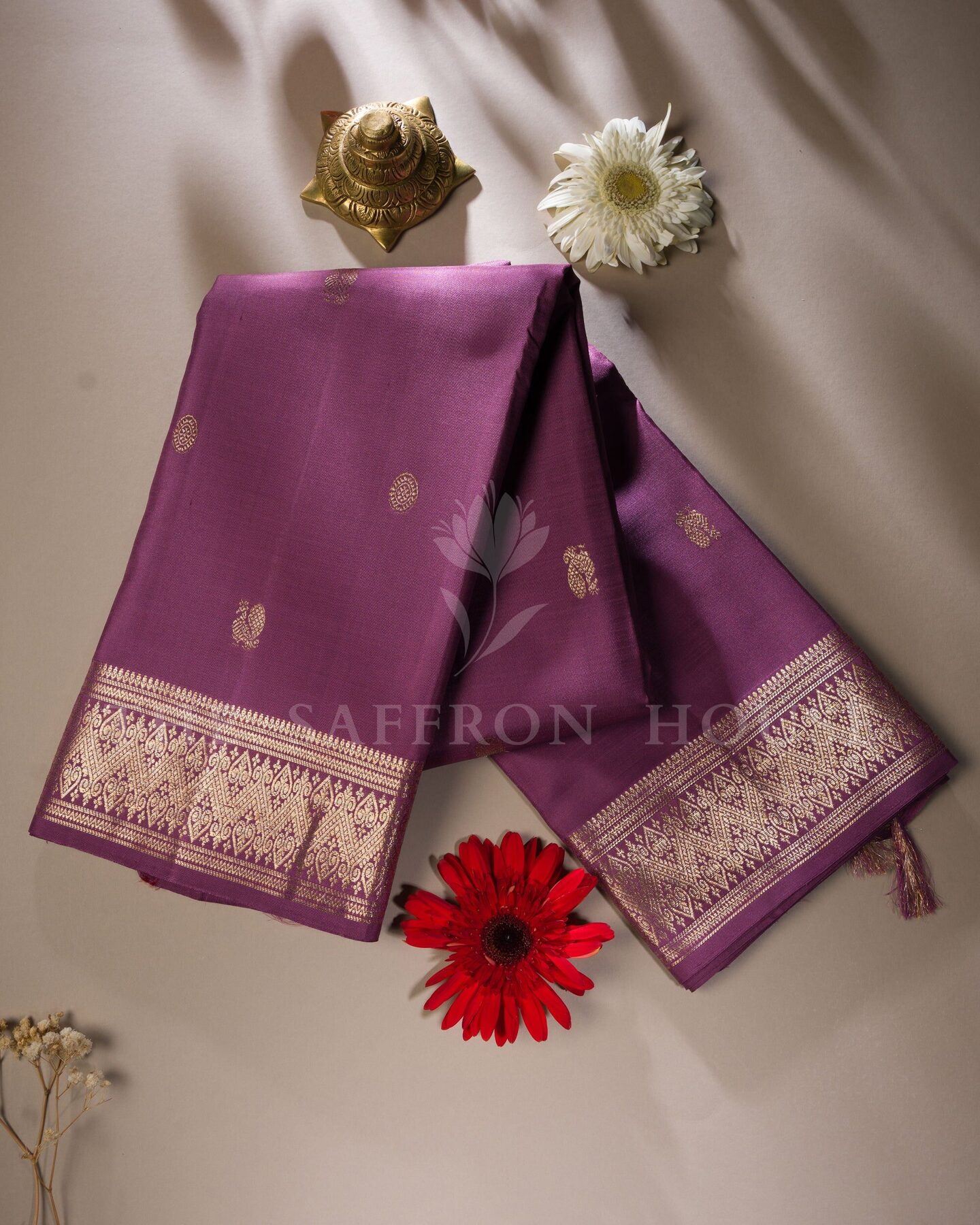 Some colours hold memory. Plum — radiant in its own quiet way — becomes something entirely new when woven into pure Kanjivaram silk. This Handwoven saree carries that colour with quiet authority and grace.