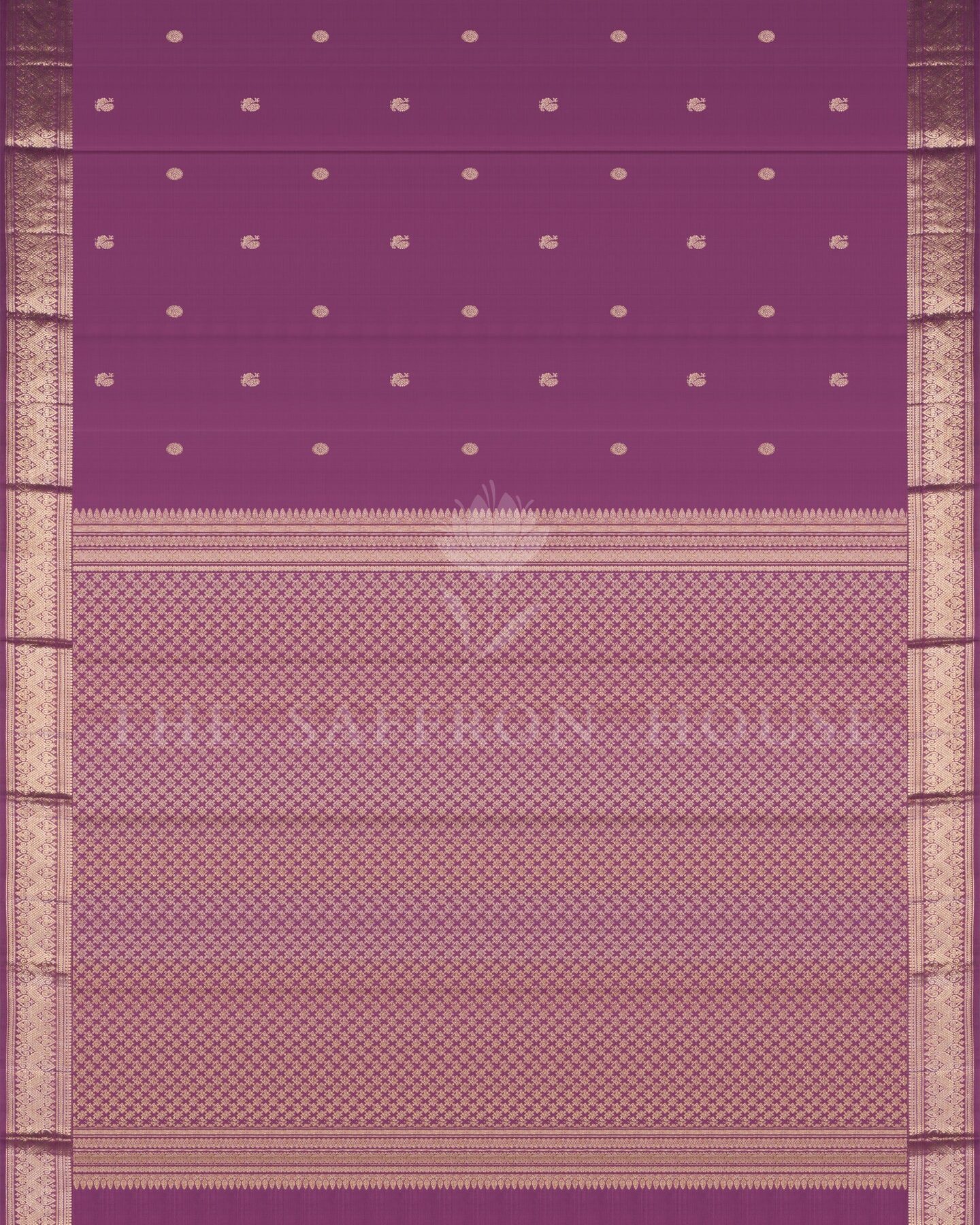 The body is woven with intricate traditional motifs, each thread placed with precision and purpose. A richly woven border frames the drape with confident definition, while gold zari runs through the weave, catching light the way temple gold does — slowly, deeply, unforgettably.