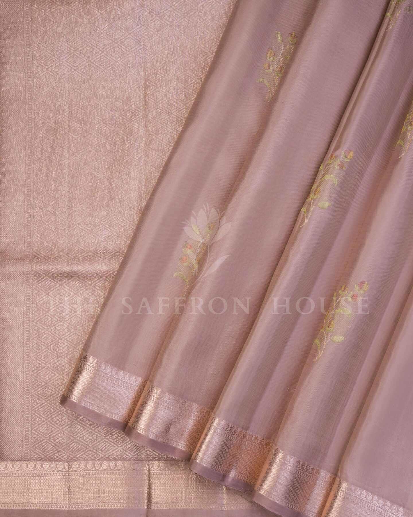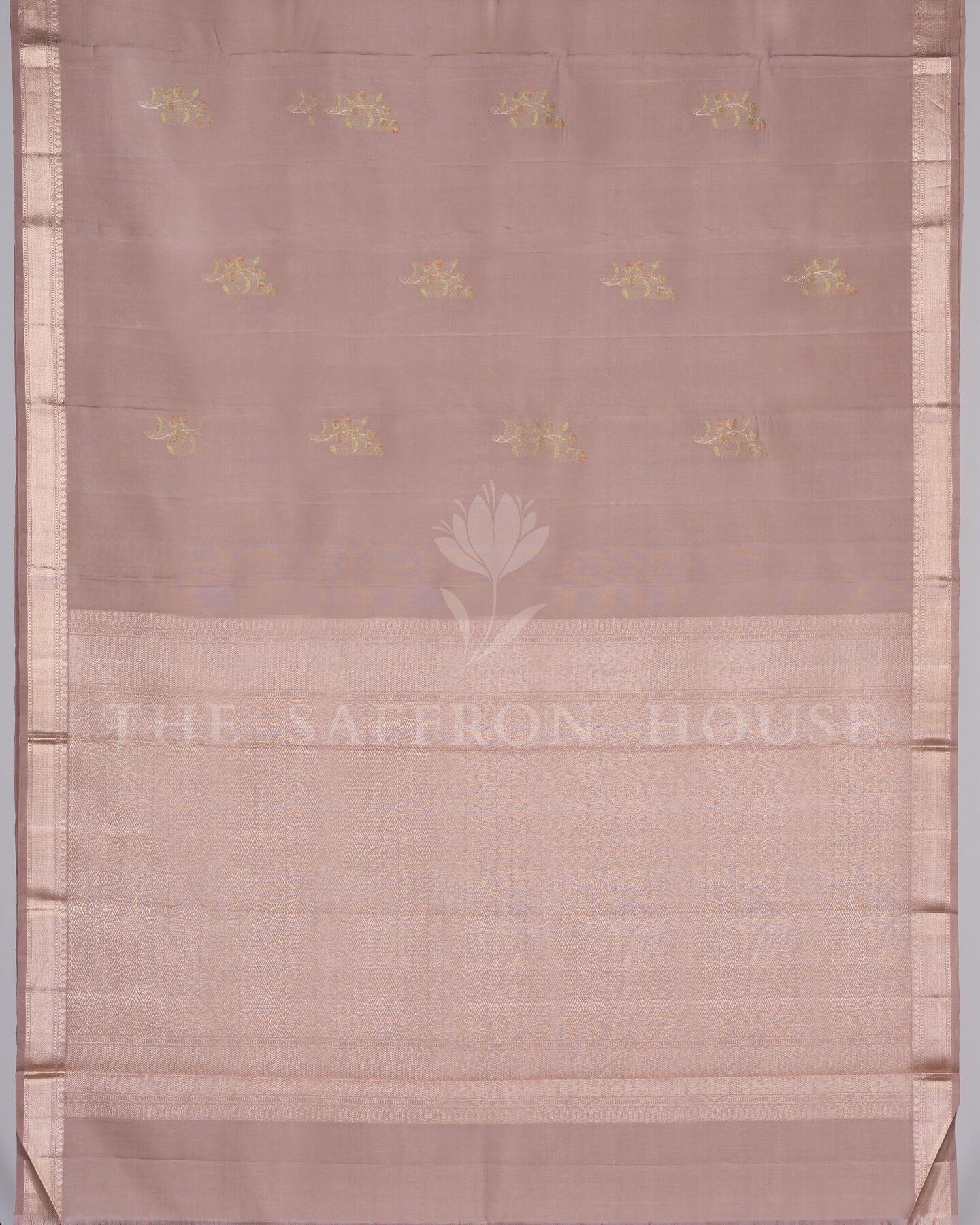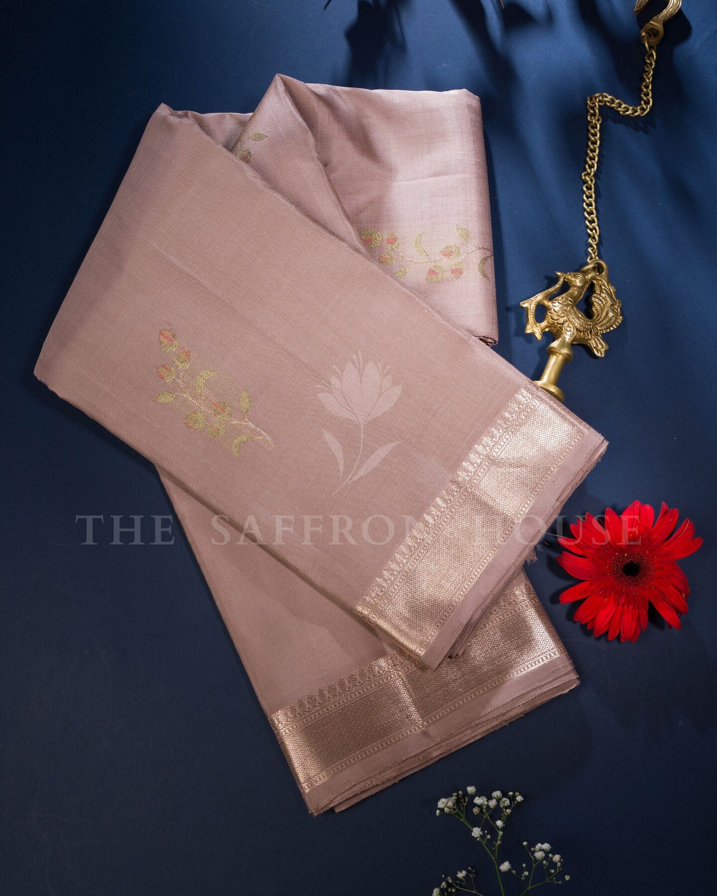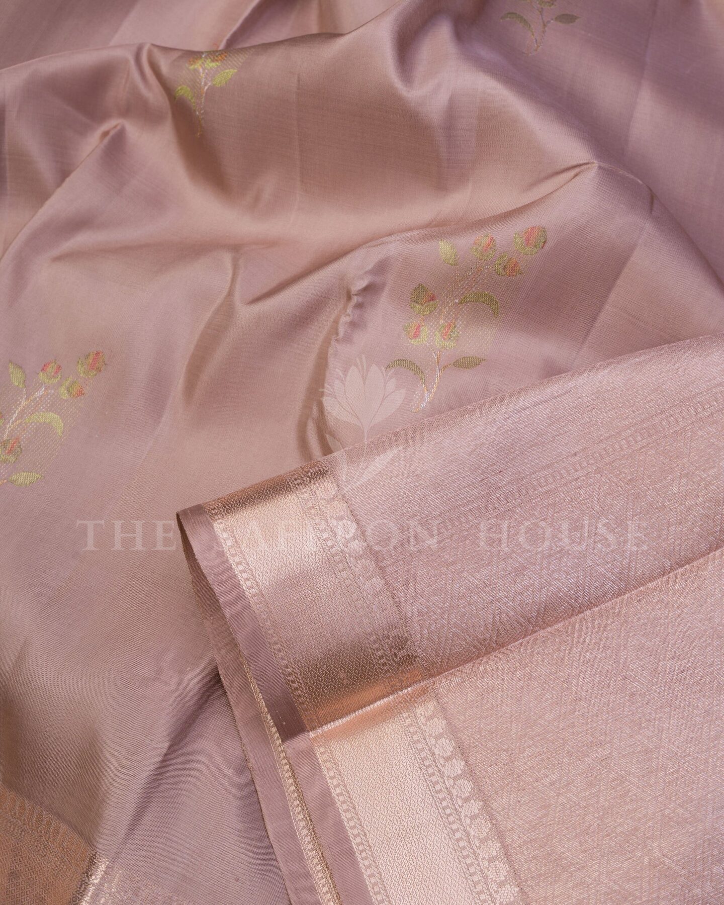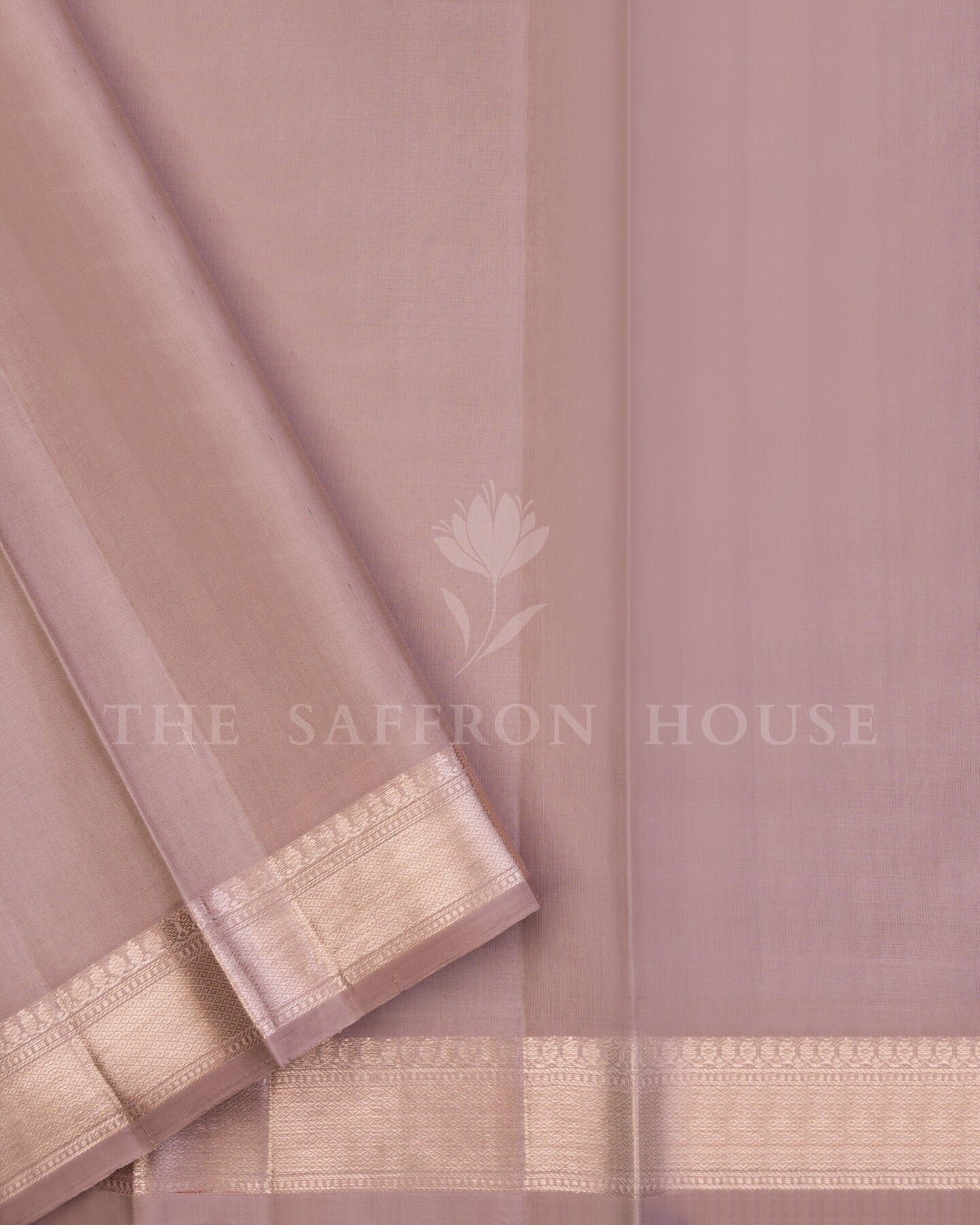 There is something about the interplay of mauve and rose that feels both ancient and alive. This Handwoven Kanjivaram silk saree opens with radiant in its own quiet way, its surface shimmering with the unhurried rhythm of the loom.