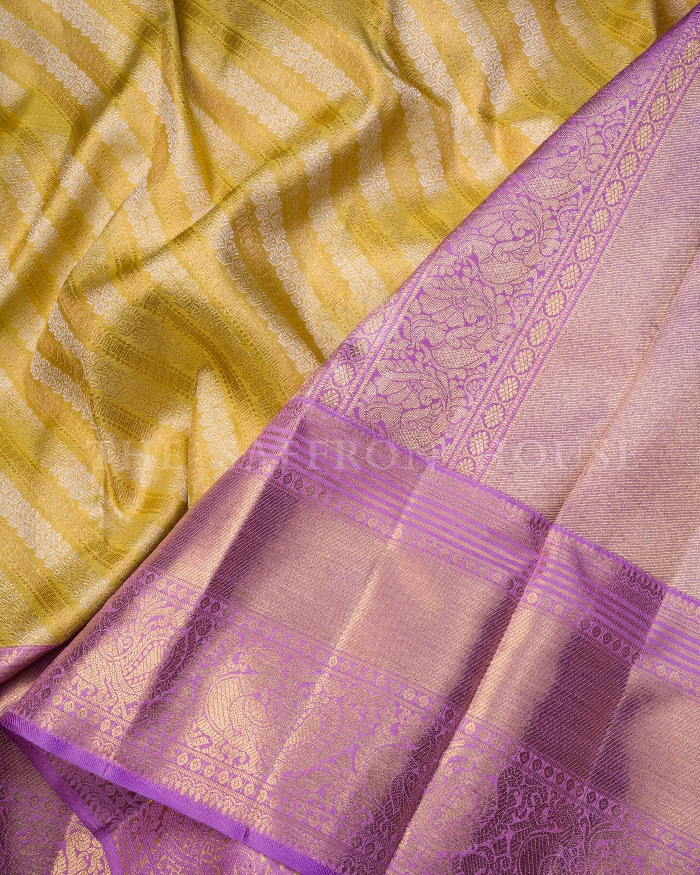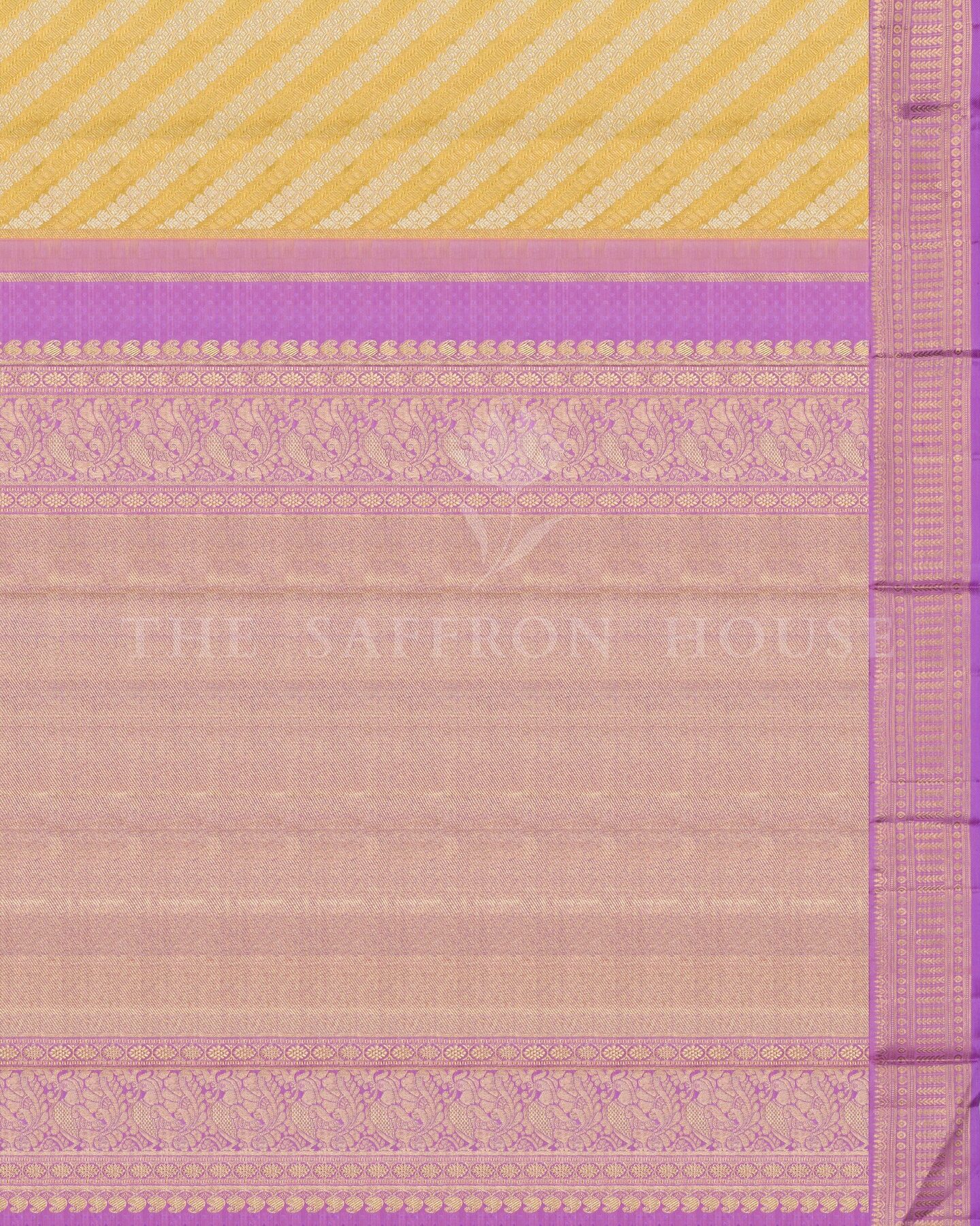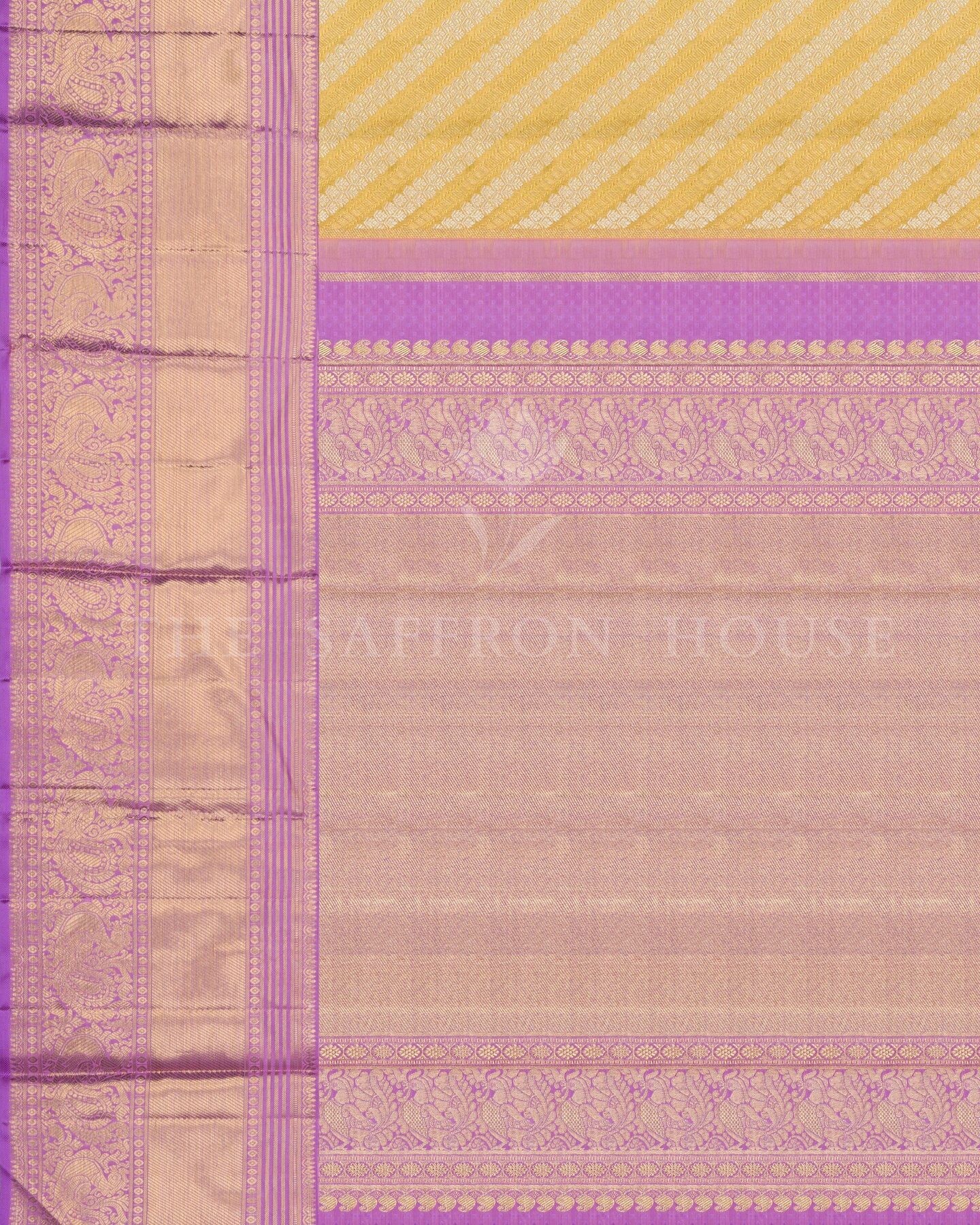 There is something about the interplay of gold and lavender that feels both ancient and alive. This Stripes Kanjivaram silk saree opens with luminous as temple gold at dusk, its surface shimmering with the unhurried rhythm of the loom.