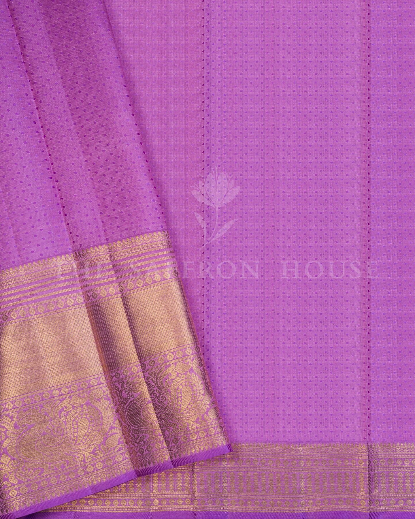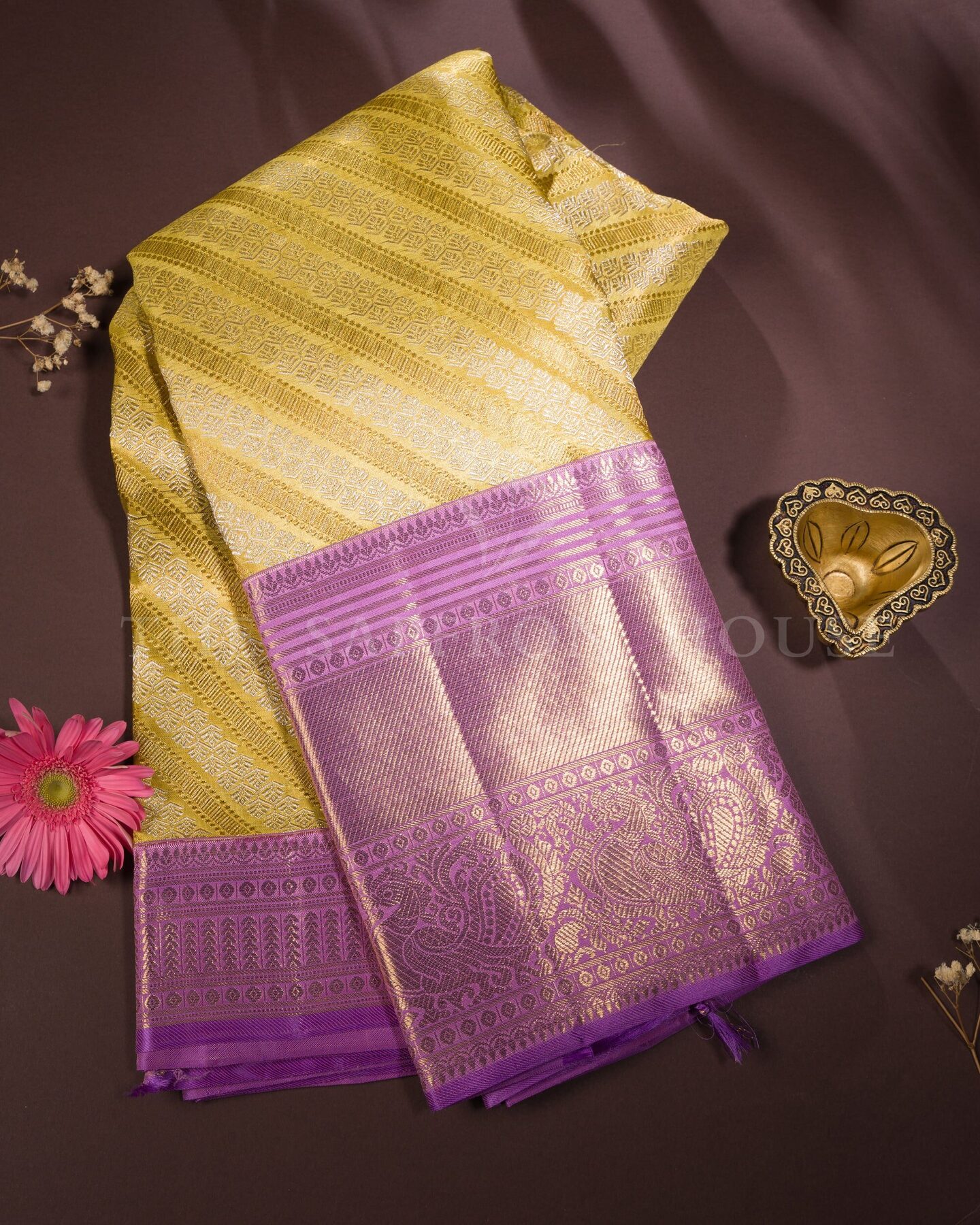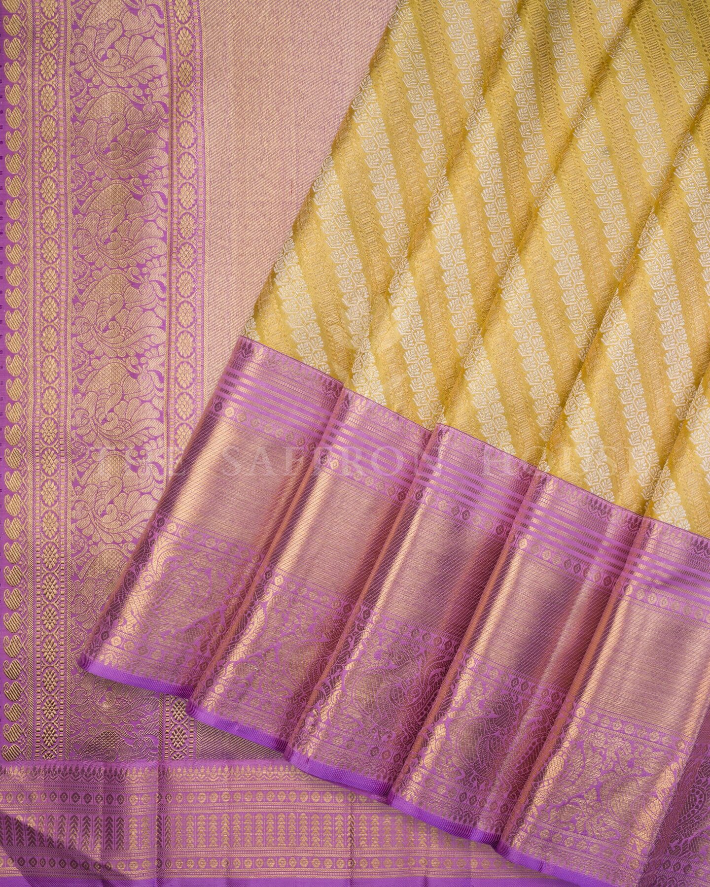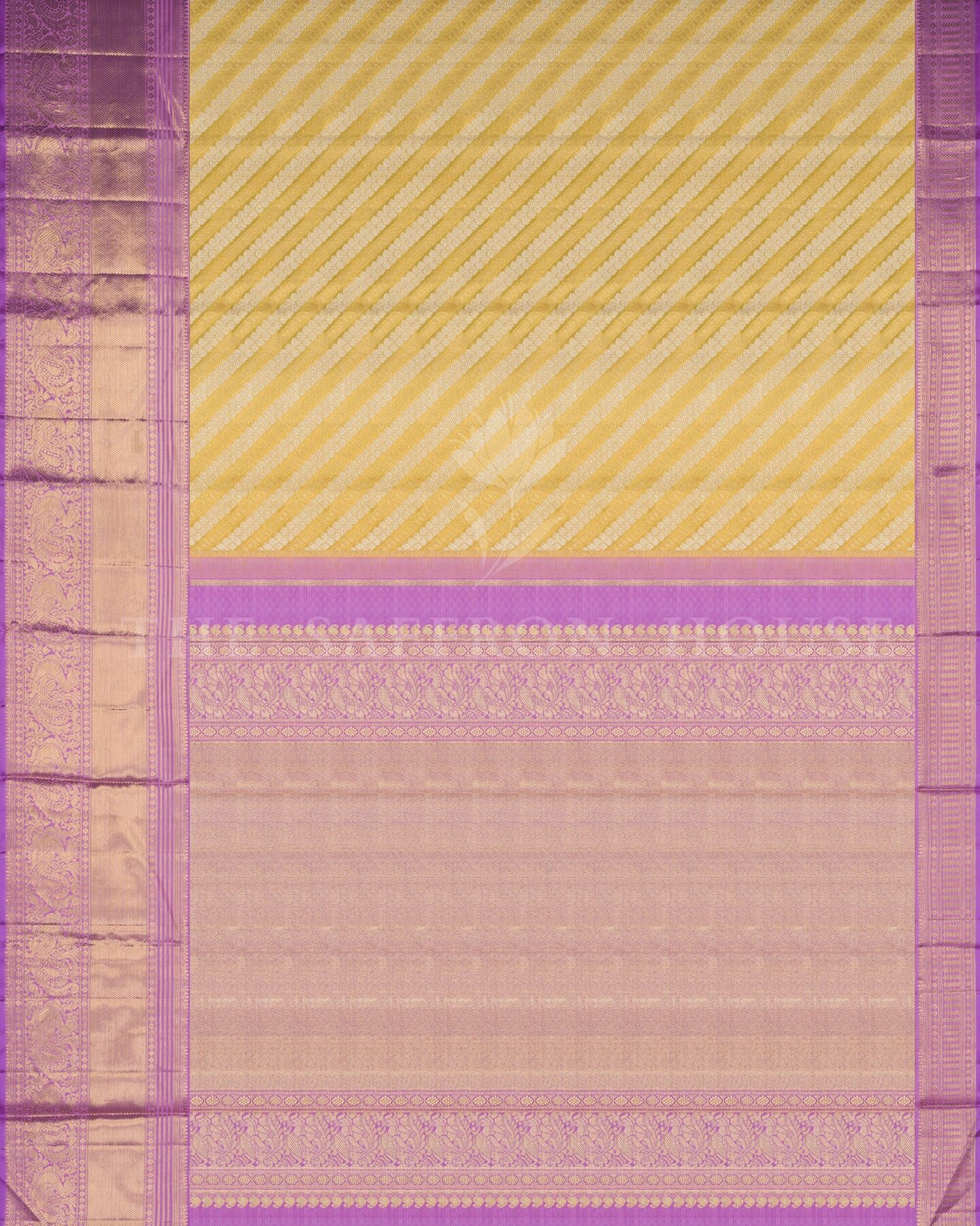 There is something about the interplay of gold and lavender that feels both ancient and alive. This Stripes Kanjivaram silk saree opens with luminous as temple gold at dusk, its surface shimmering with the unhurried rhythm of the loom.