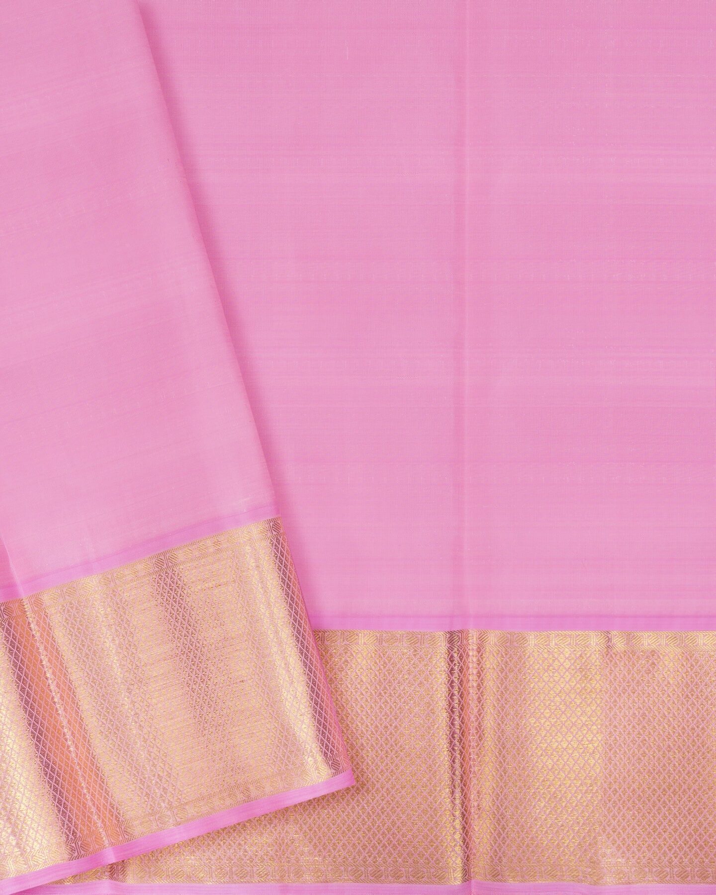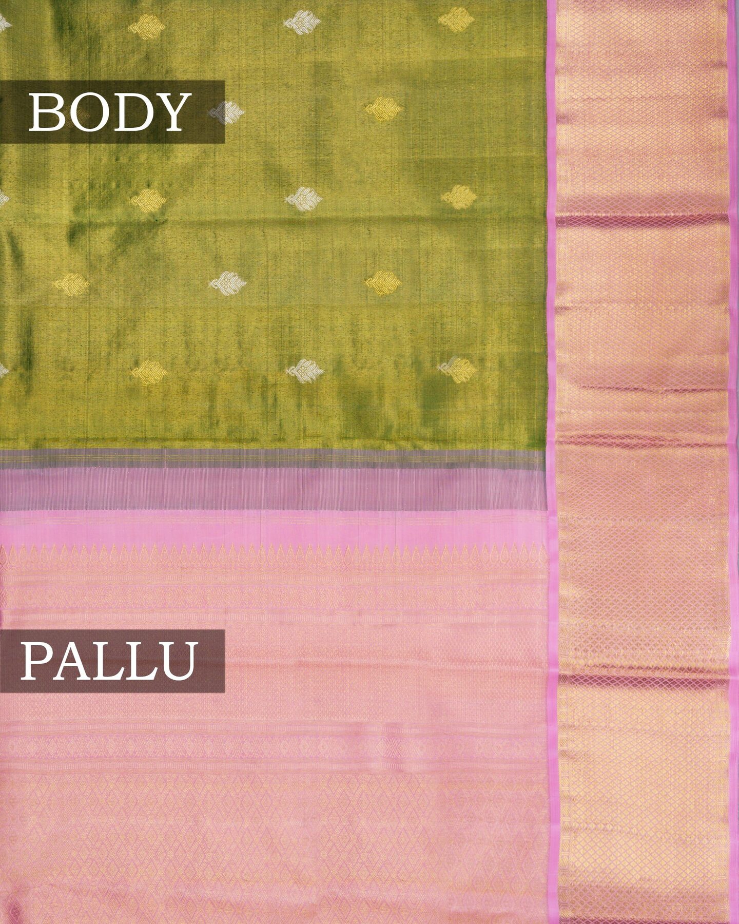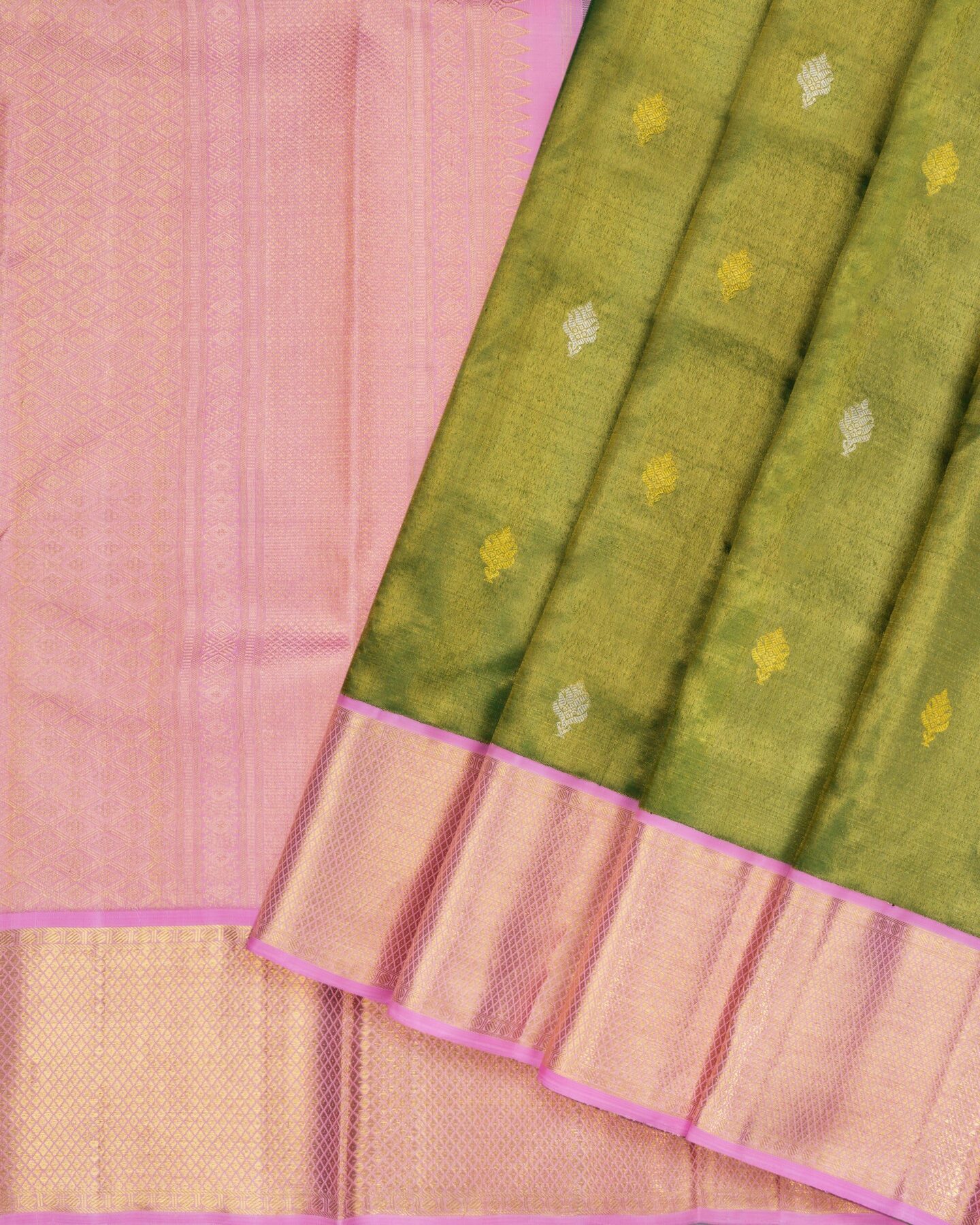 The body is adorned with silver & gold motifs, each thread placed with precision and purpose. The light pink border frames the drape with confident definition, while real zari runs through the weave, catching light the way temple gold does — slowly, deeply, unforgettably.
