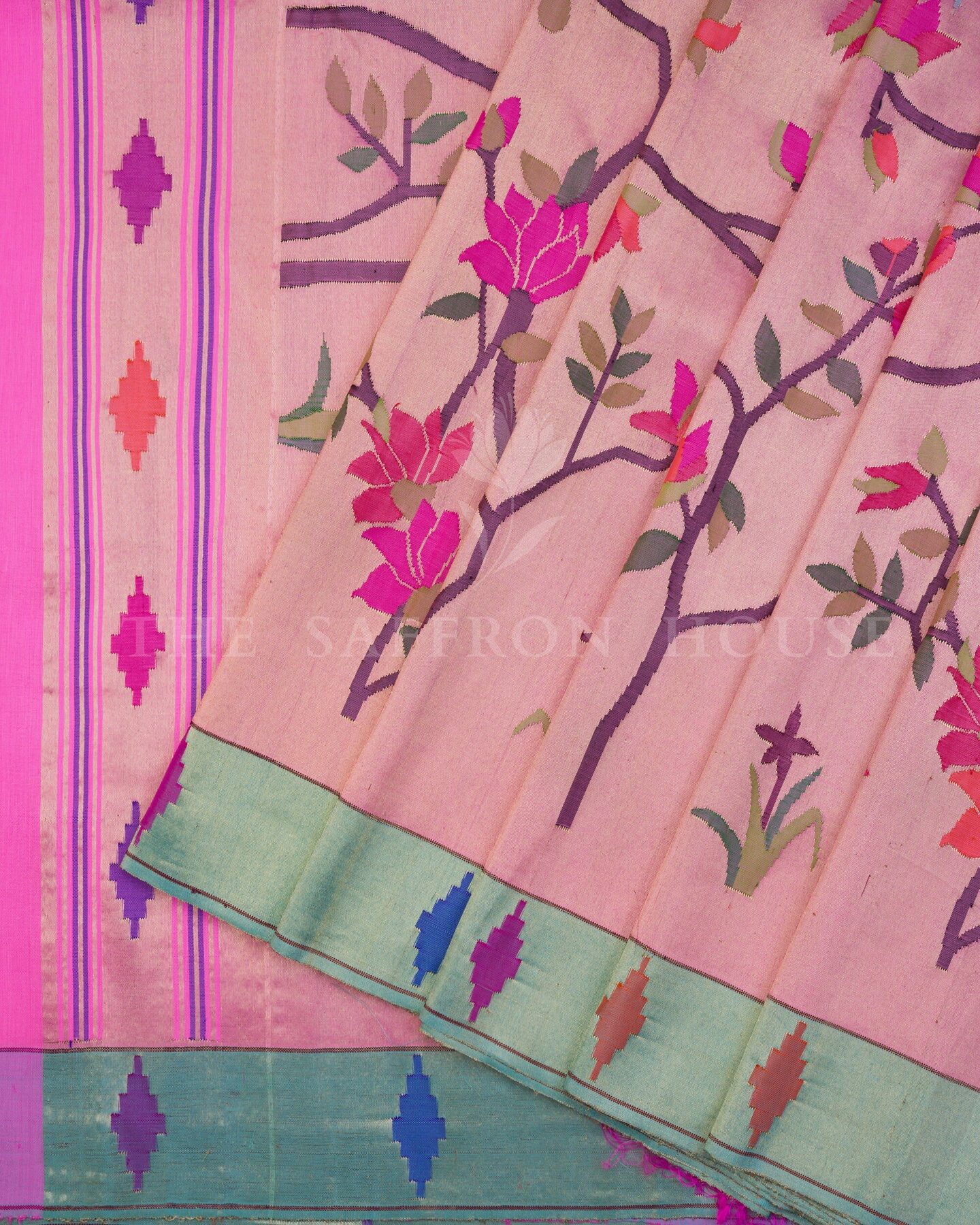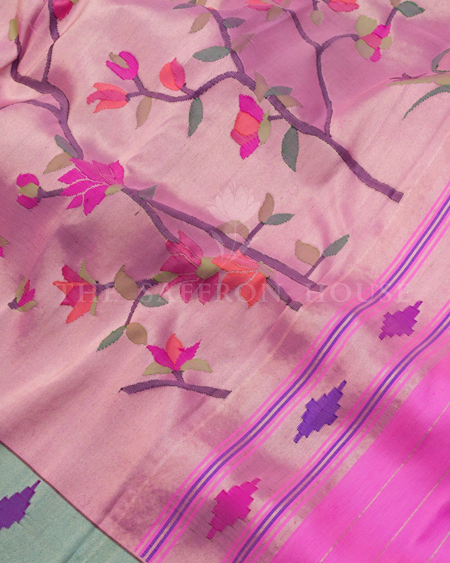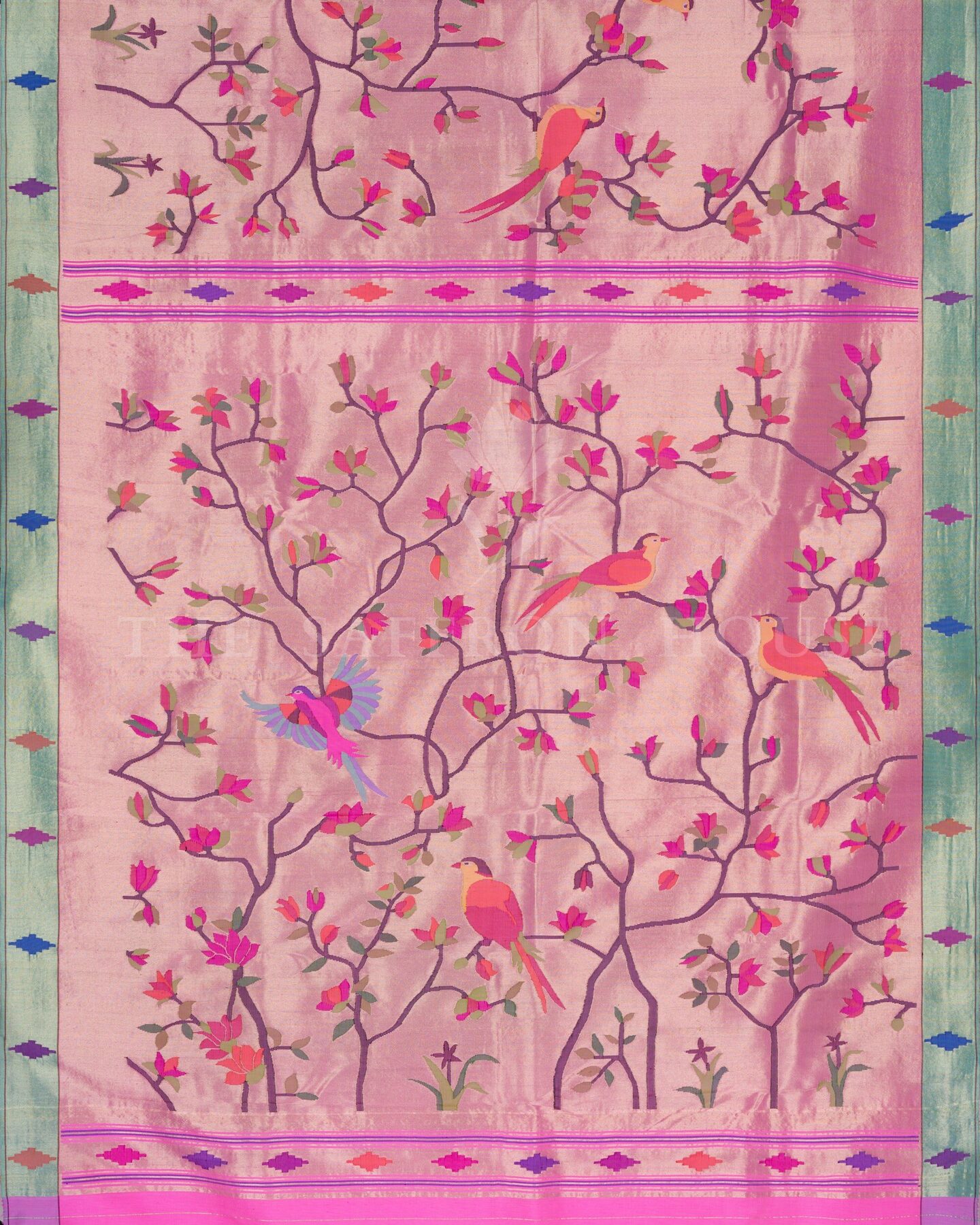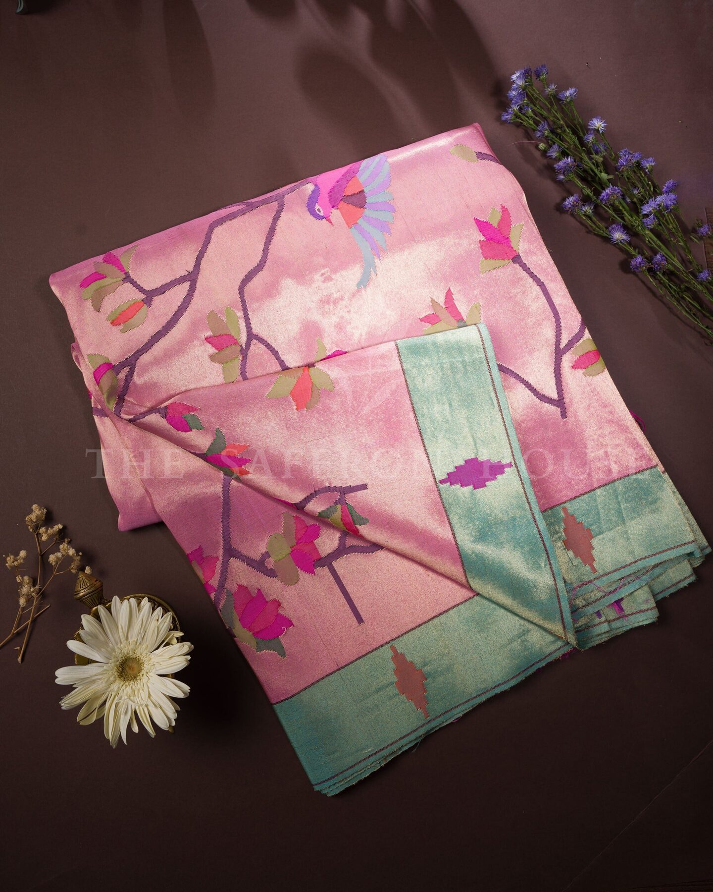 Paithani tissue combines fine silk and zari to create a semi-transparent, shimmering texture.. Woven in Yeola, Maharashtra, by senior Paithani artisans, the saree reflects centuries of weaving heritage with a rare tissue base—known for its luminous, airy quality.