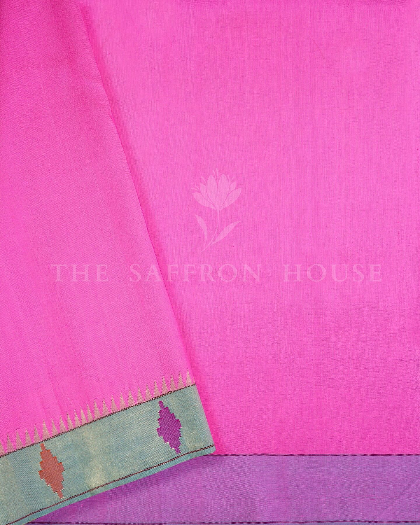 The body is woven with intricate traditional motifs, each thread placed with precision and purpose. A richly woven border frames the drape with confident definition, while gold zari runs through the weave, catching light the way temple gold does — slowly, deeply, unforgettably.