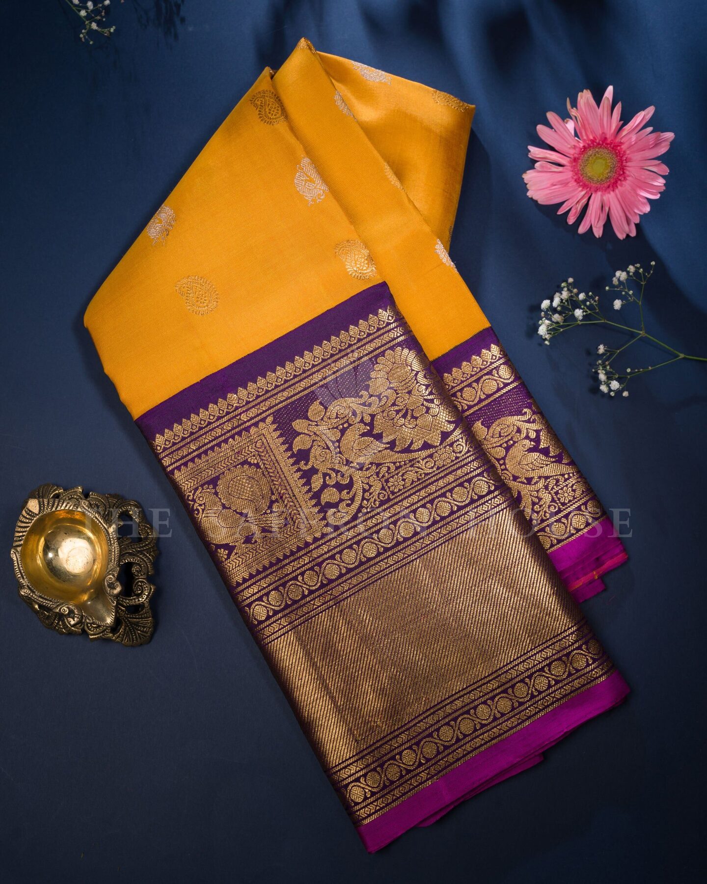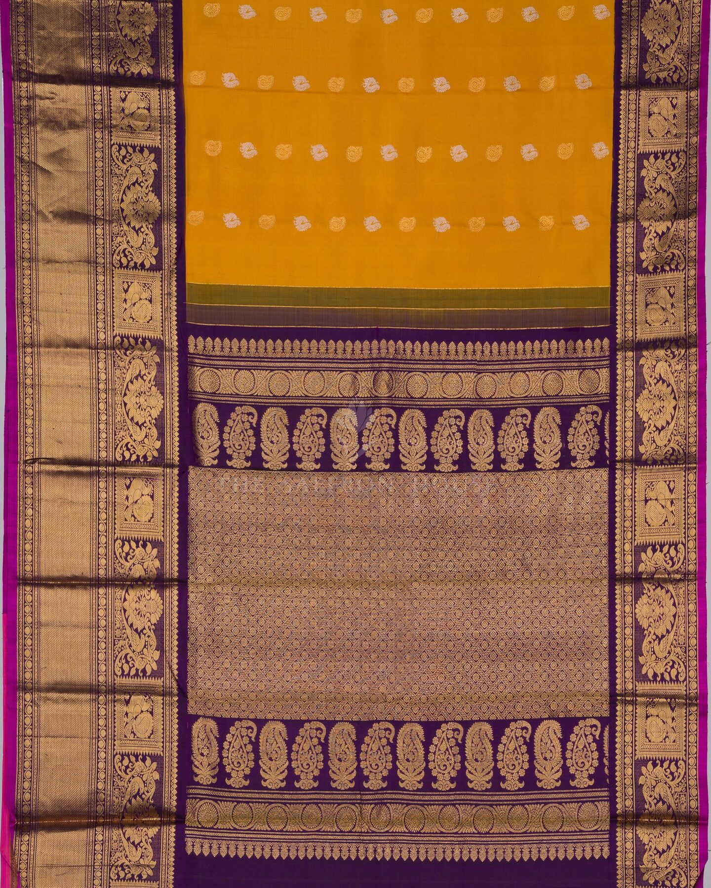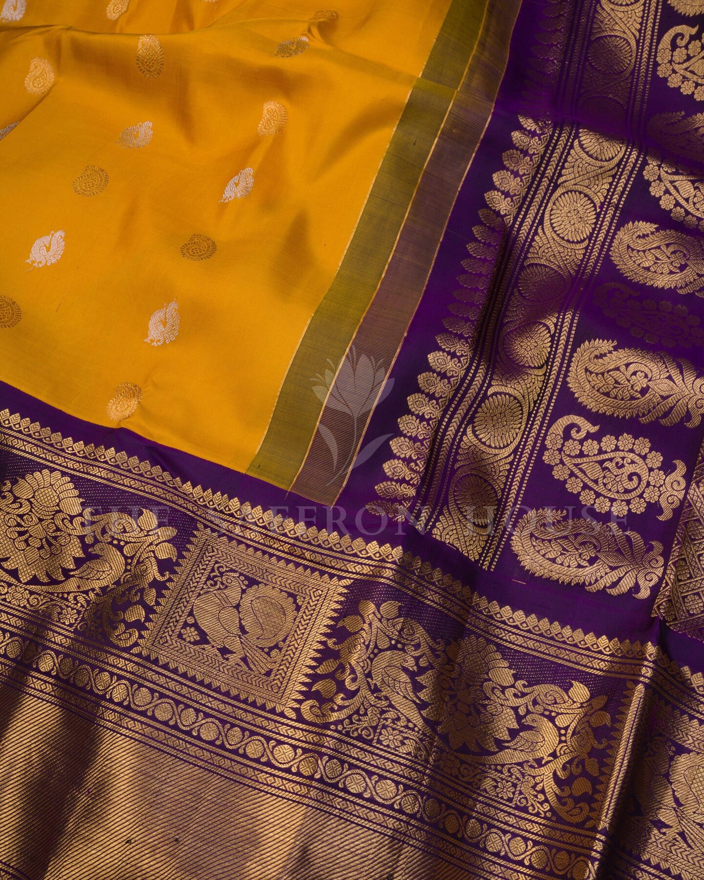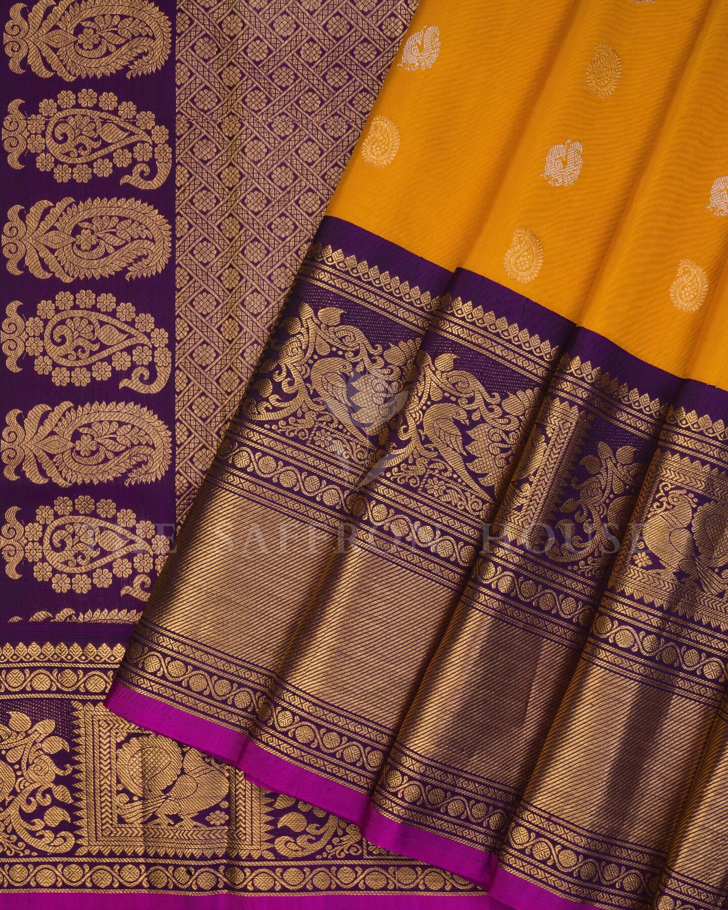 There is something about the interplay of mustard and yellow that feels both ancient and alive. This Handwoven Kanjivaram silk saree opens with radiant in its own quiet way, its surface shimmering with the unhurried rhythm of the loom.