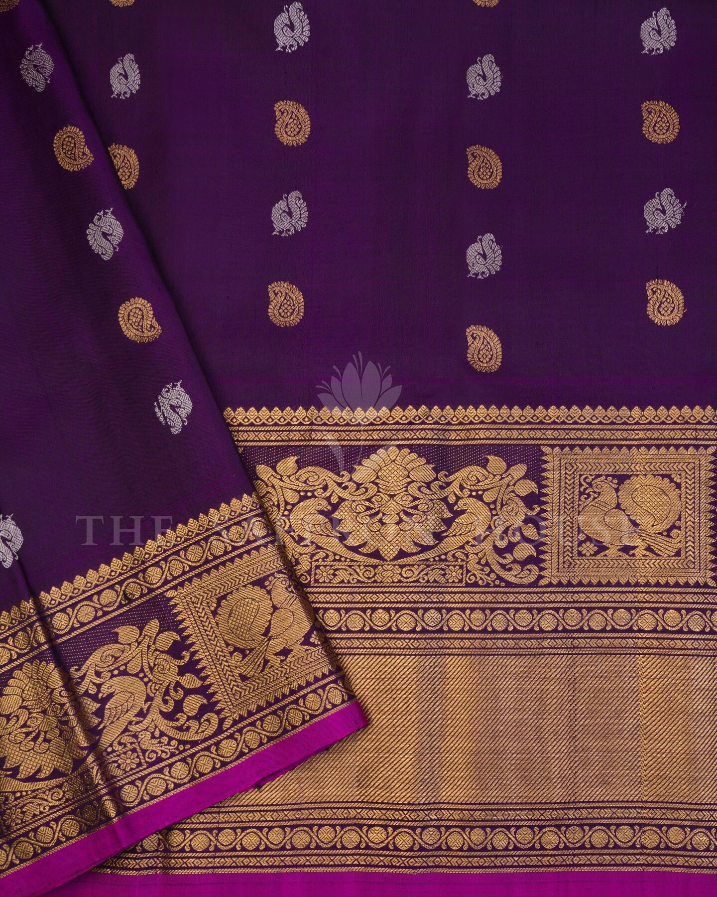 The body is woven with intricate traditional motifs, each thread placed with precision and purpose. A richly woven border frames the drape with confident definition, while gold zari runs through the weave, catching light the way temple gold does — slowly, deeply, unforgettably.