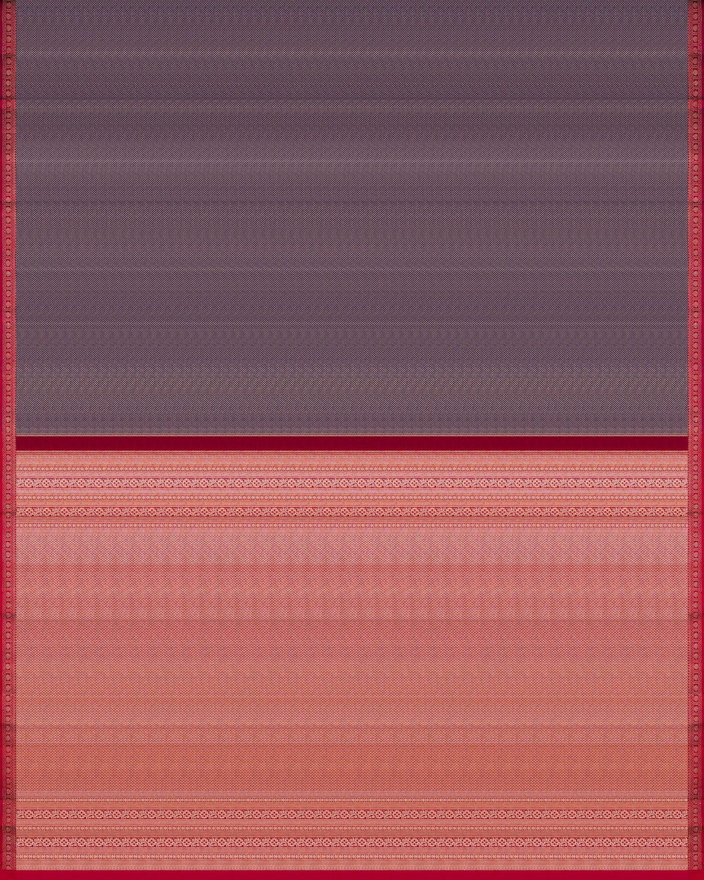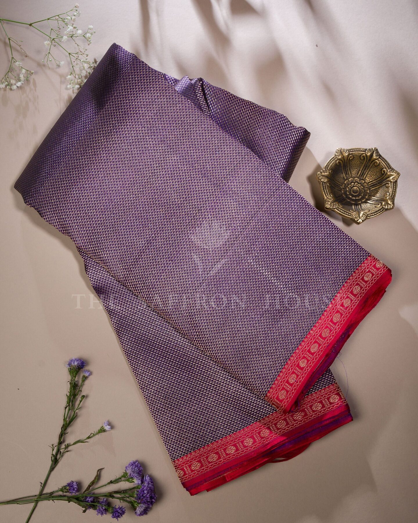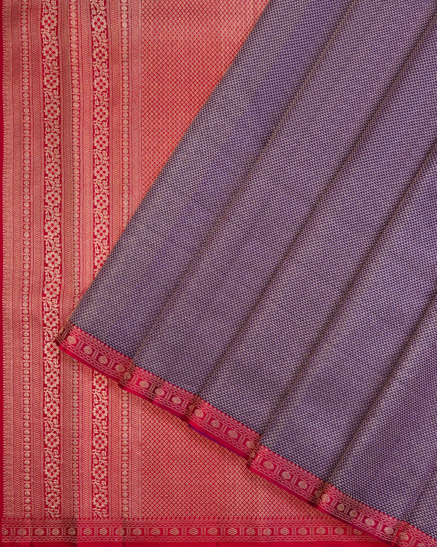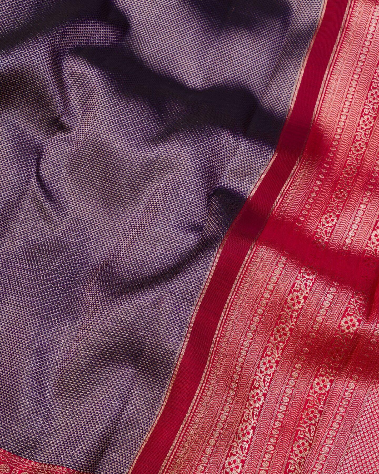 There is something about the interplay of purple and red that feels both ancient and alive. This Handwoven Kanjivaram silk saree opens with the hue of quiet royalty, its surface shimmering with the unhurried rhythm of the loom.