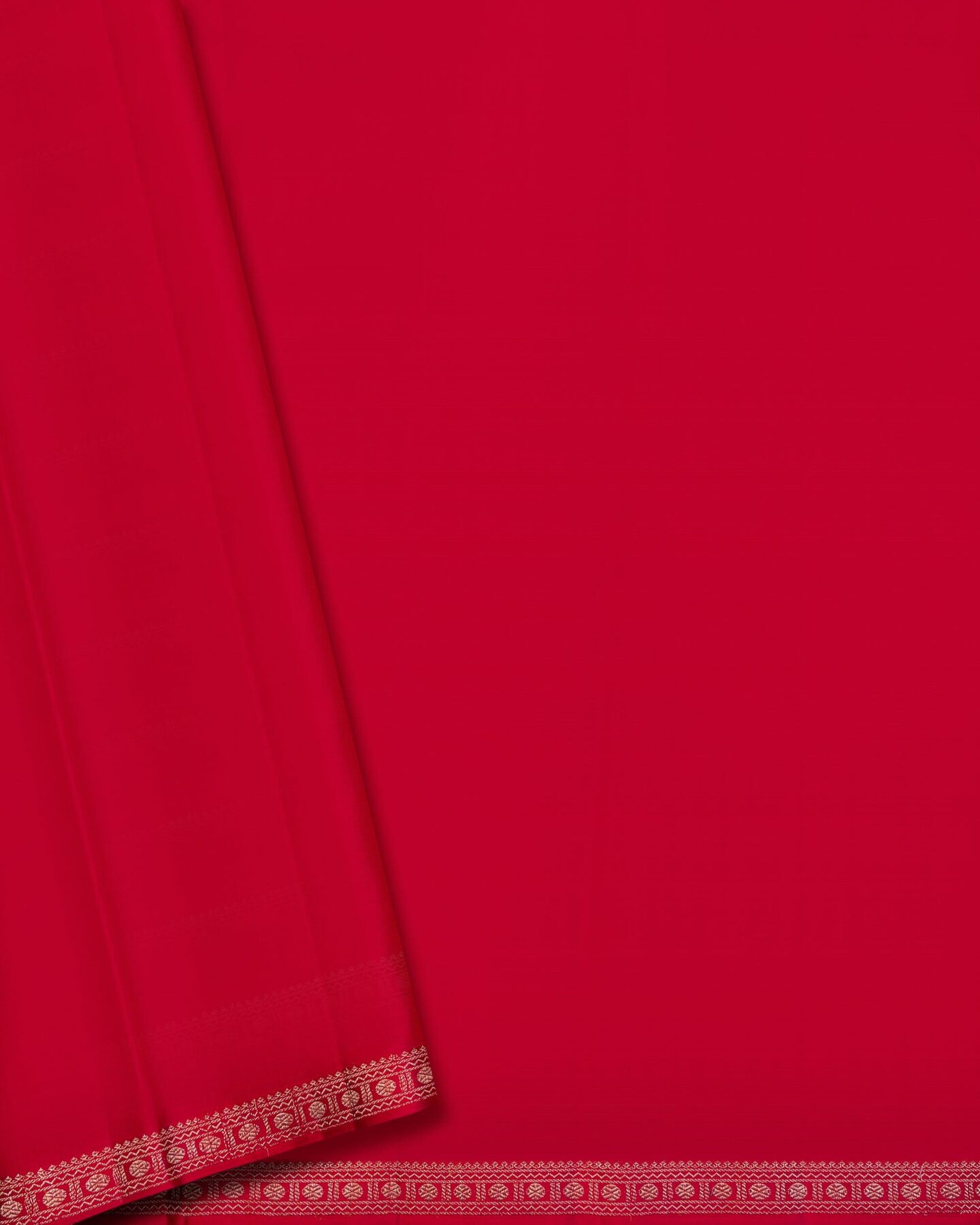 The body is woven with intricate traditional motifs, each thread placed with precision and purpose. A richly woven border frames the drape with confident definition, while gold zari runs through the weave, catching light the way temple gold does — slowly, deeply, unforgettably.