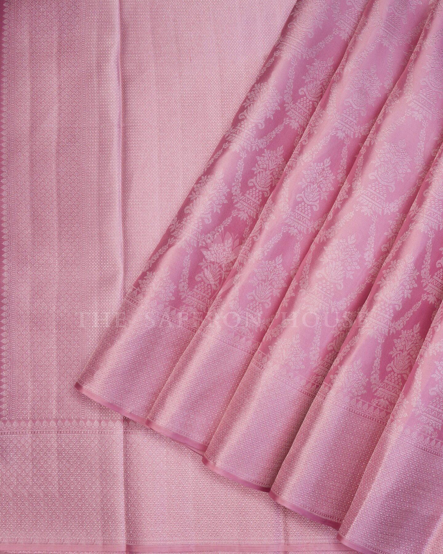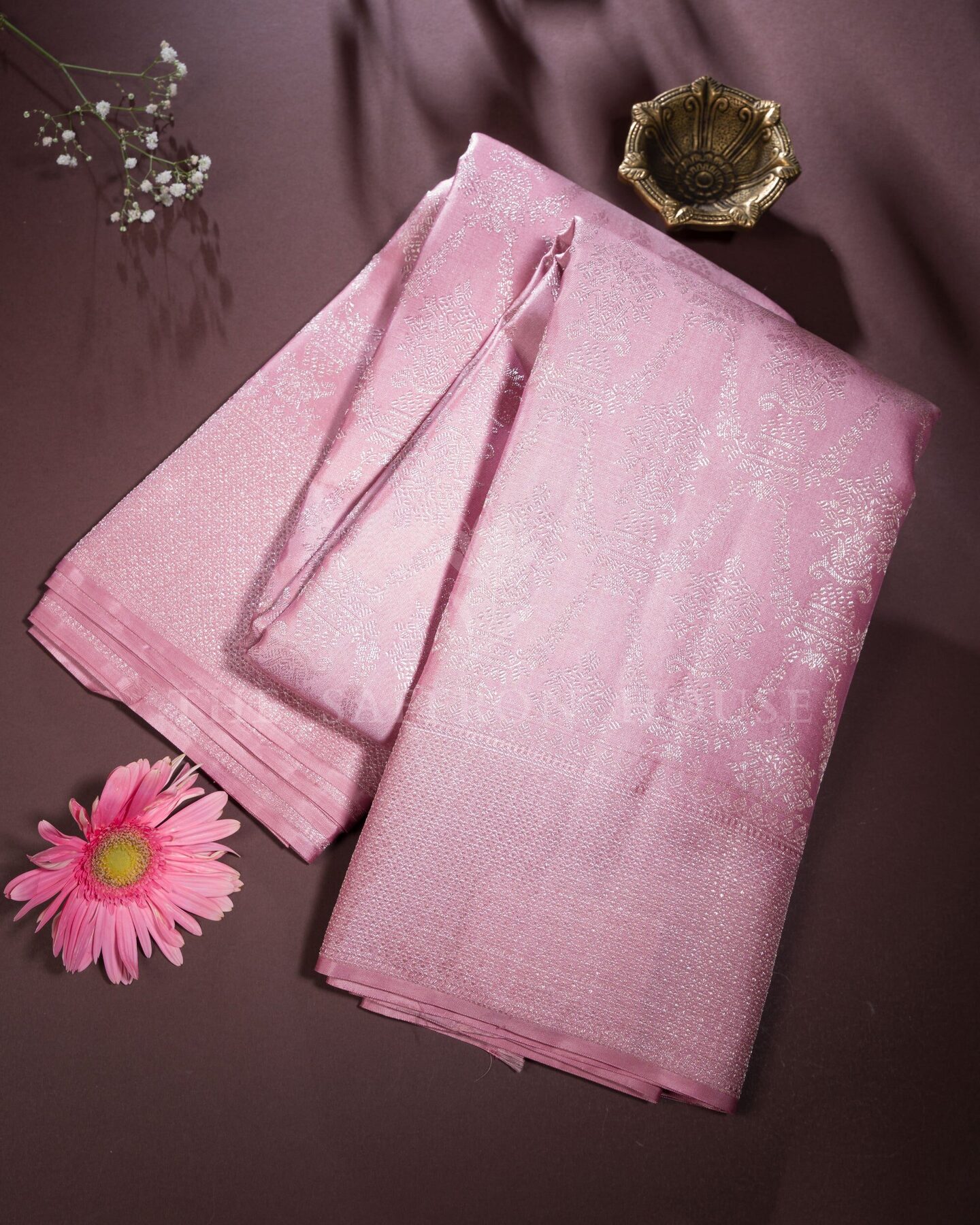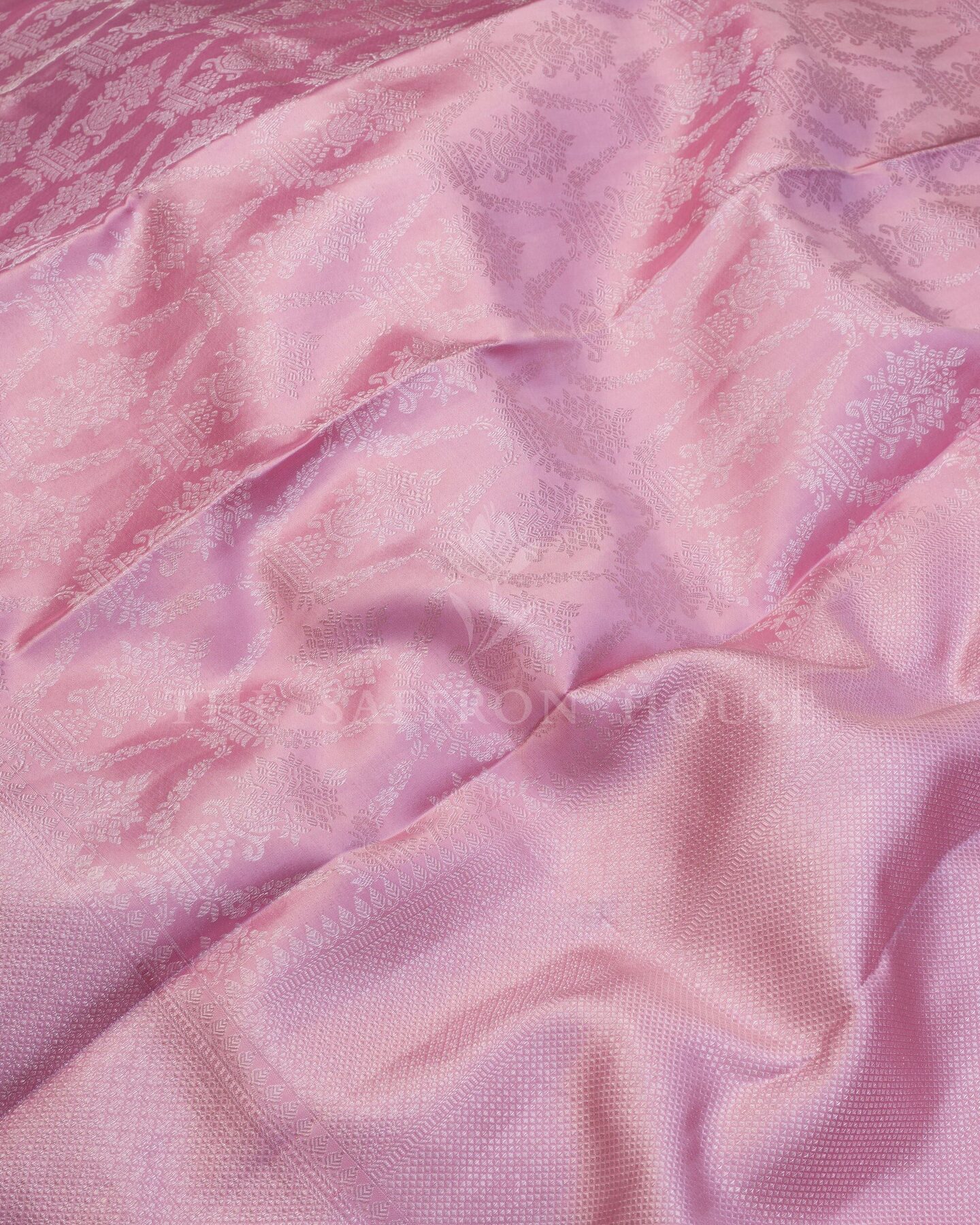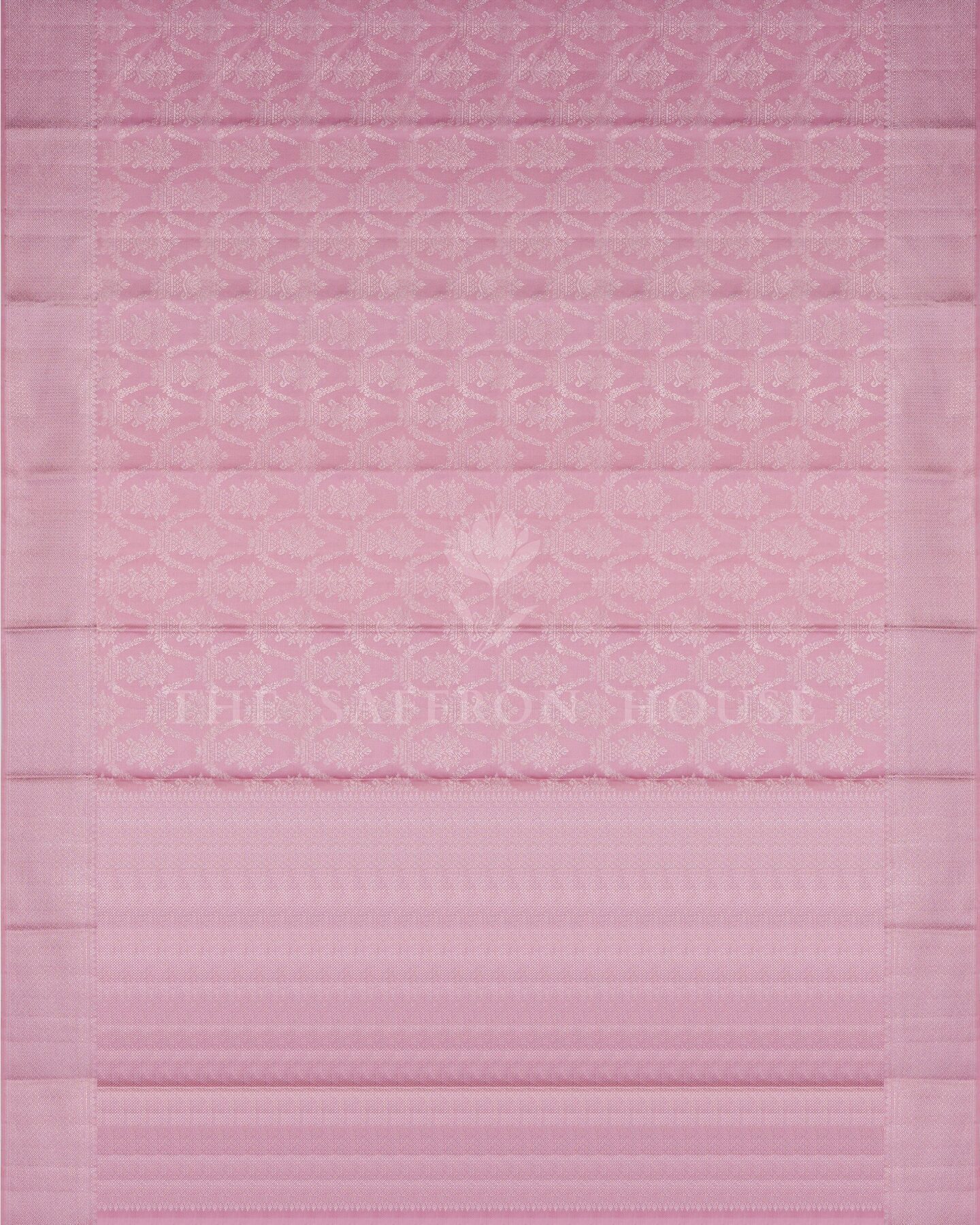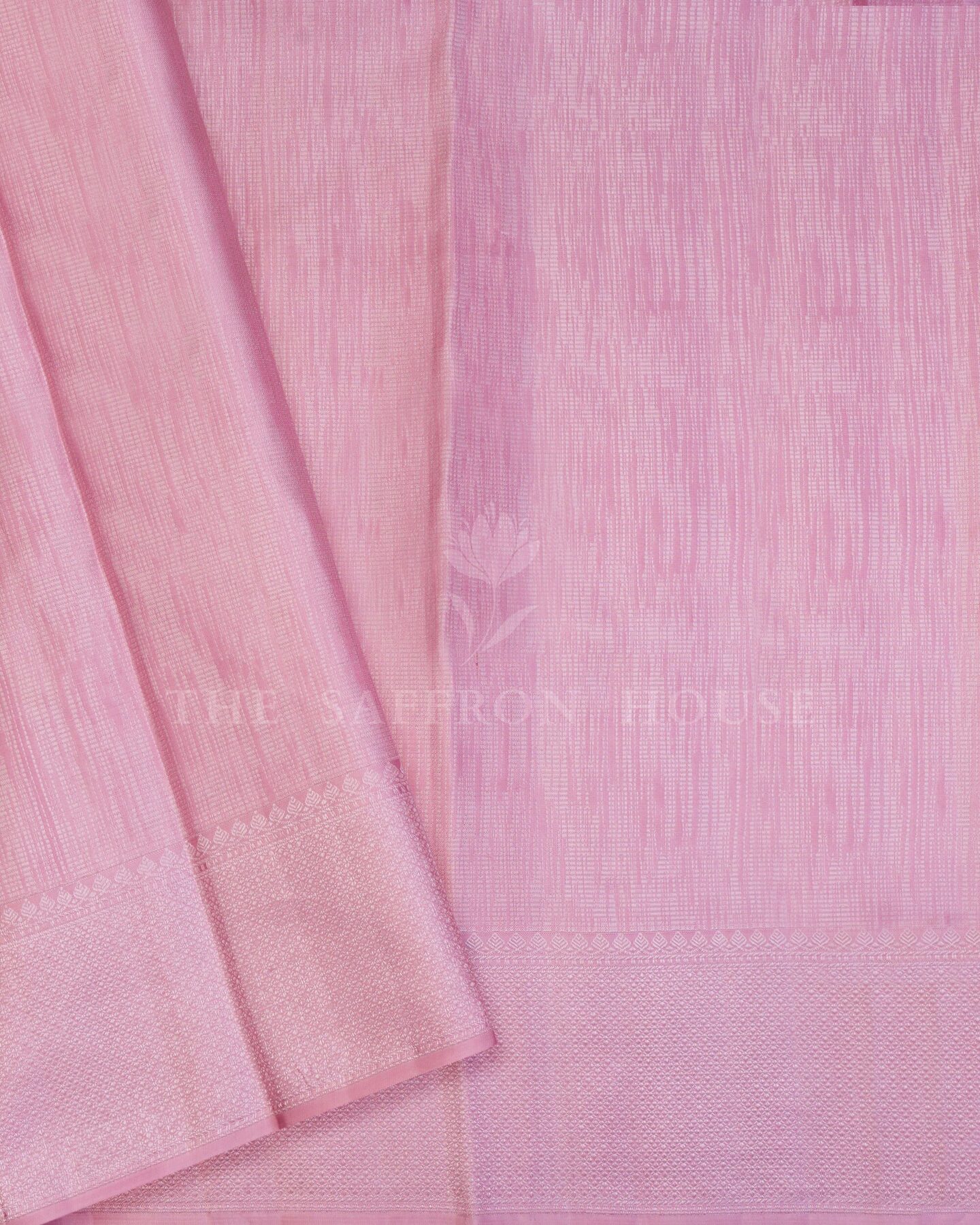 There is something about the interplay of blush pink and pink that feels both ancient and alive. This Handwoven Kanjivaram silk saree opens with radiant in its own quiet way, its surface shimmering with the unhurried rhythm of the loom.