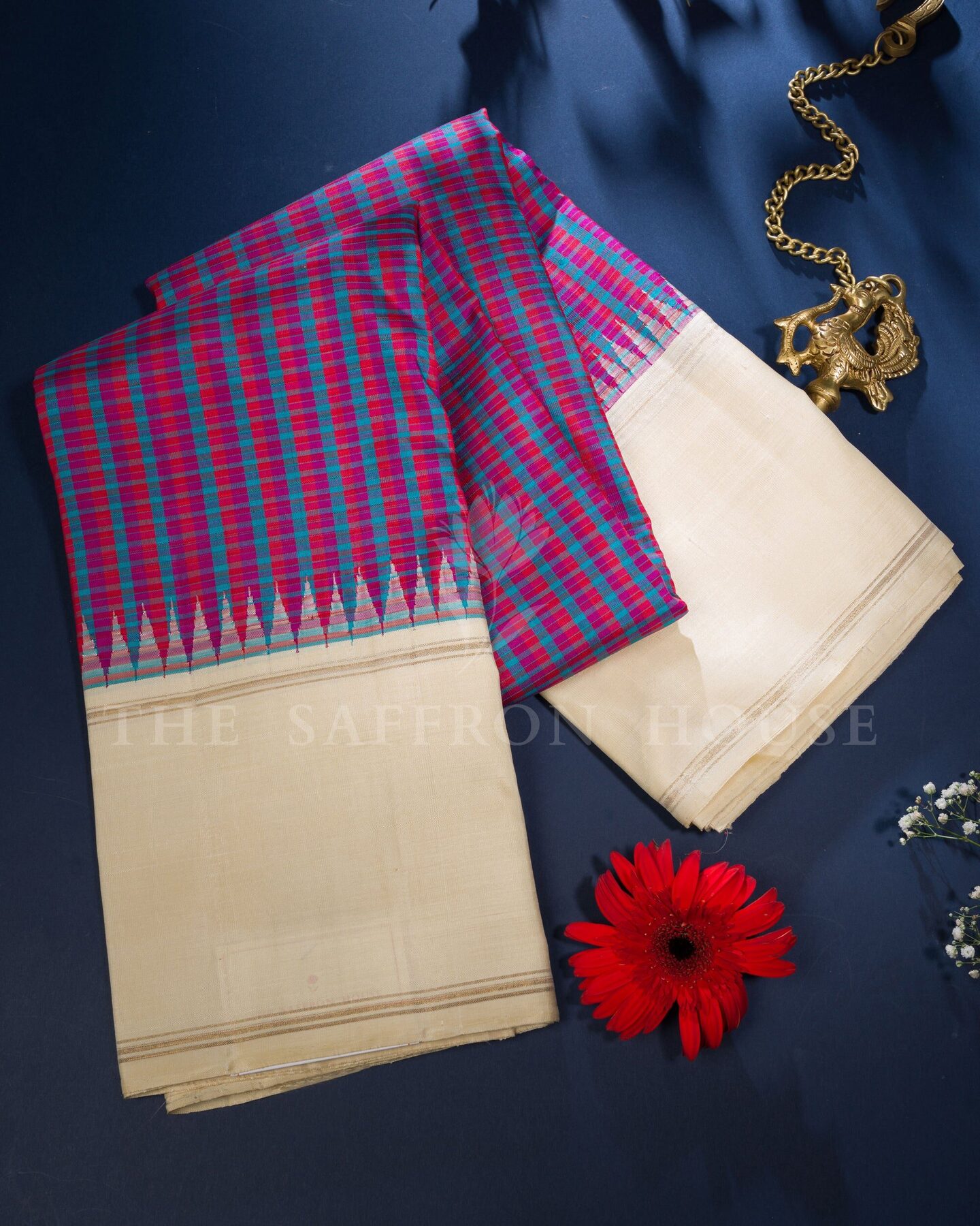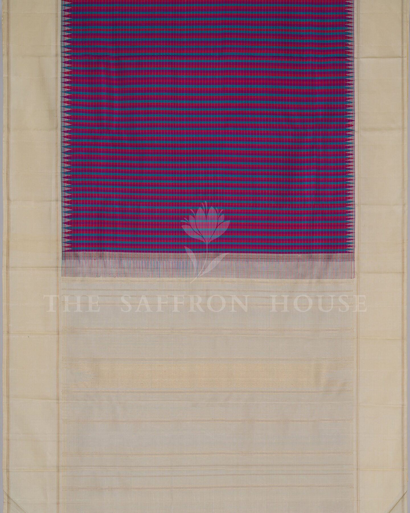 The body is woven with intricate traditional motifs, each thread placed with precision and purpose. A richly woven border frames the drape with confident definition, while silver zari runs through the weave, catching light the way temple gold does — slowly, deeply, unforgettably.