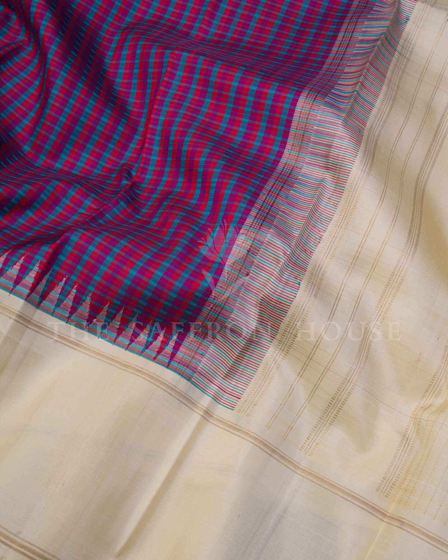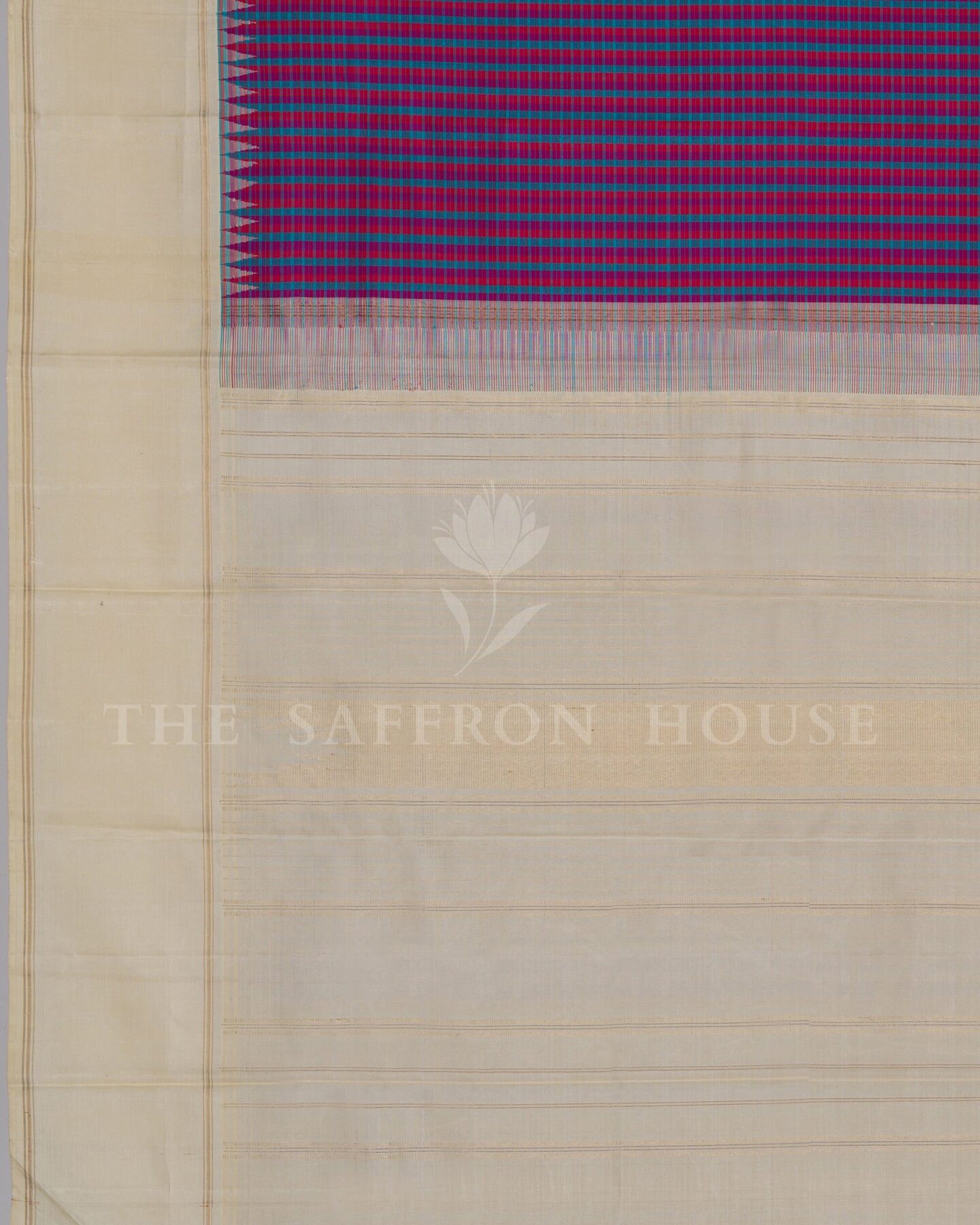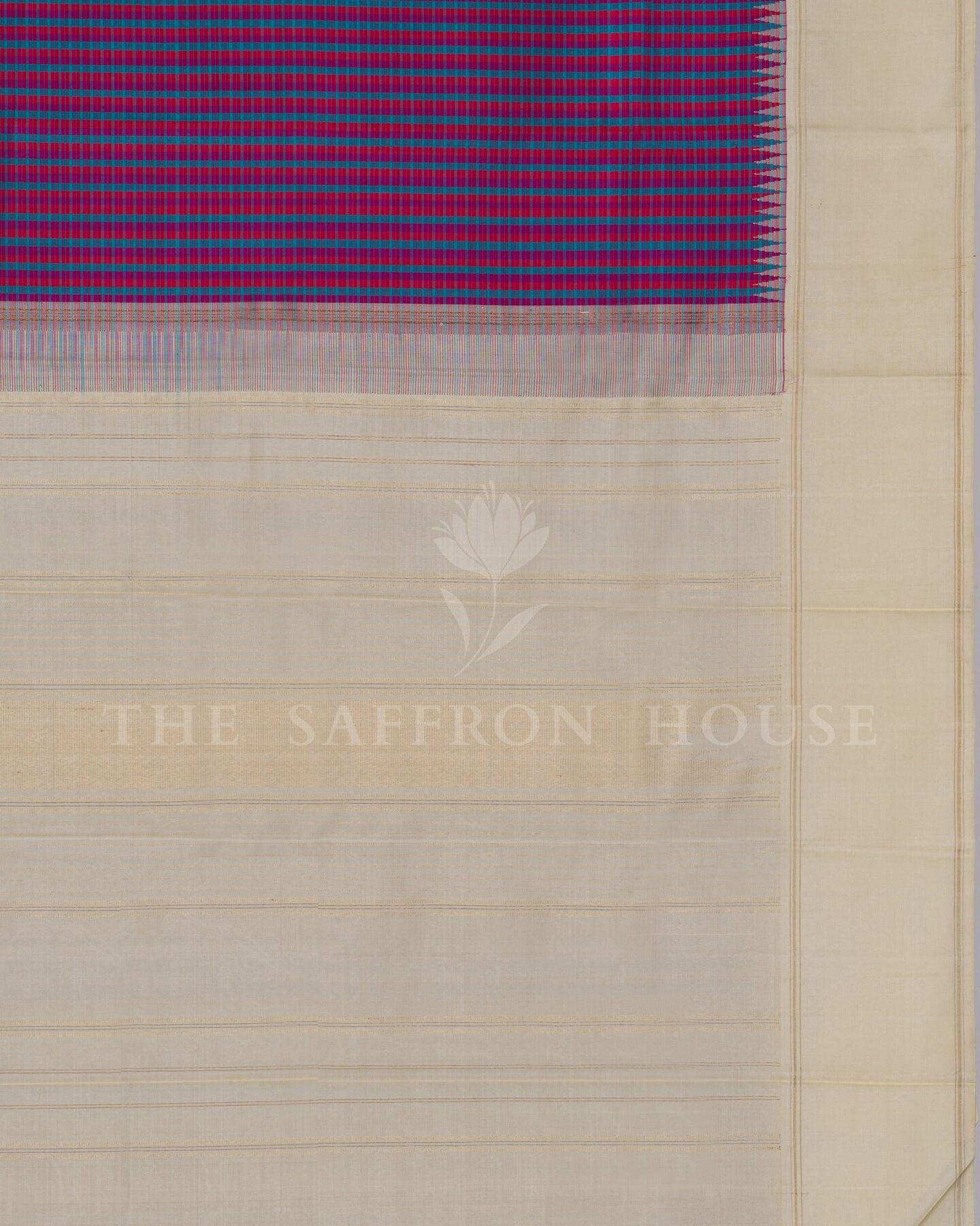 There is something about the interplay of off white and rani pink that feels both ancient and alive. This Korvai Kanjivaram silk saree opens with radiant in its own quiet way, its surface shimmering with the unhurried rhythm of the loom.