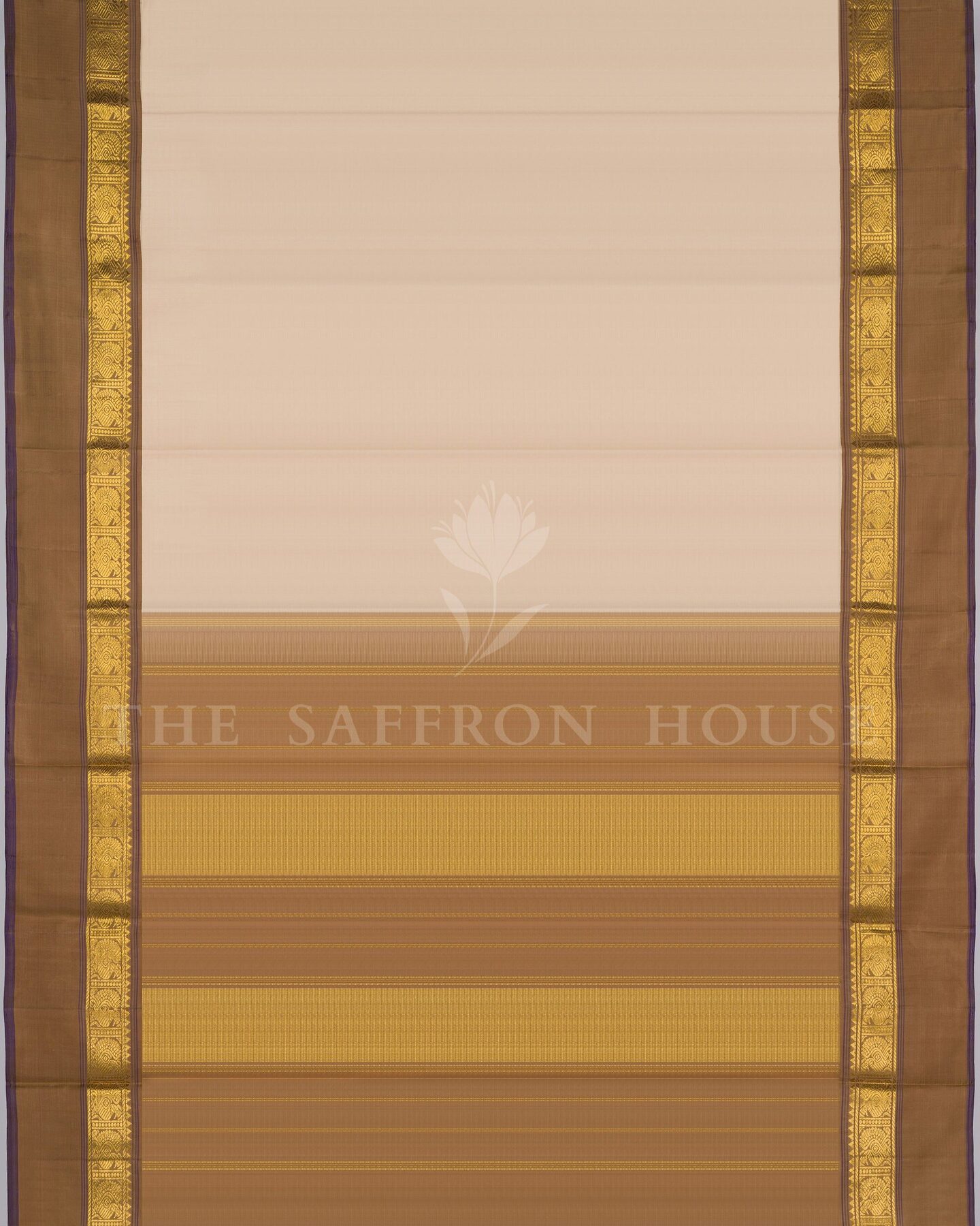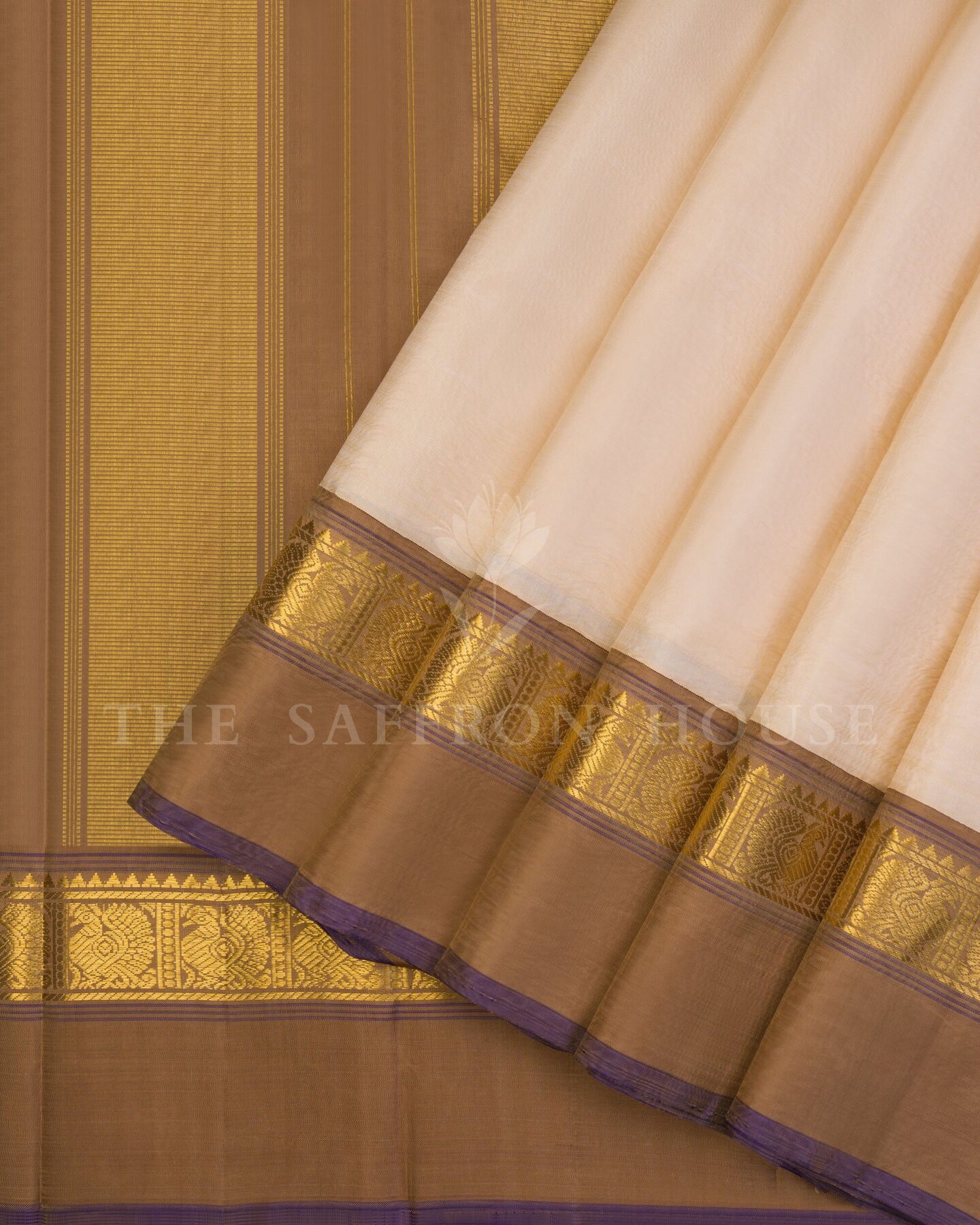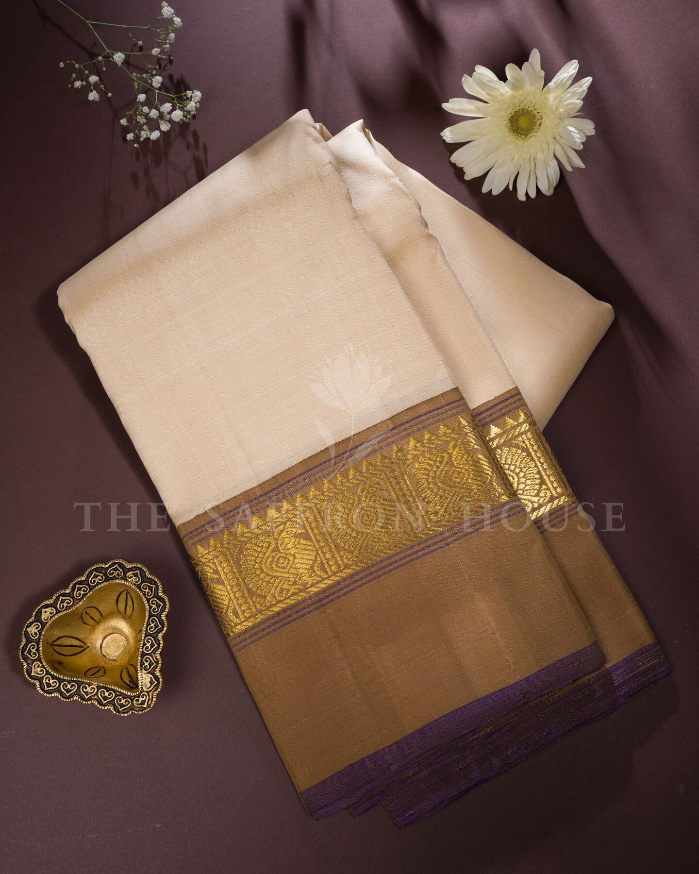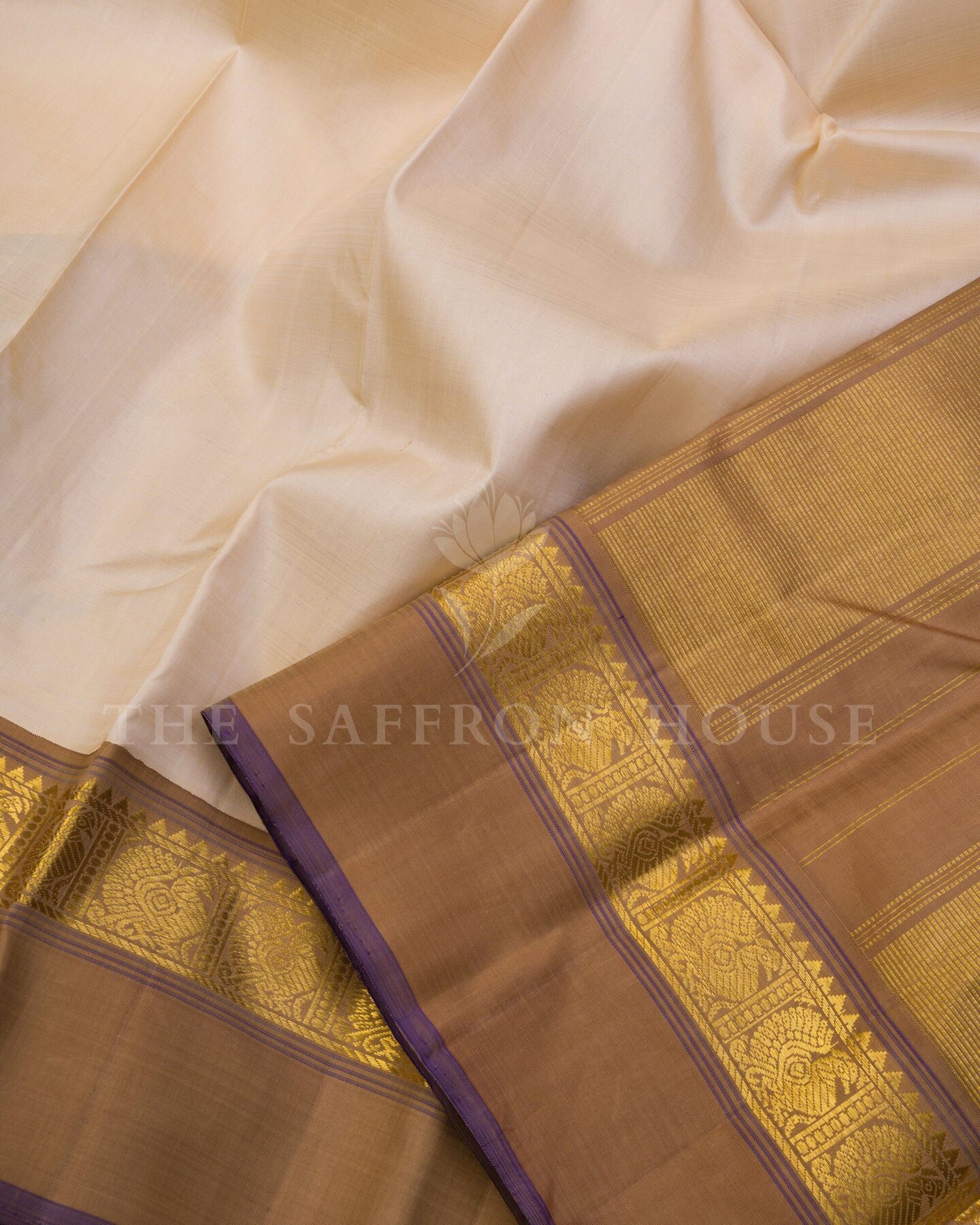 There is something about the interplay of ivory and beige that feels both ancient and alive. This Korvai Kanjivaram silk saree opens with timeless as heirloom milk silk, its surface shimmering with the unhurried rhythm of the loom.