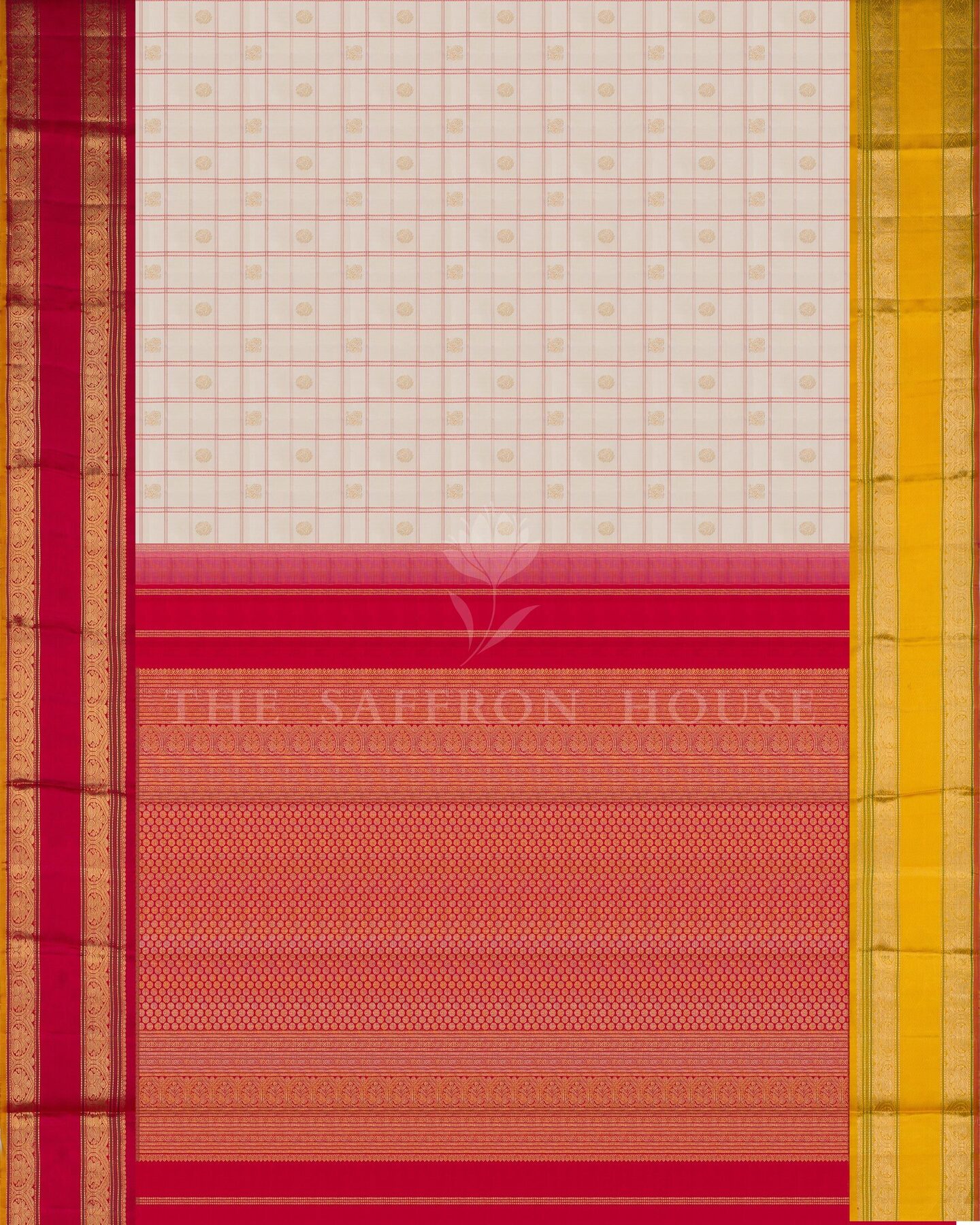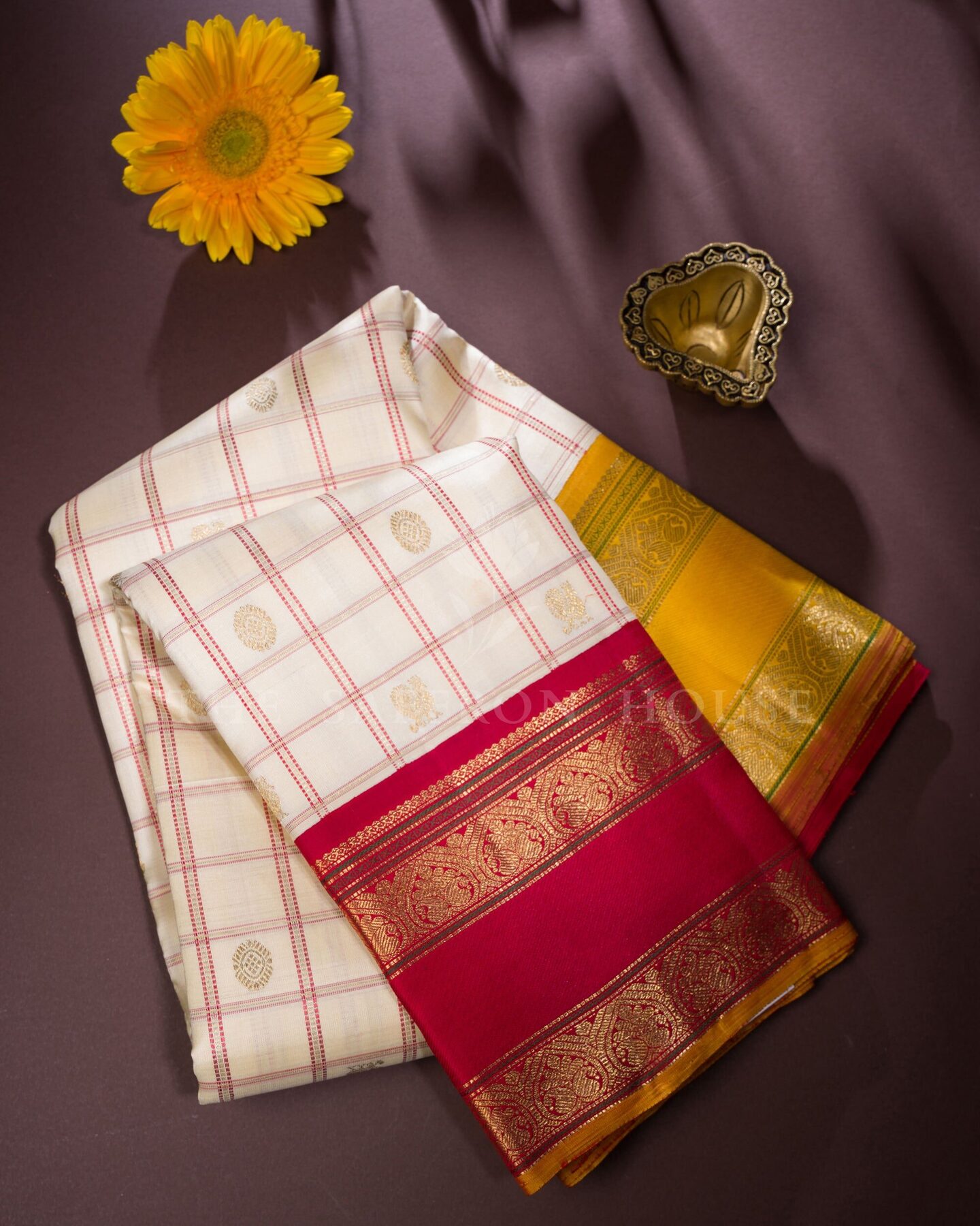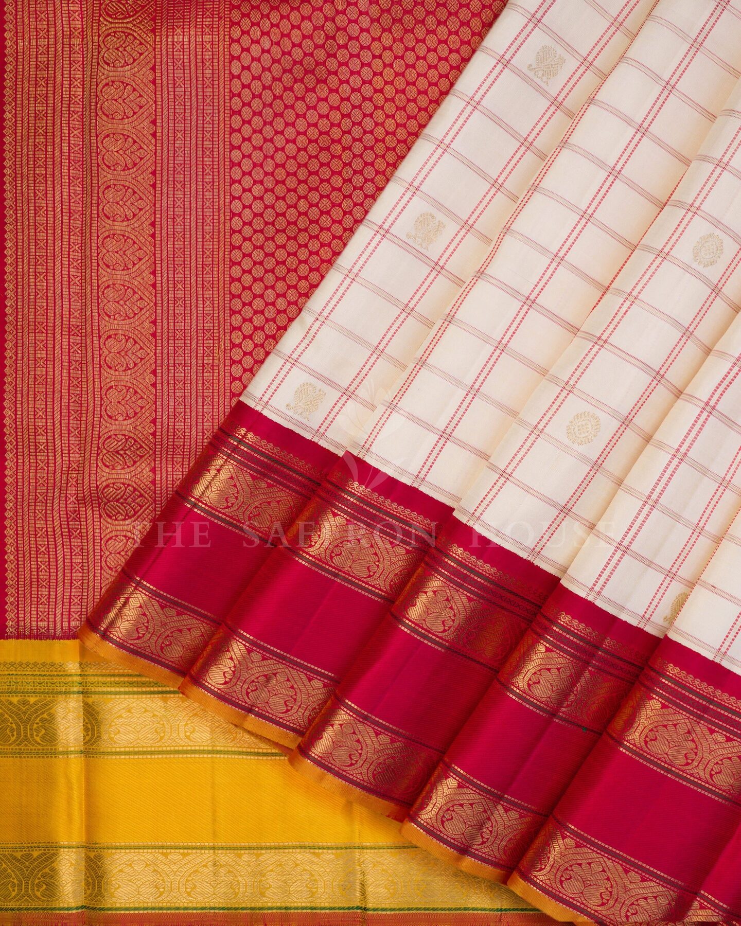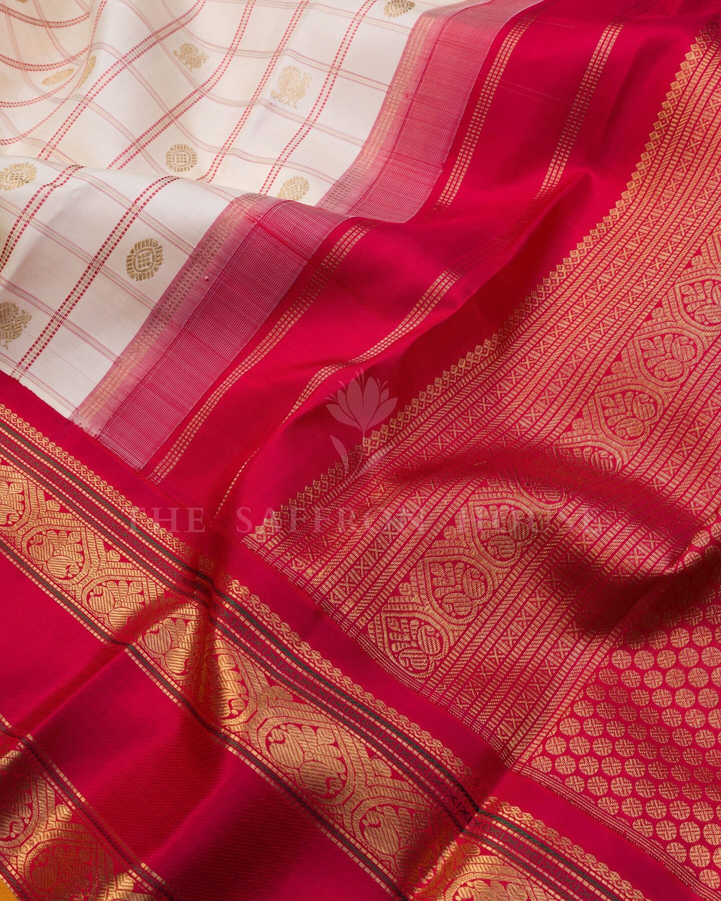 There is something about the interplay of off white and red that feels both ancient and alive. This Korvai Kanjivaram silk saree opens with radiant in its own quiet way, its surface shimmering with the unhurried rhythm of the loom.