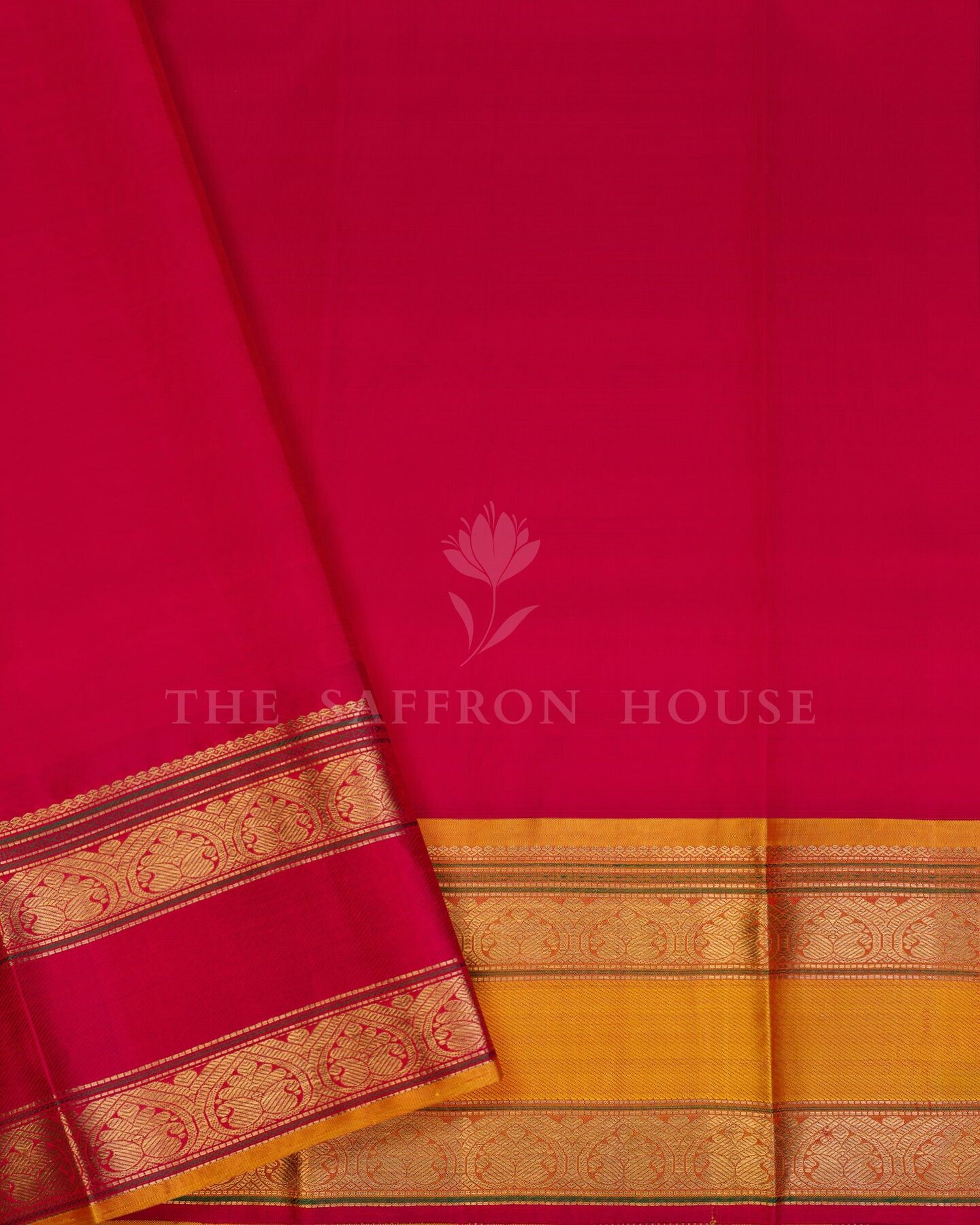 The body is woven with intricate traditional motifs, each thread placed with precision and purpose. A richly woven border frames the drape with confident definition, while gold zari runs through the weave, catching light the way temple gold does — slowly, deeply, unforgettably.