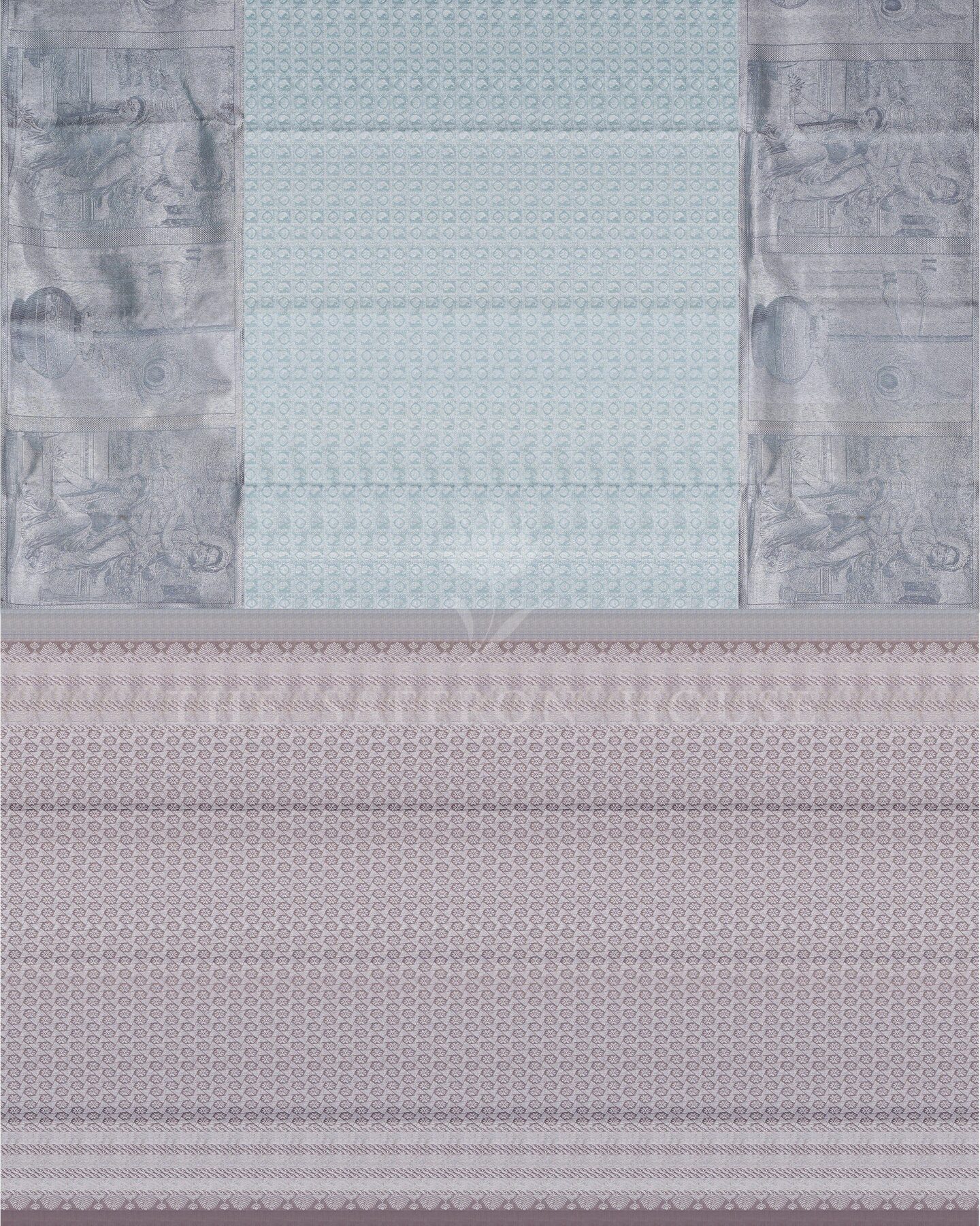 The body is woven with intricate traditional motifs, each thread placed with precision and purpose. A richly woven border frames the drape with confident definition, while silver zari runs through the weave, catching light the way temple gold does — slowly, deeply, unforgettably.