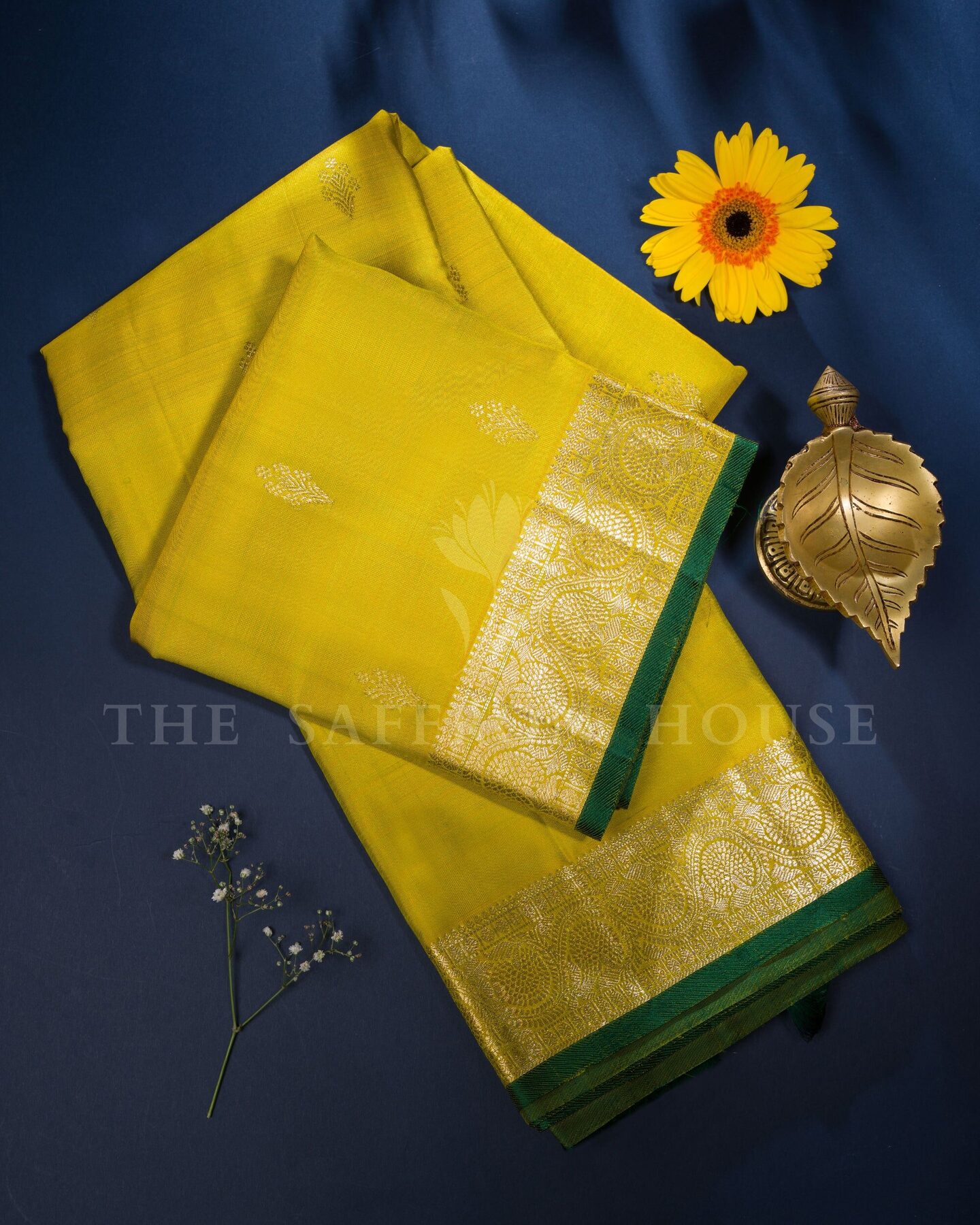 The body is woven with intricate traditional motifs, each thread placed with precision and purpose. A richly woven border frames the drape with confident definition, while gold zari runs through the weave, catching light the way temple gold does — slowly, deeply, unforgettably.