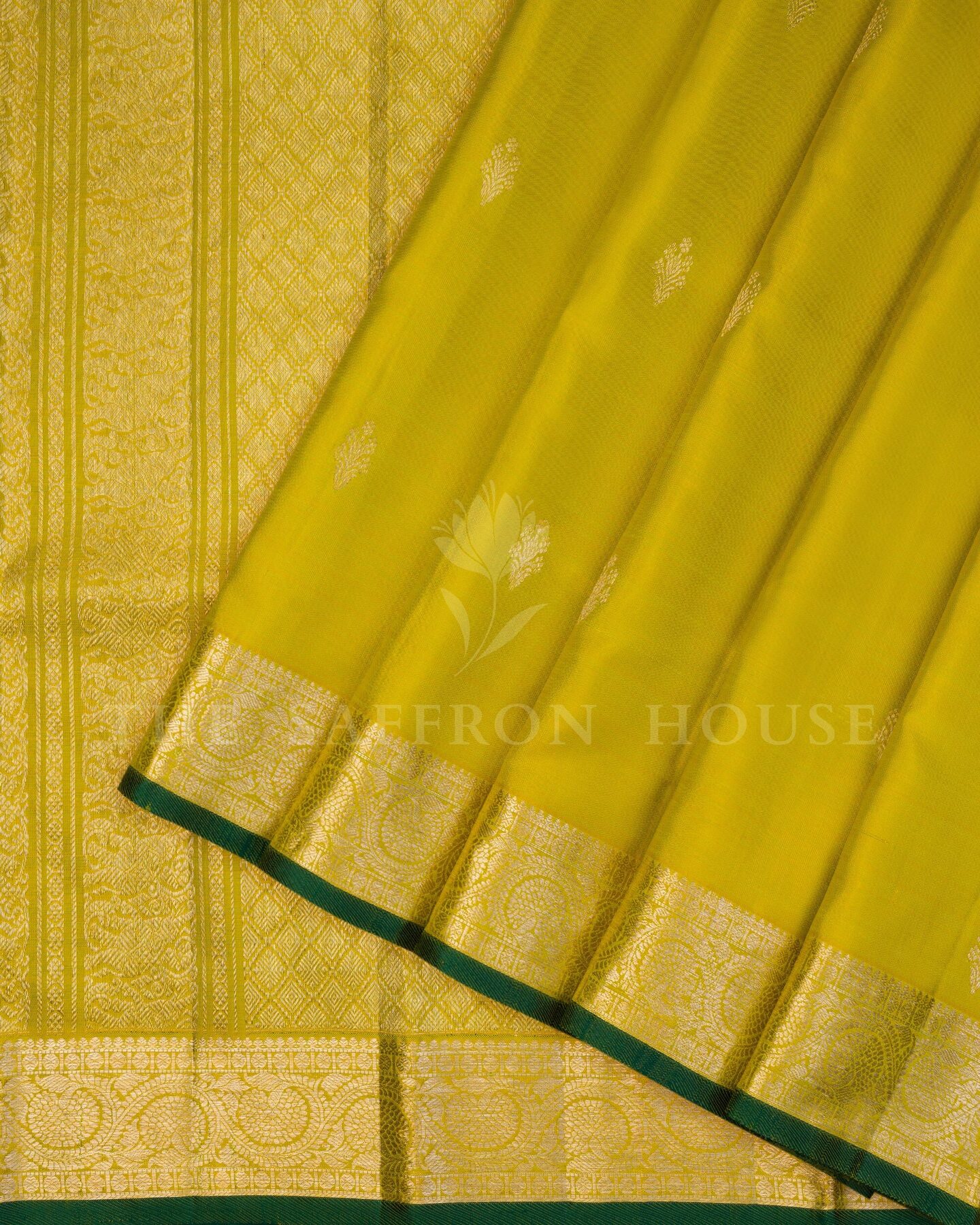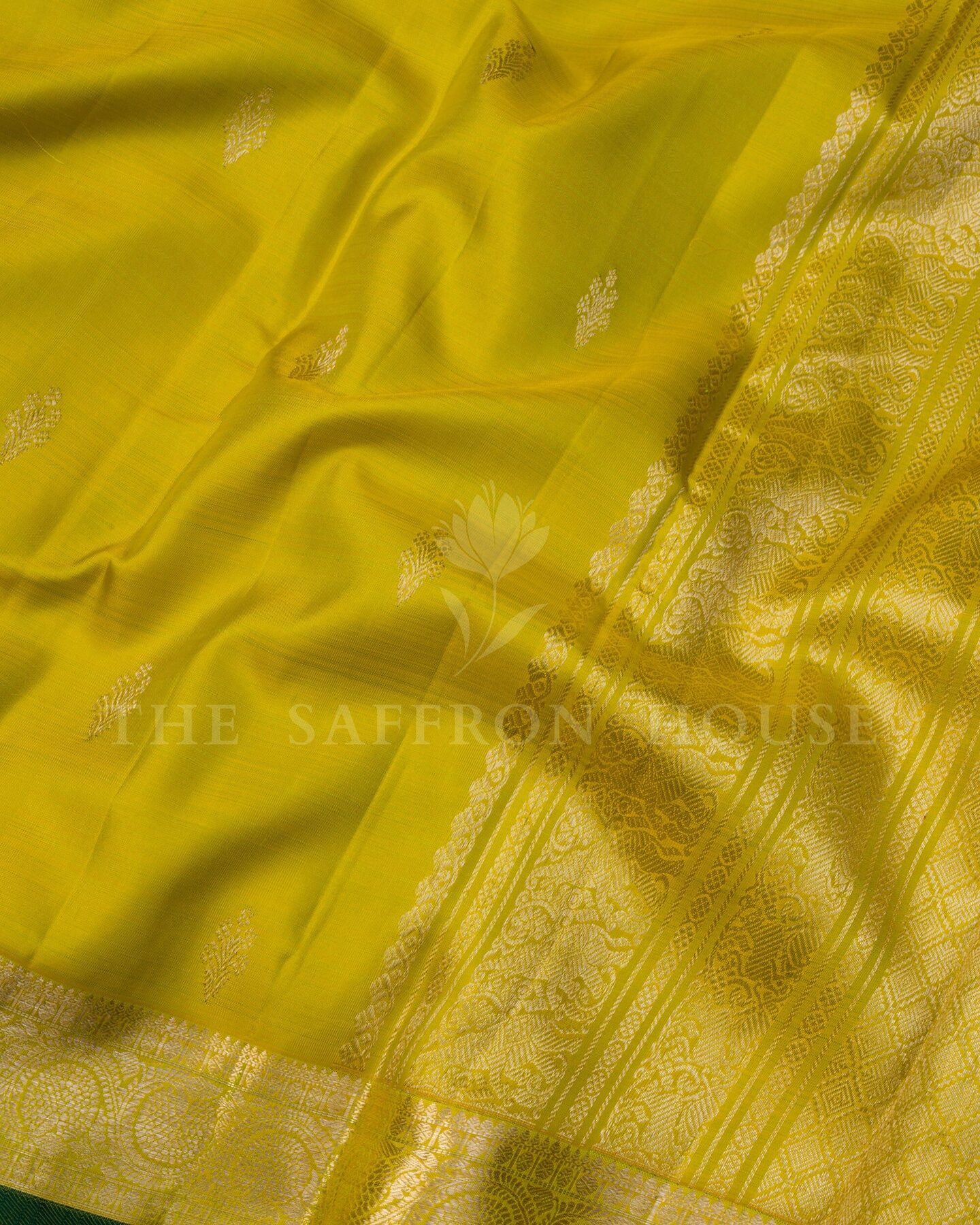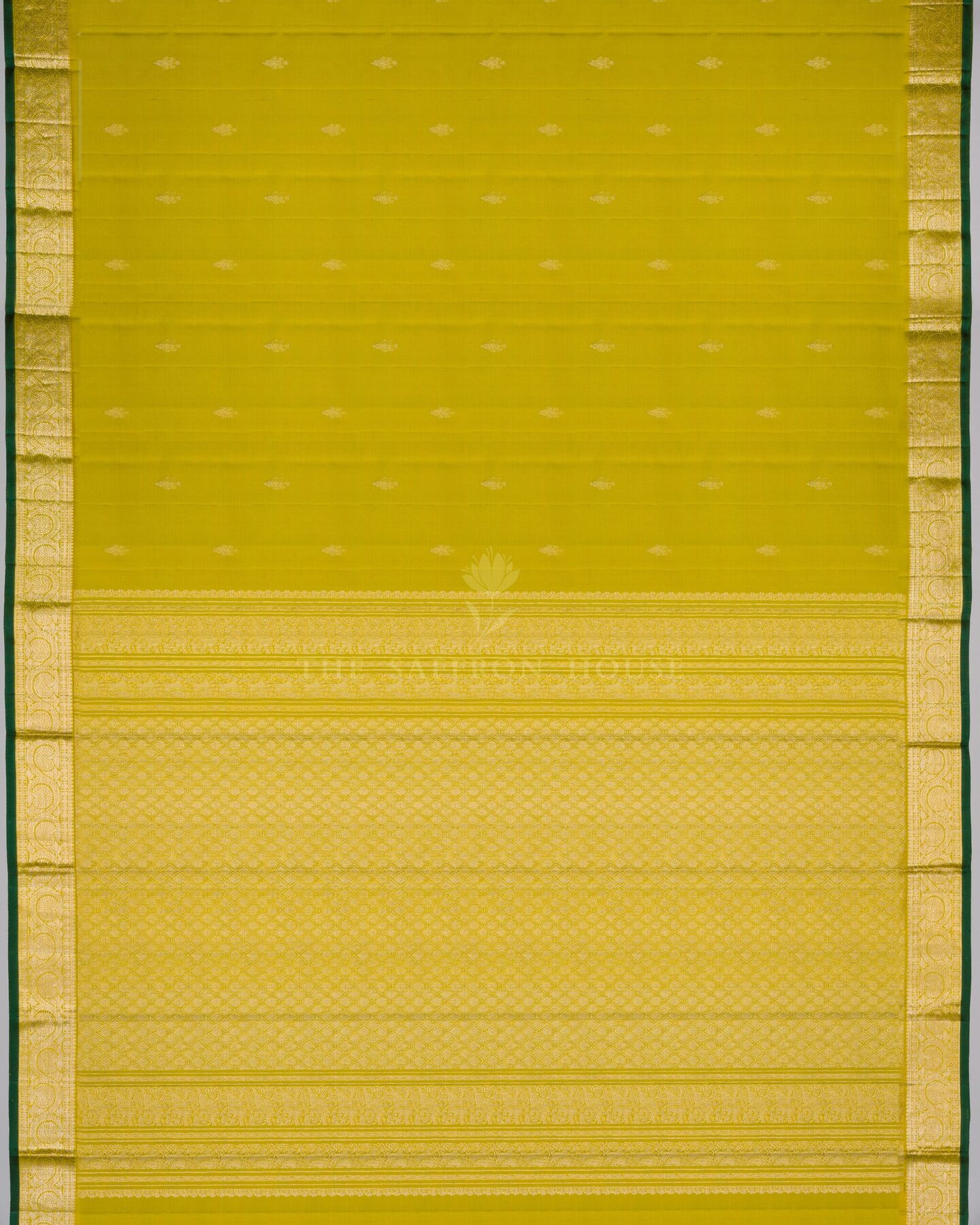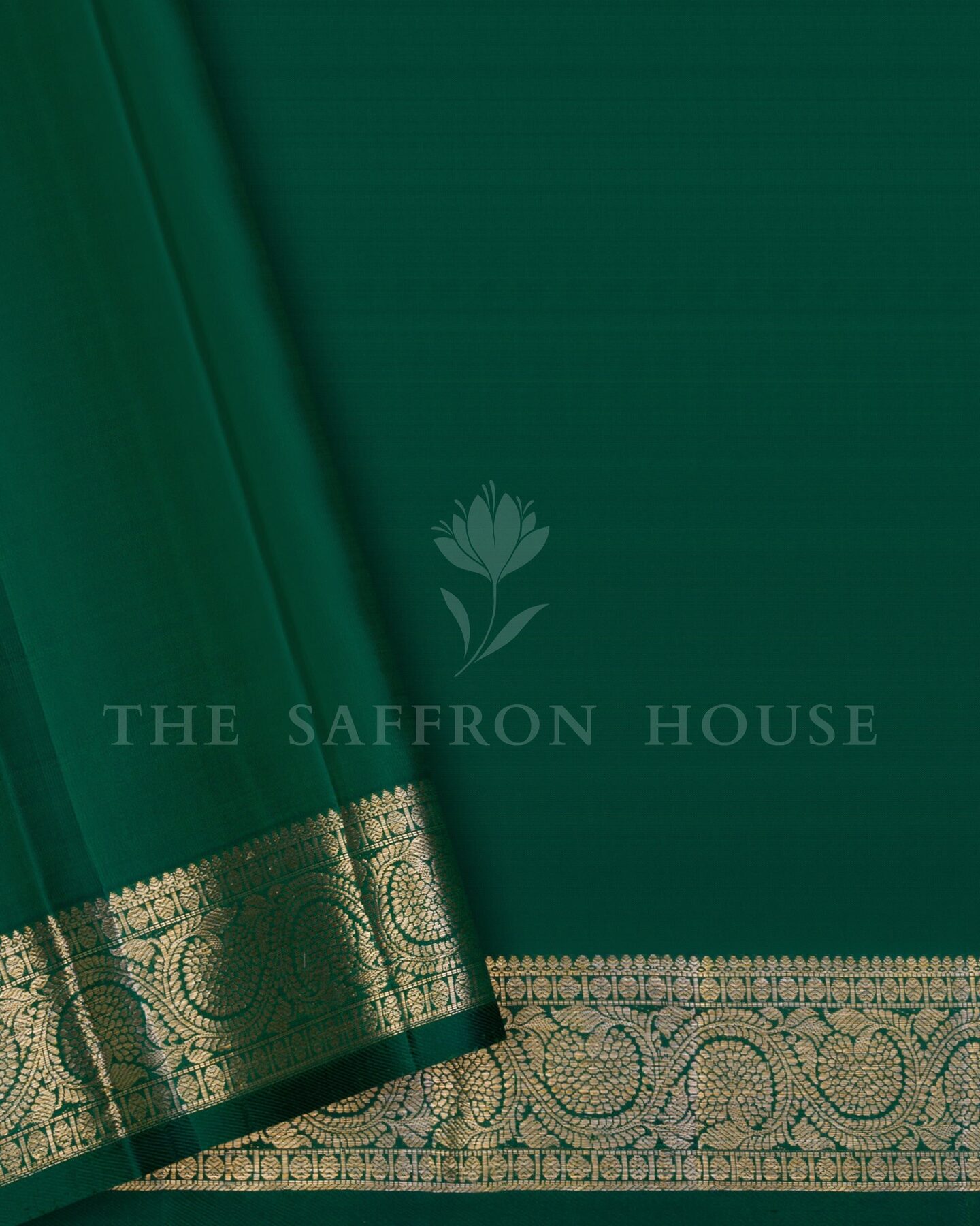 Some colours hold memory. Green — lush as the first rains on paddy fields — becomes something entirely new when woven into pure Kanjivaram silk. This Handwoven saree carries that colour with quiet authority and grace.