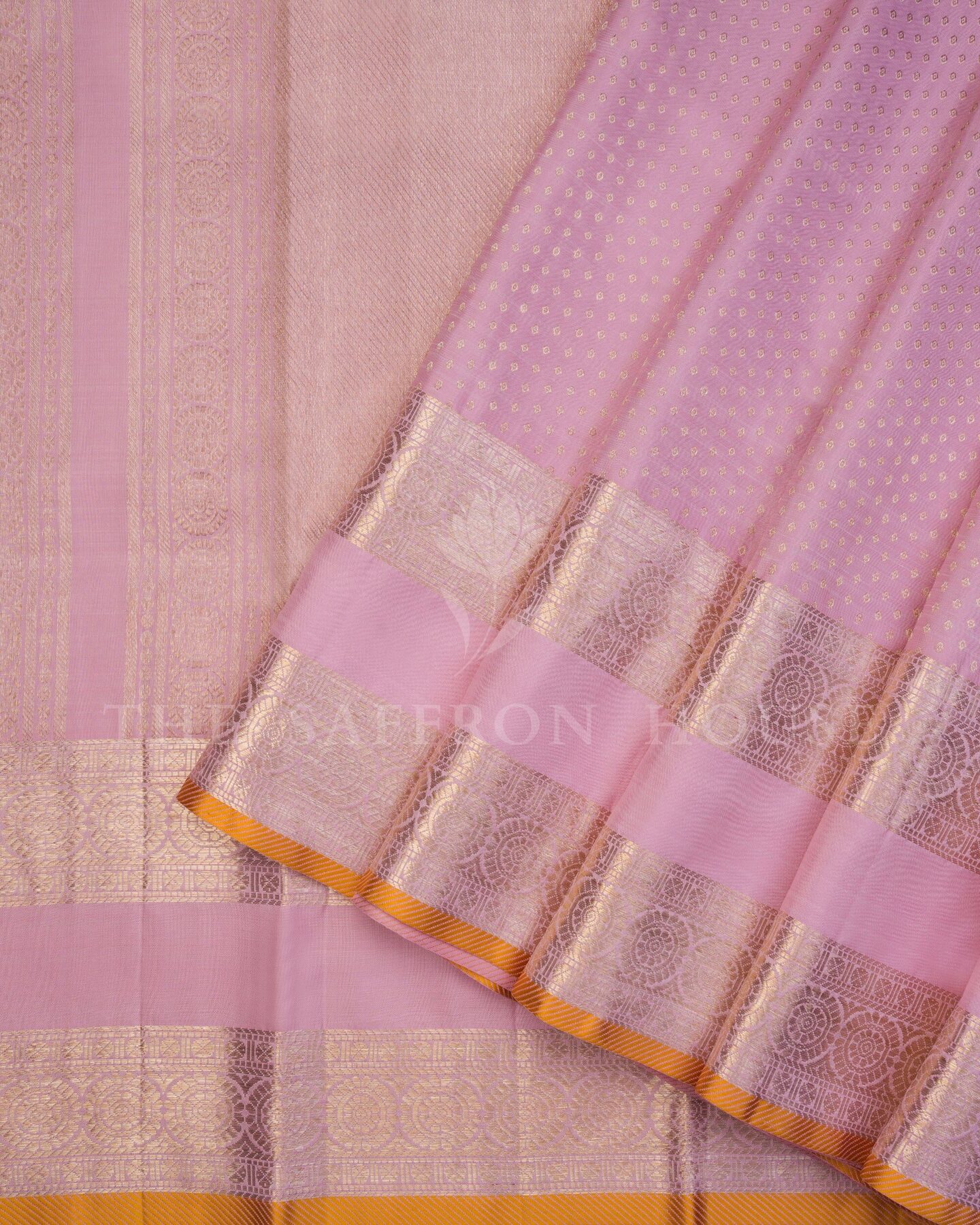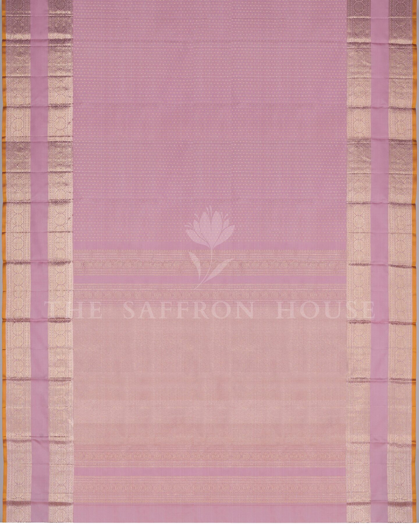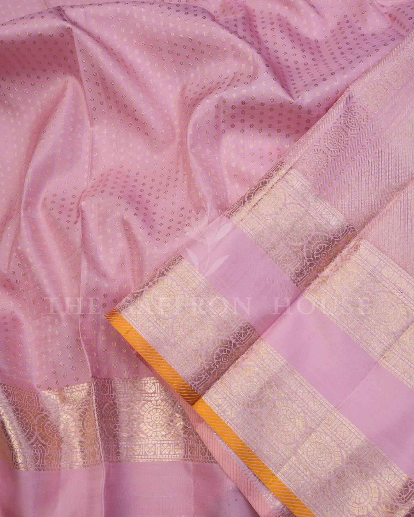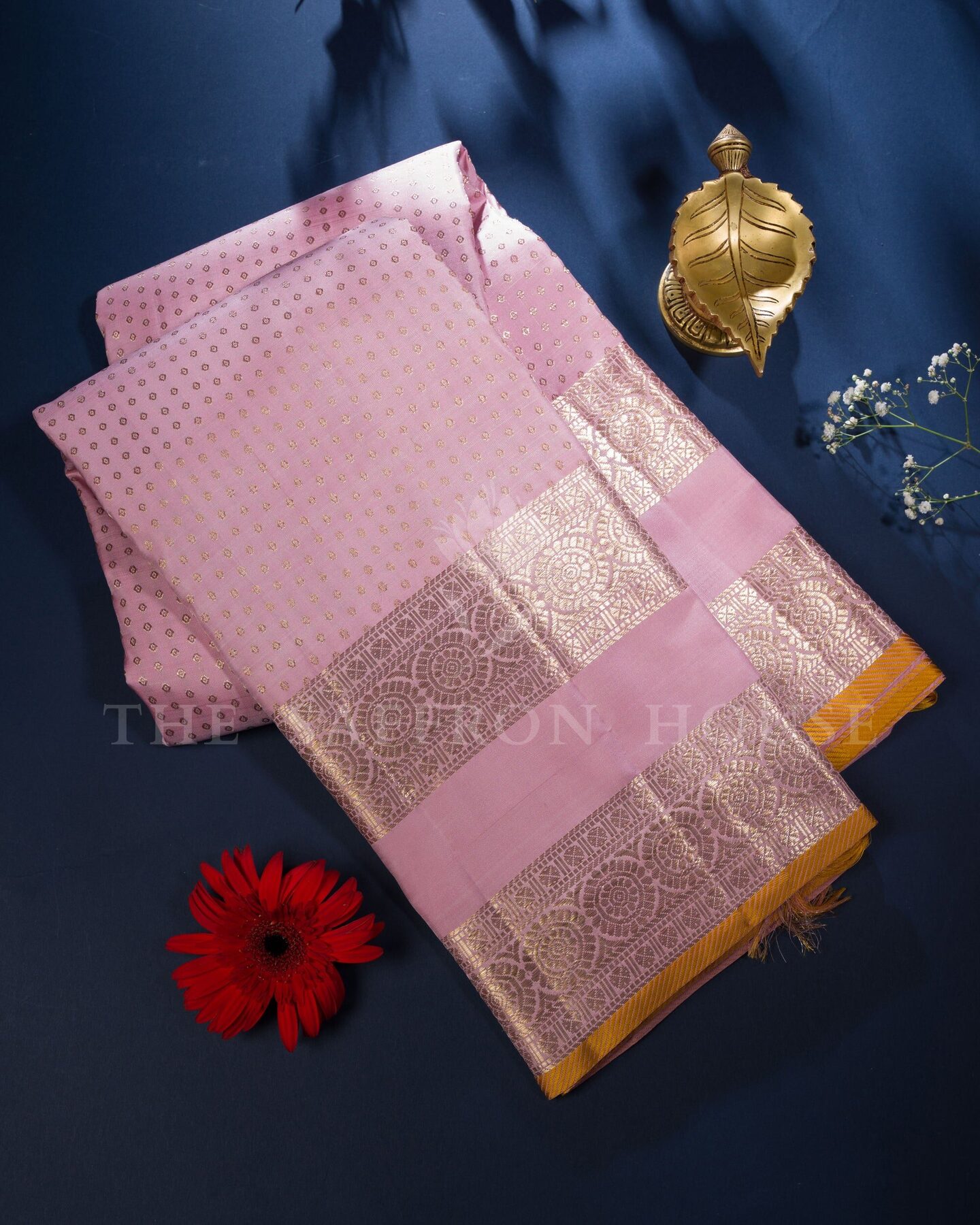 There is something about the interplay of rose and rose pink that feels both ancient and alive. This Handwoven Kanjivaram silk saree opens with radiant in its own quiet way, its surface shimmering with the unhurried rhythm of the loom.