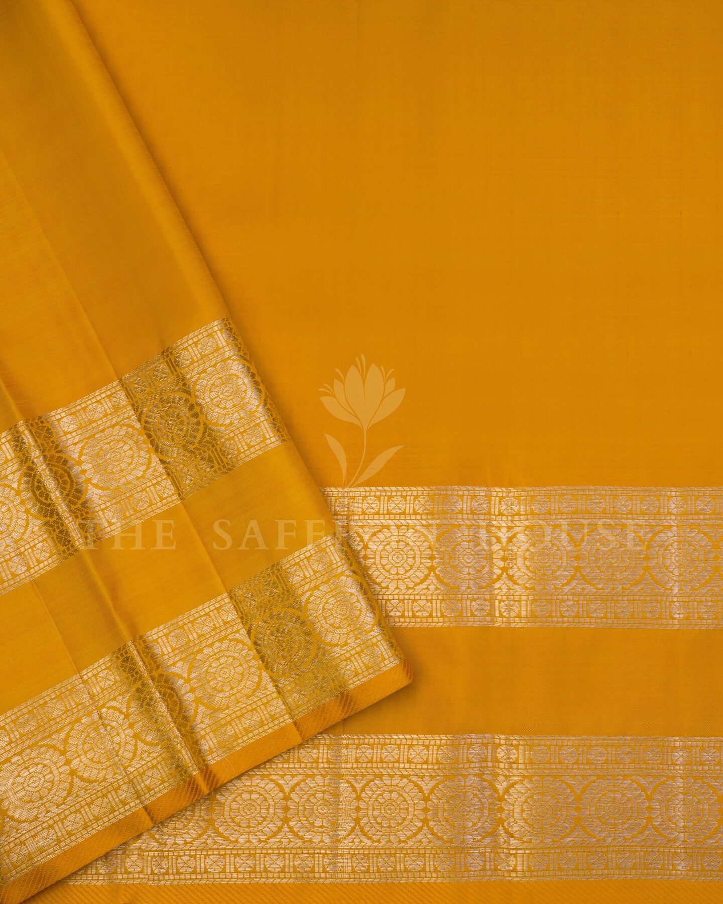 The body is woven with intricate traditional motifs, each thread placed with precision and purpose. A richly woven border frames the drape with confident definition, while gold zari runs through the weave, catching light the way temple gold does — slowly, deeply, unforgettably.