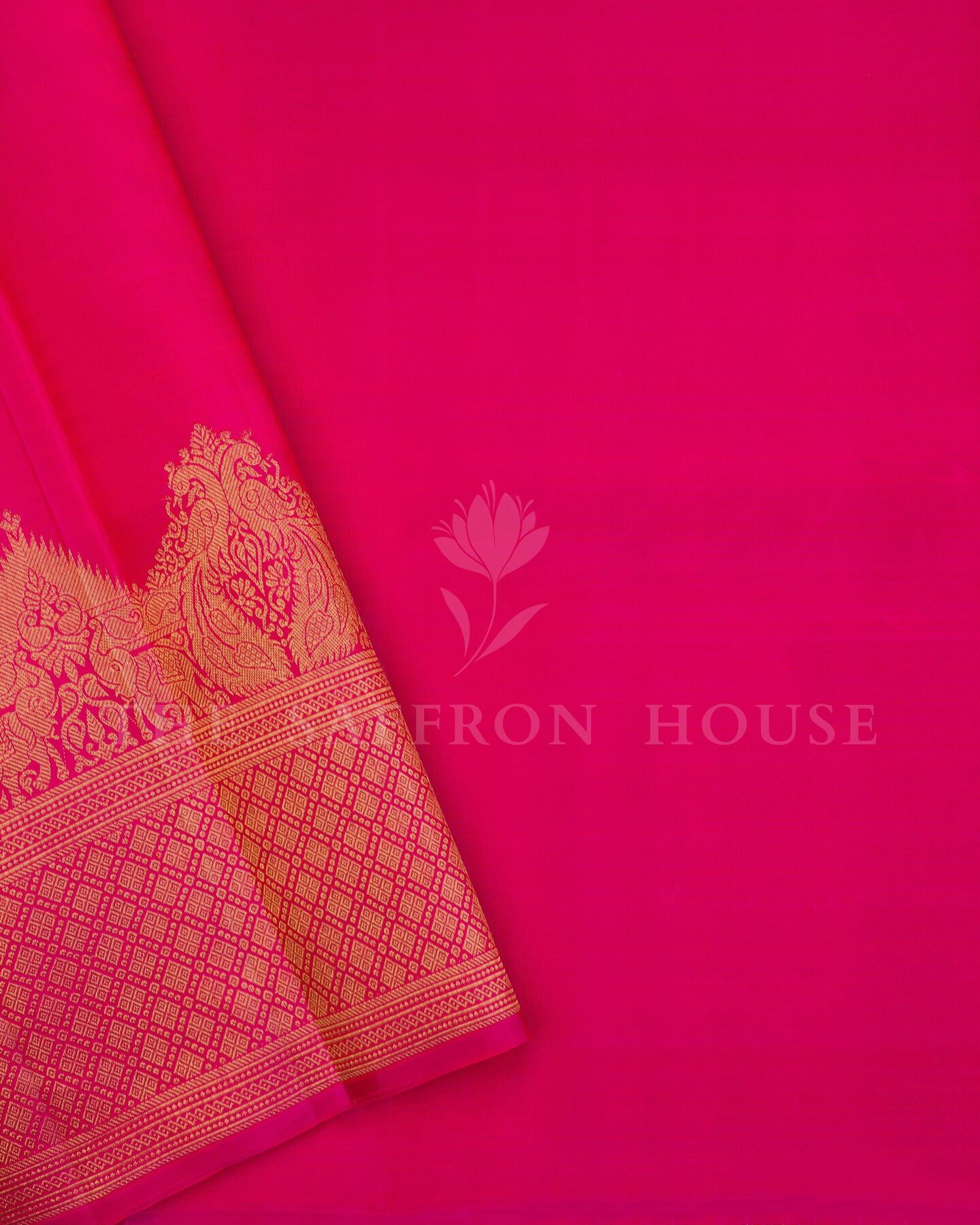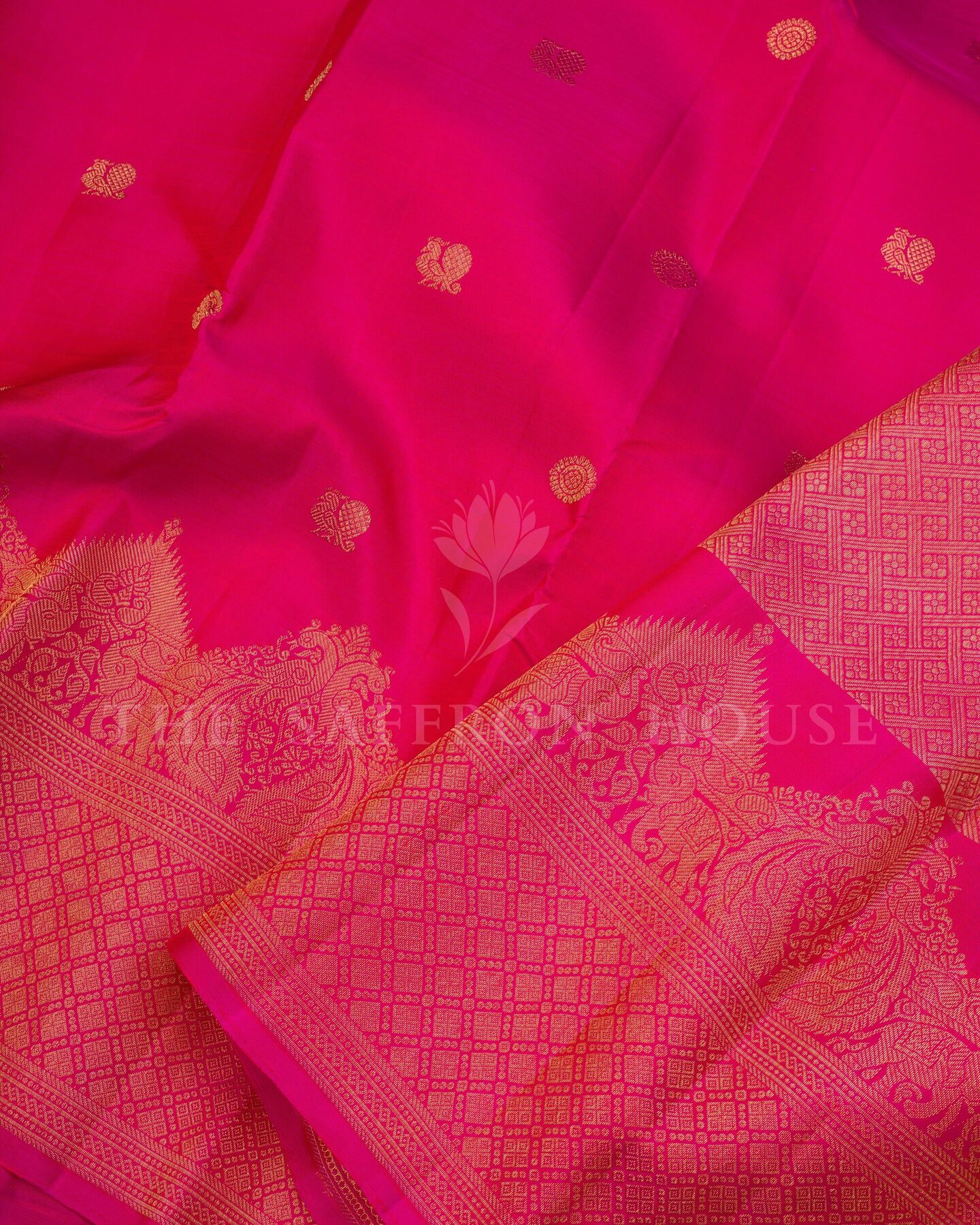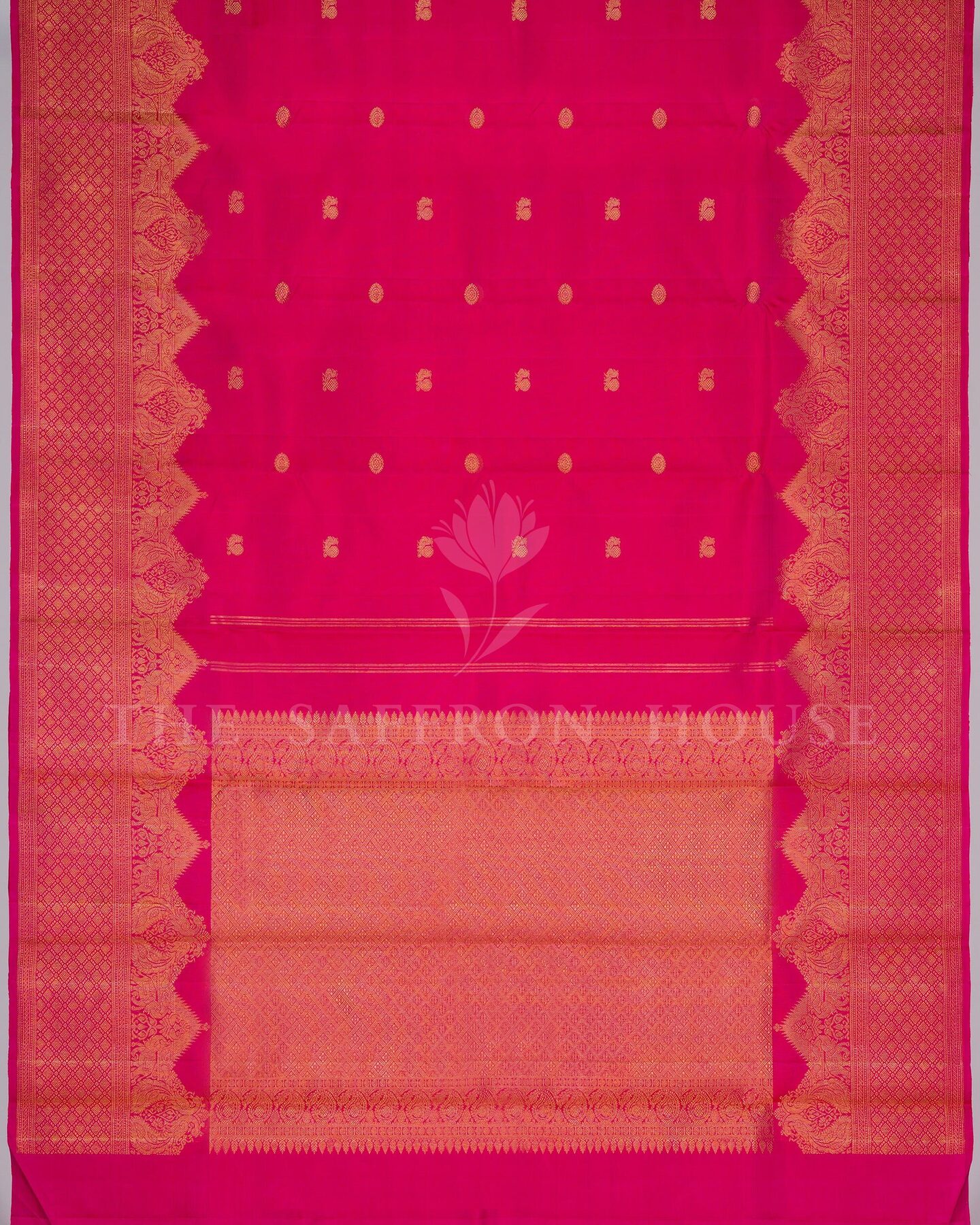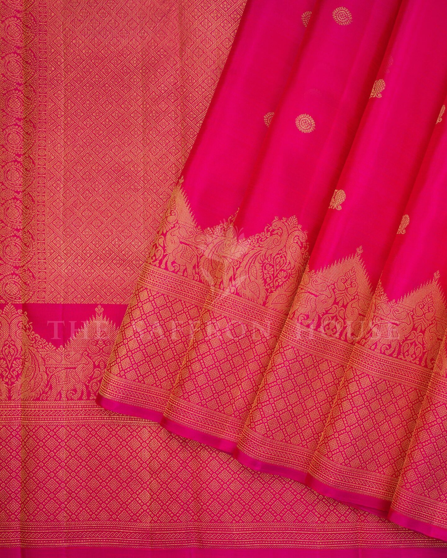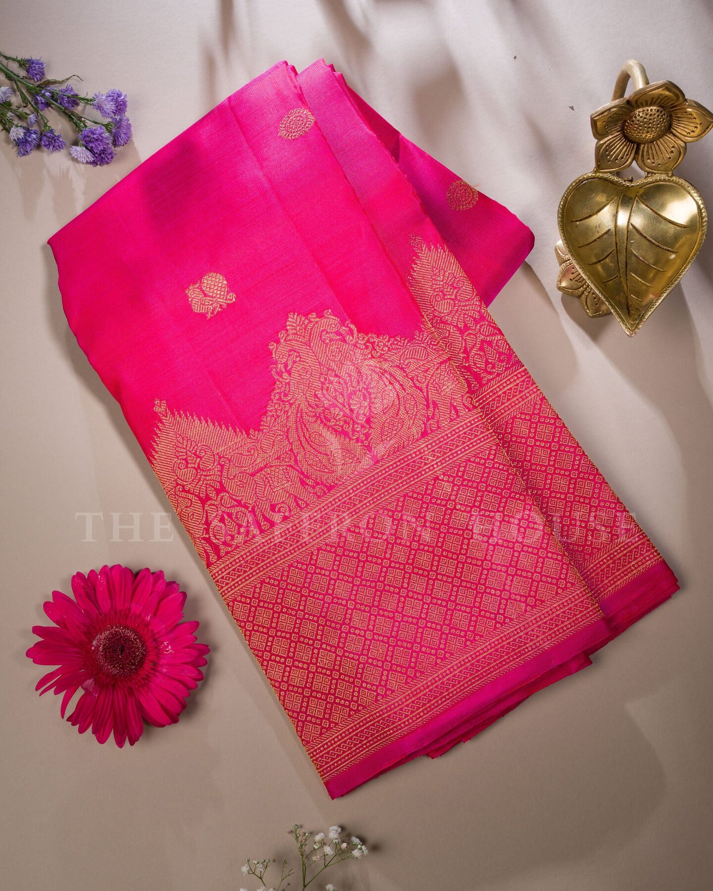 Some colours hold memory. Rani Pink — regal as a queen's court in bloom — becomes something entirely new when woven into pure Kanjivaram silk. This Handwoven saree carries that colour with quiet authority and grace.