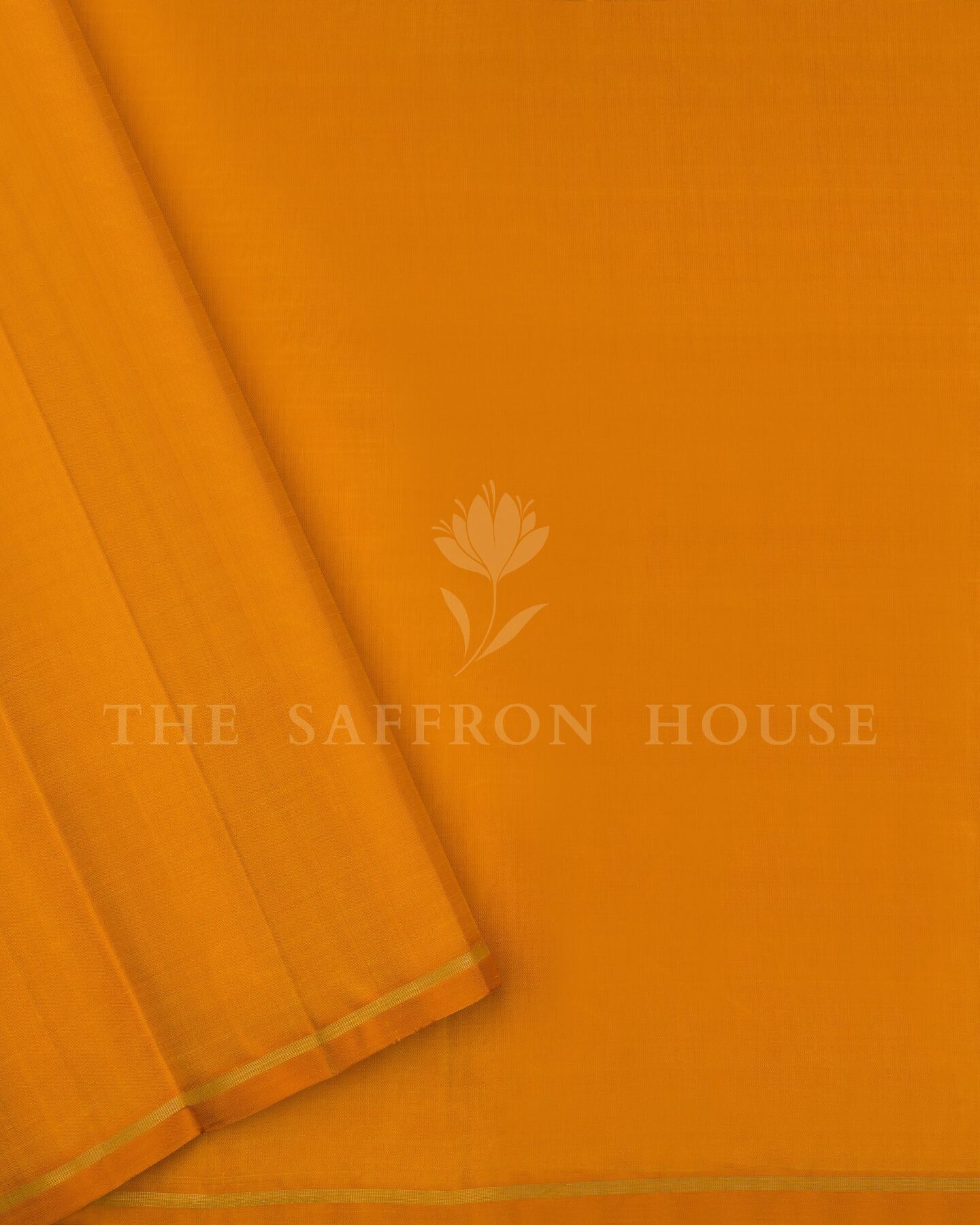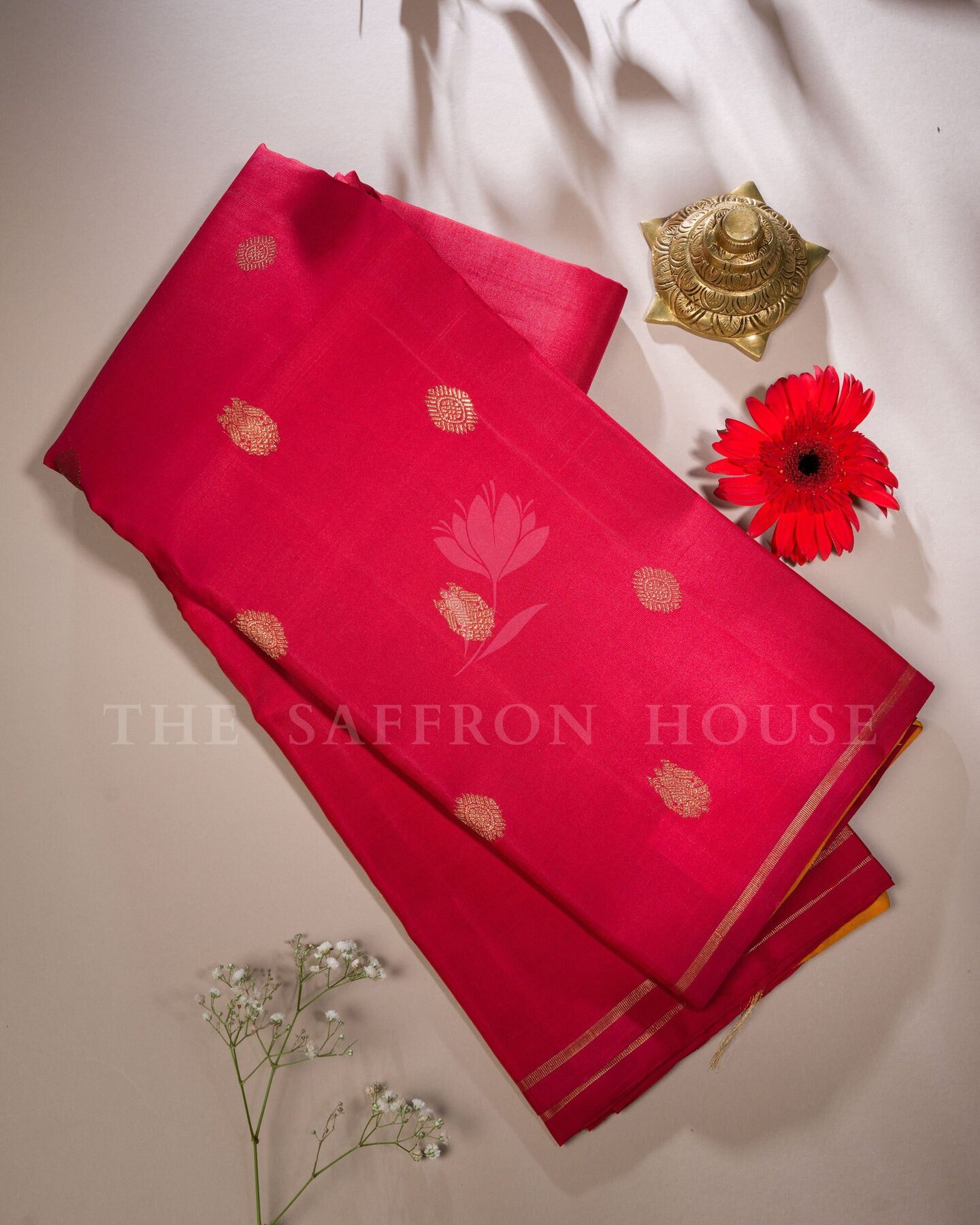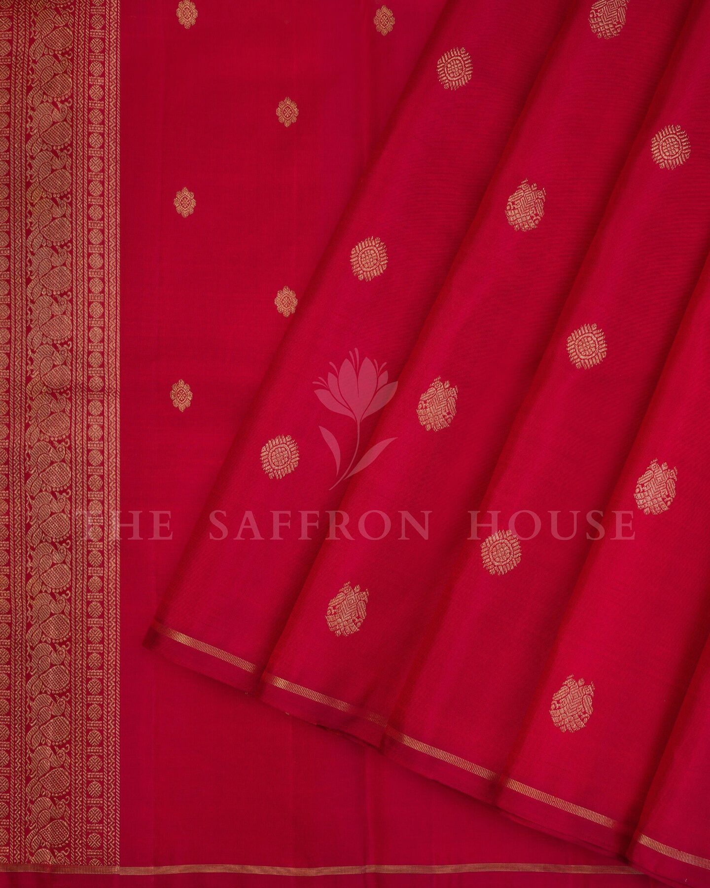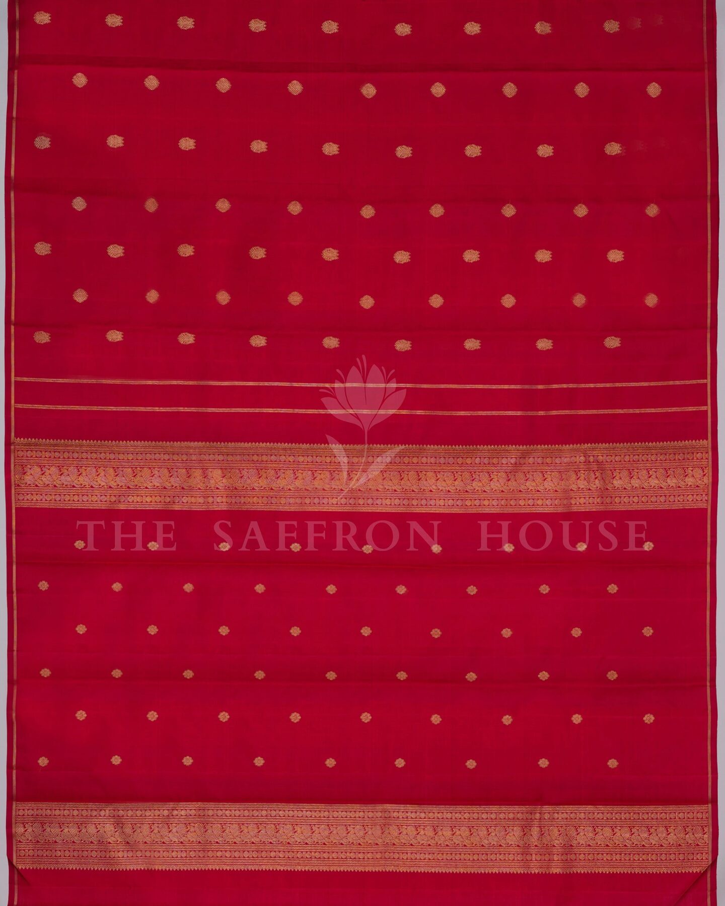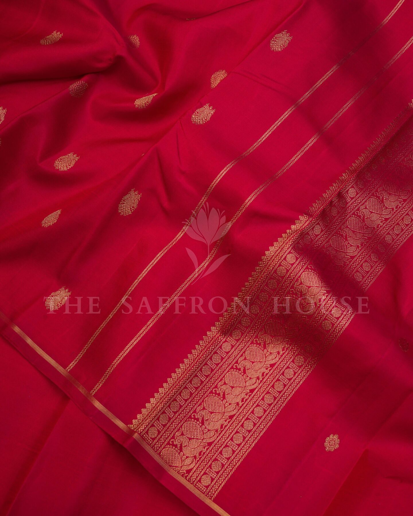 The body is woven with intricate traditional motifs, each thread placed with precision and purpose. A richly woven border frames the drape with confident definition, while gold zari runs through the weave, catching light the way temple gold does — slowly, deeply, unforgettably.