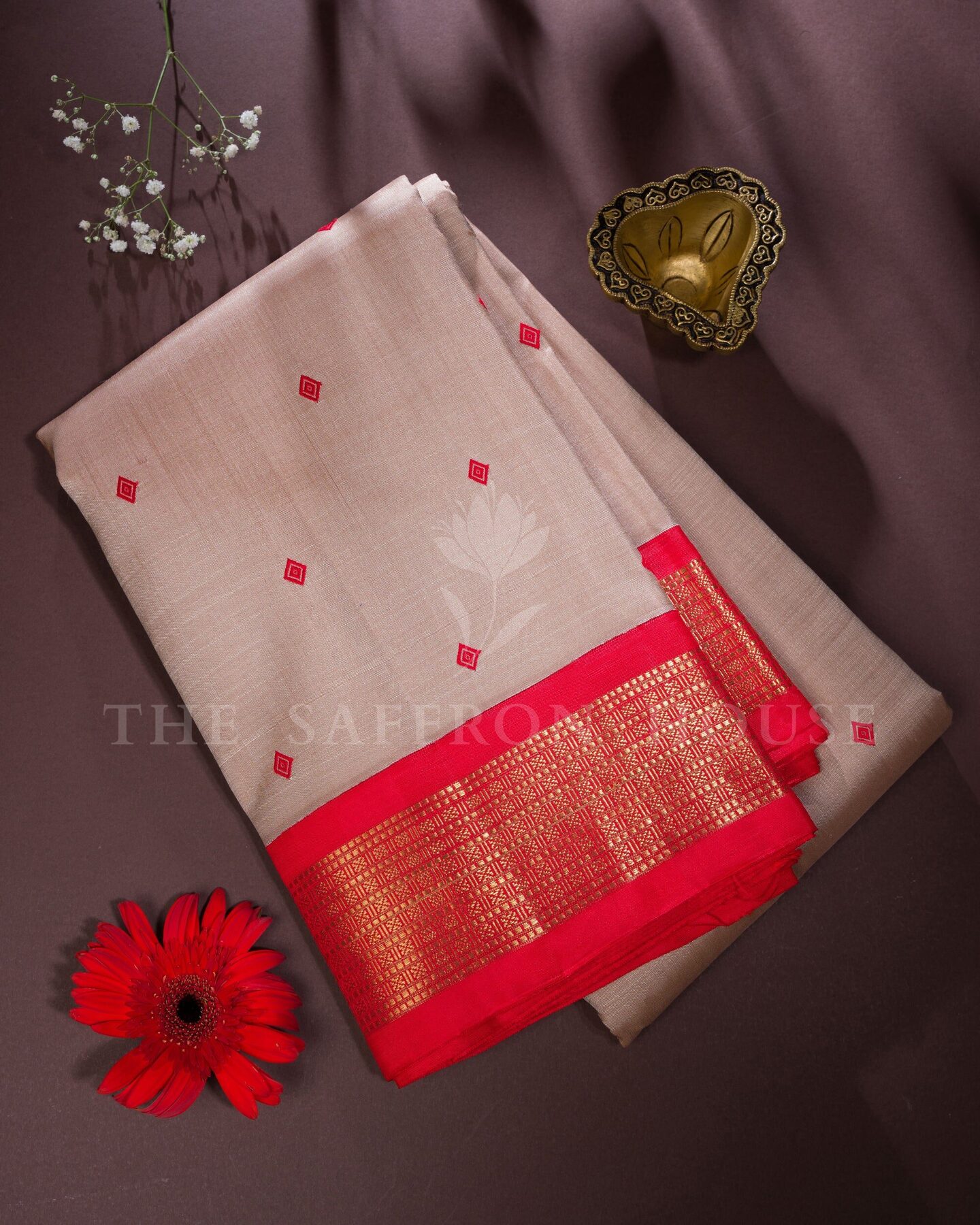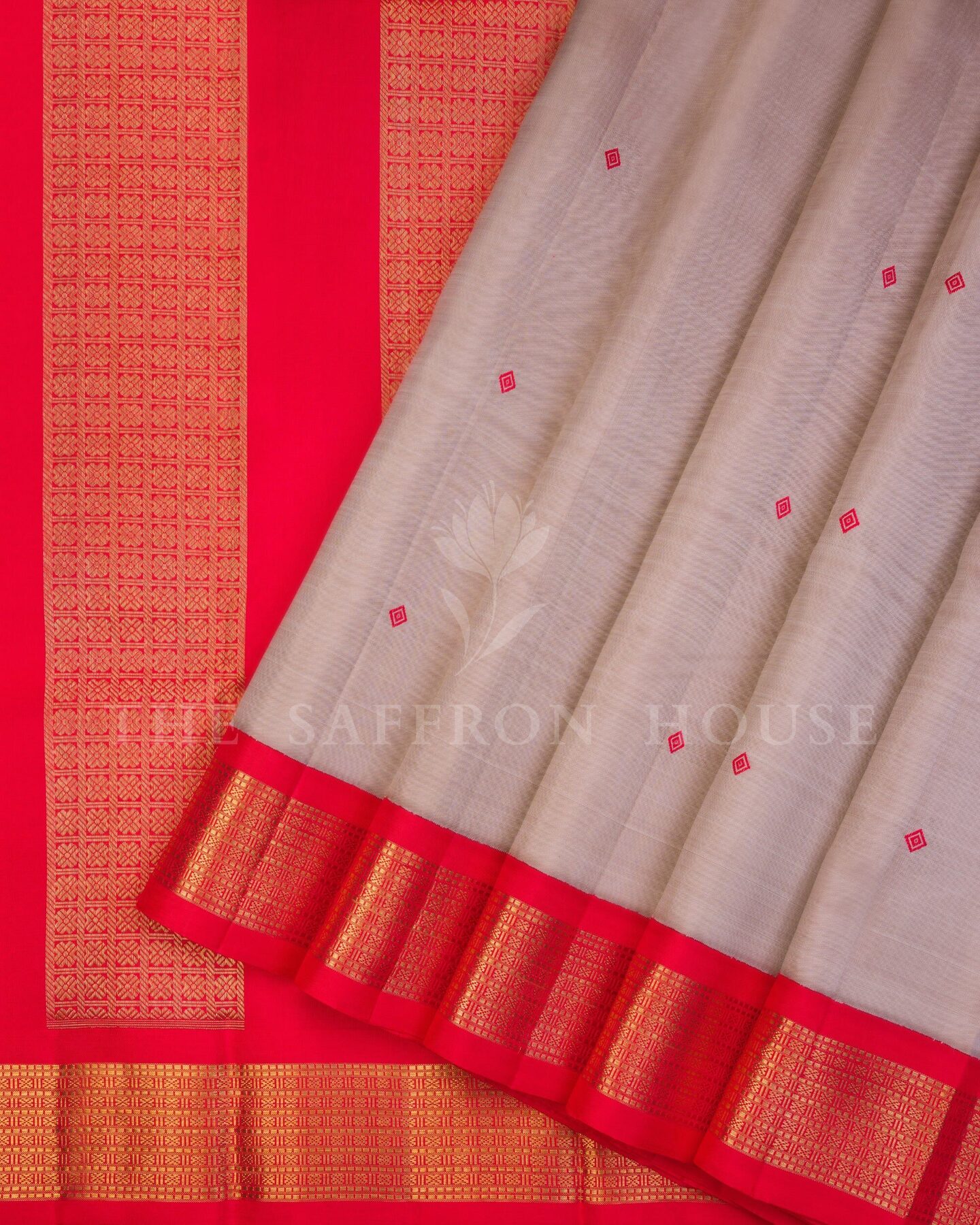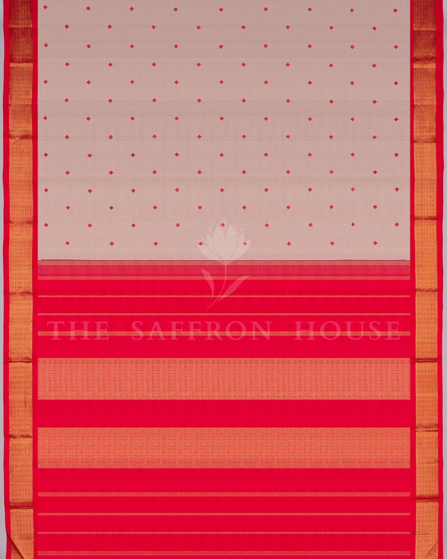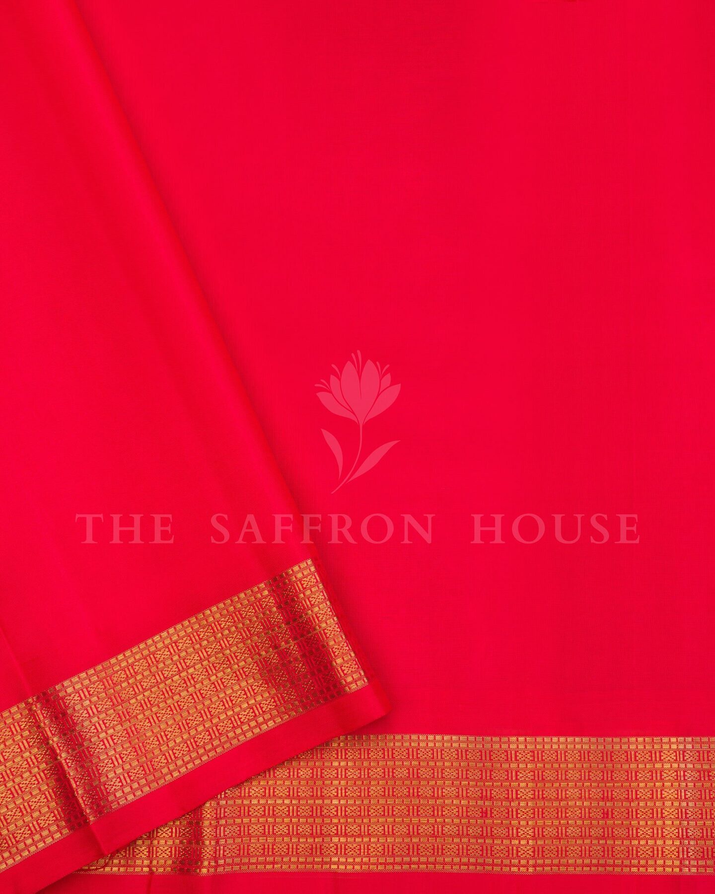 The body is woven with intricate traditional motifs, each thread placed with precision and purpose. A richly woven border frames the drape with confident definition, while gold zari runs through the weave, catching light the way temple gold does — slowly, deeply, unforgettably.