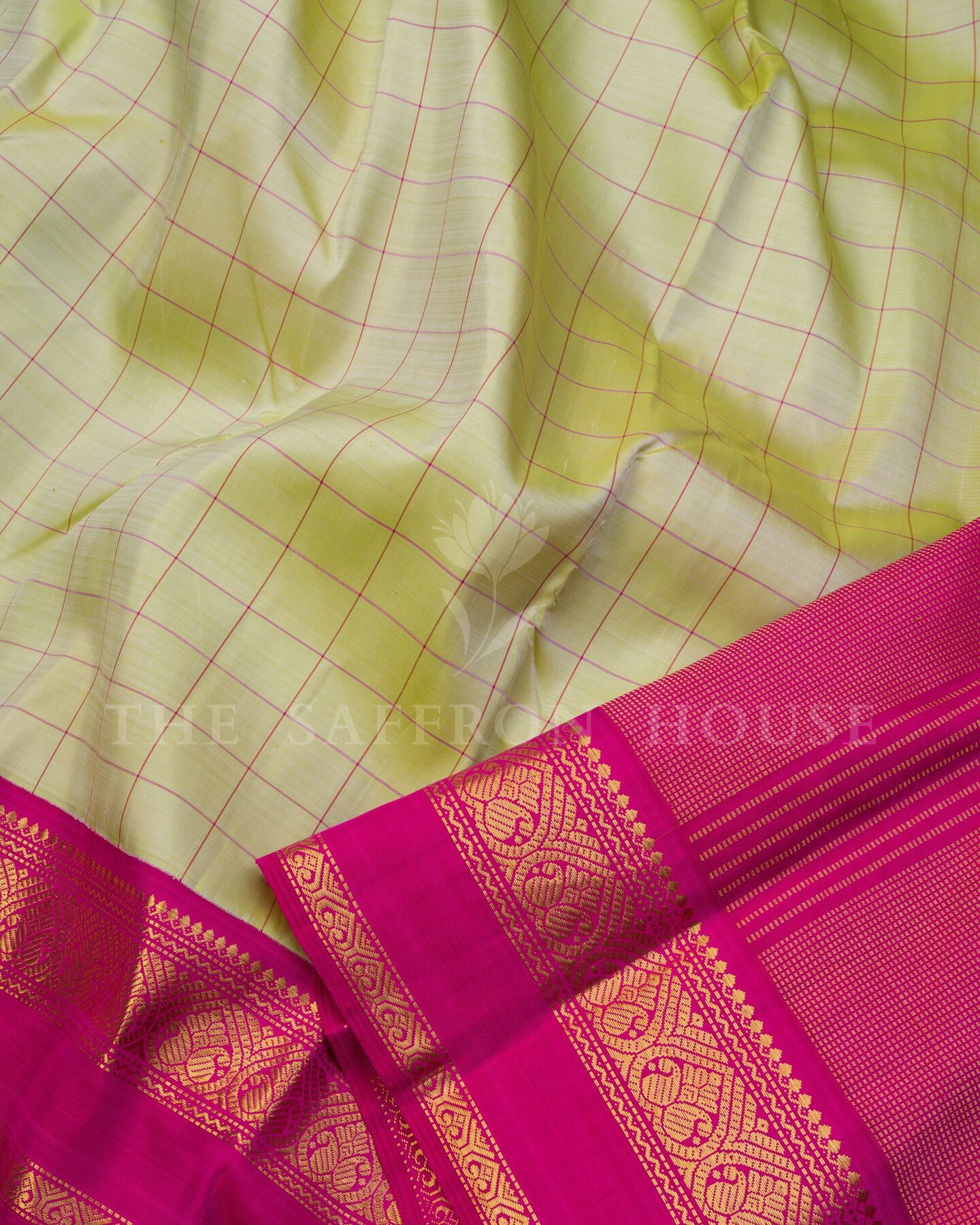 There is something about the interplay of pista green and rani pink that feels both ancient and alive. This Korvai Kanjivaram silk saree opens with radiant in its own quiet way, its surface shimmering with the unhurried rhythm of the loom.