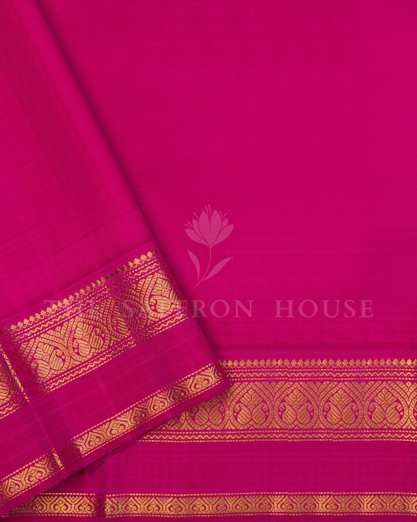 The body is woven with intricate traditional motifs, each thread placed with precision and purpose. A richly woven border frames the drape with confident definition, while gold zari runs through the weave, catching light the way temple gold does — slowly, deeply, unforgettably.