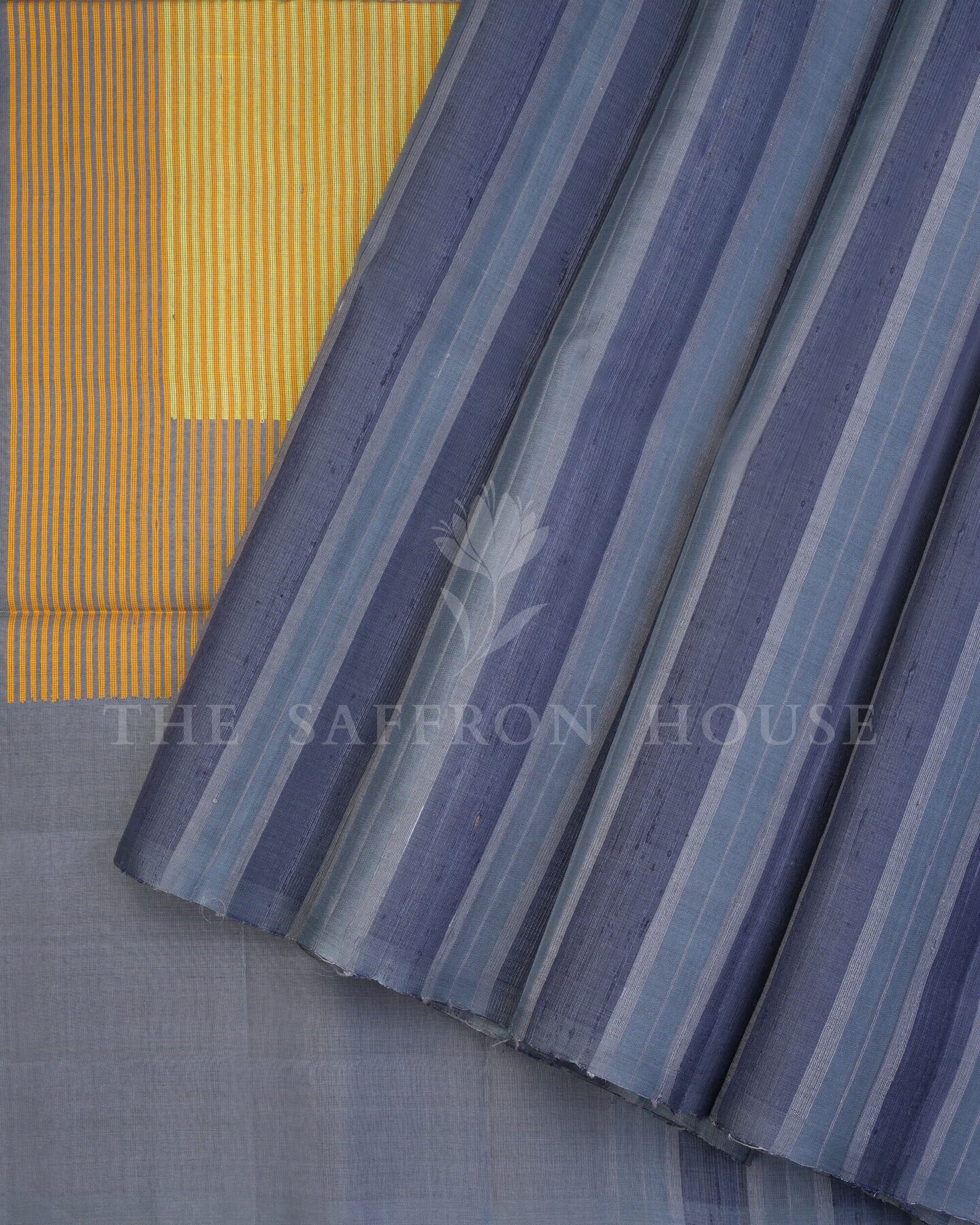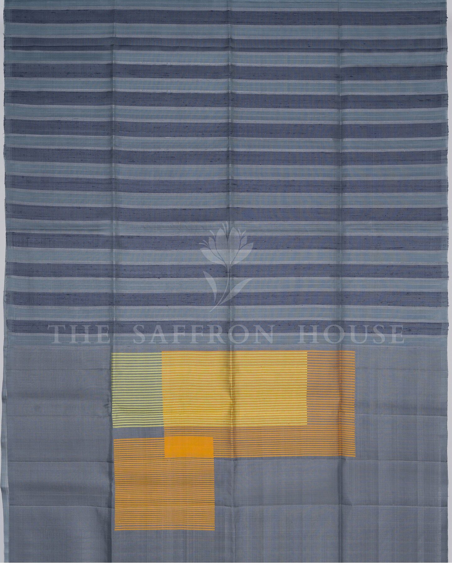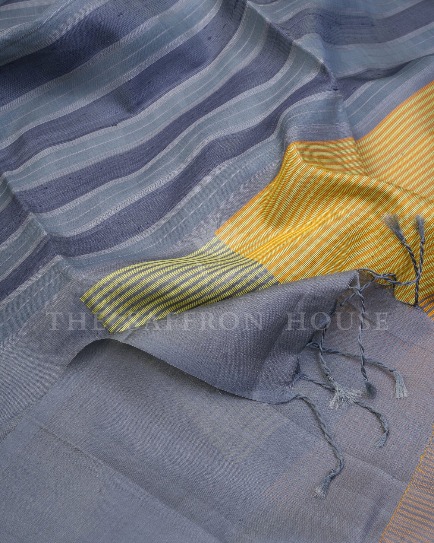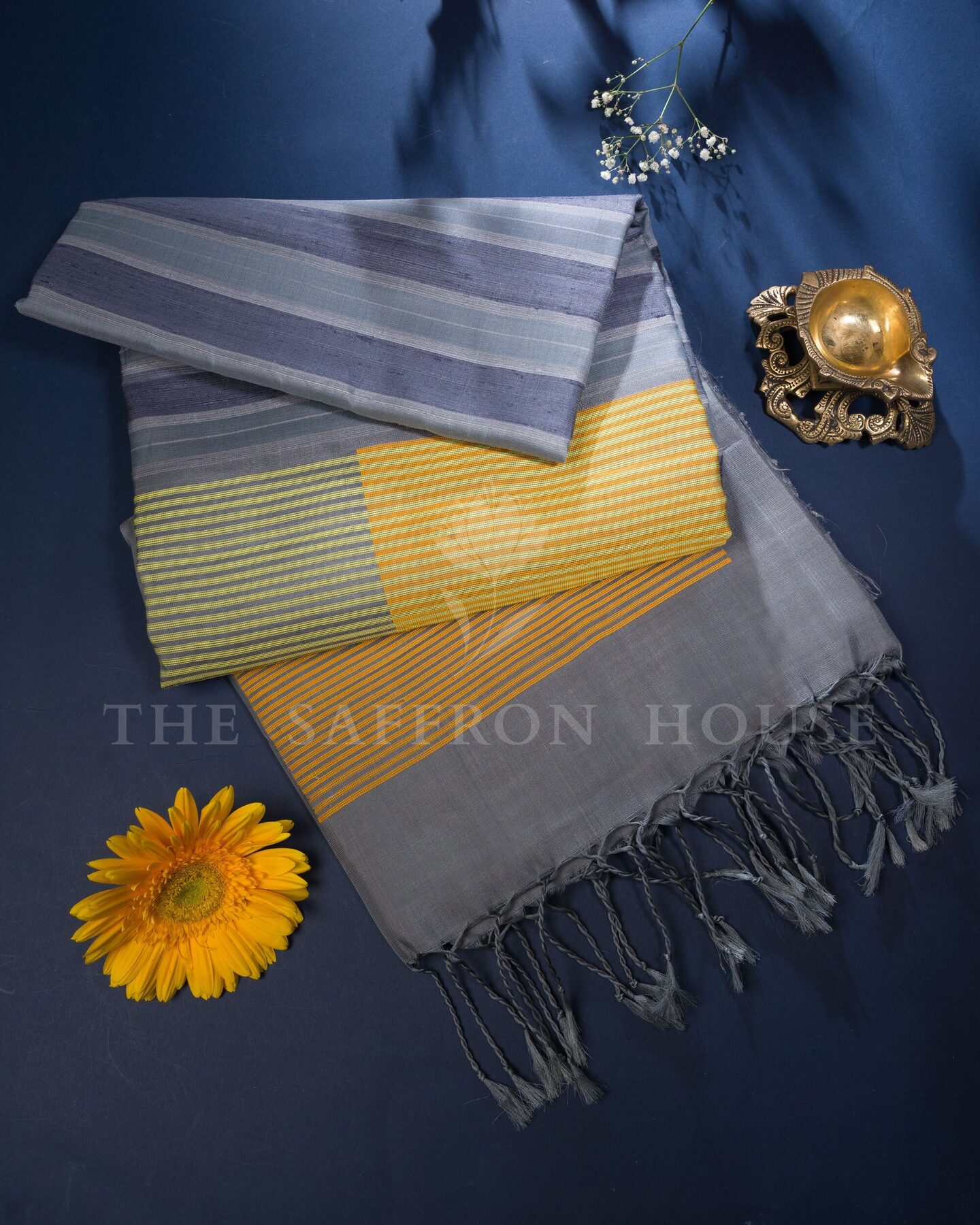 There is something about the interplay of grey and yellow that feels both ancient and alive. This Handwoven Kanjivaram silk saree opens with quietly sophisticated and enduringly modern, its surface shimmering with the unhurried rhythm of the loom.