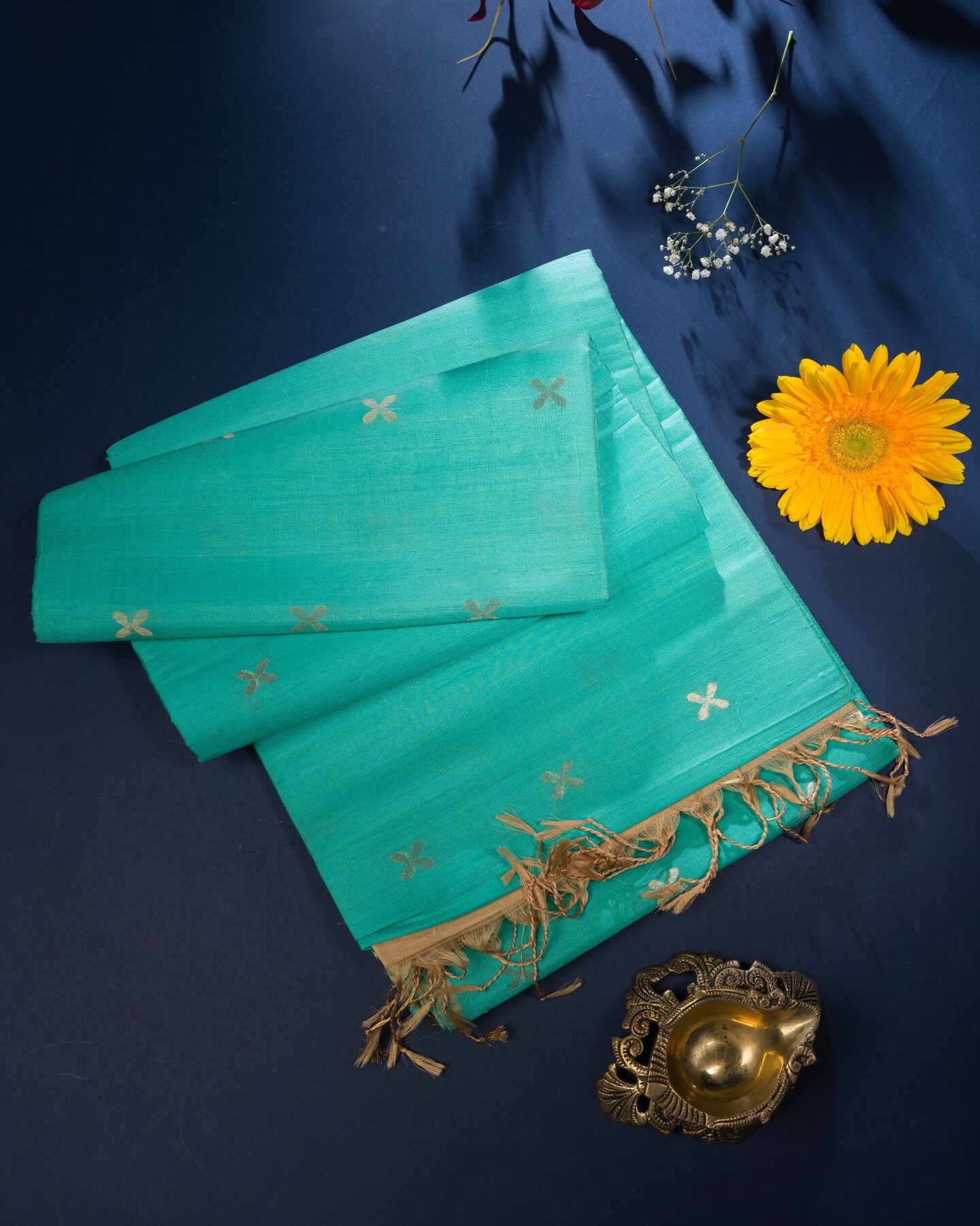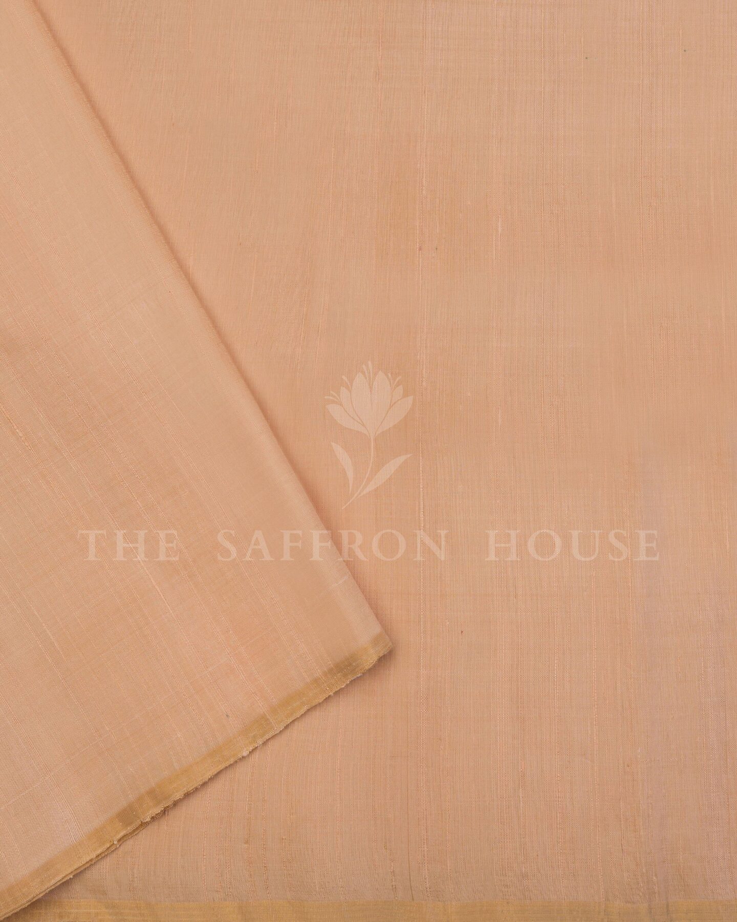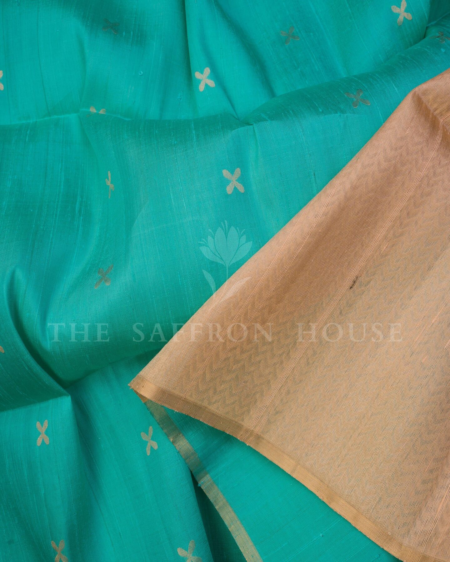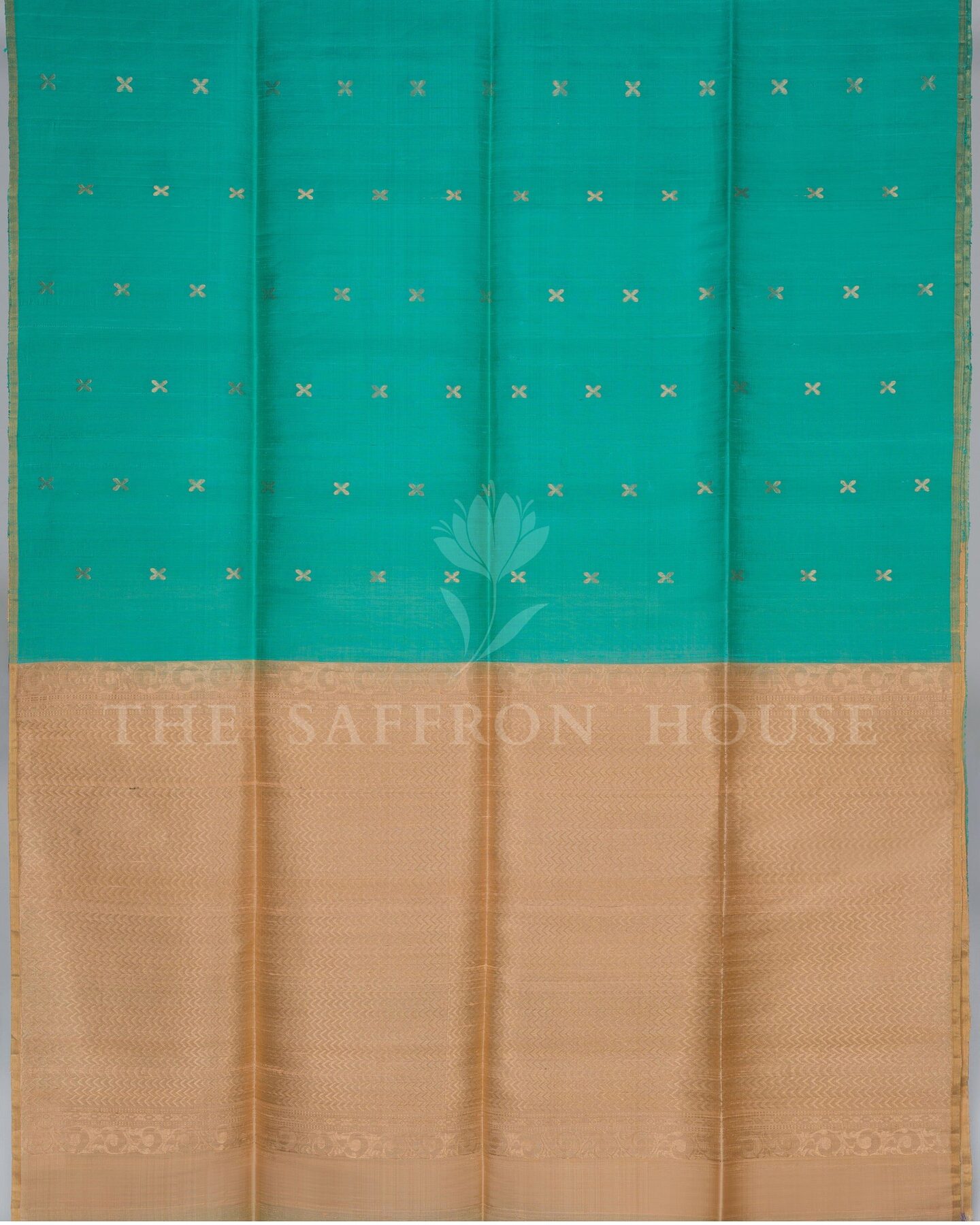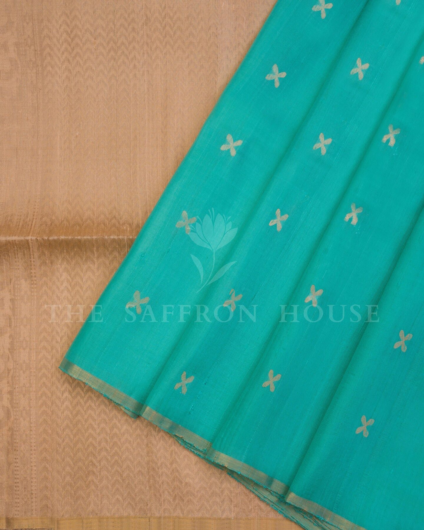 There is something about the interplay of turquoise and beige that feels both ancient and alive. This Handwoven Kanjivaram silk saree opens with vivid as still temple-pond water, its surface shimmering with the unhurried rhythm of the loom.