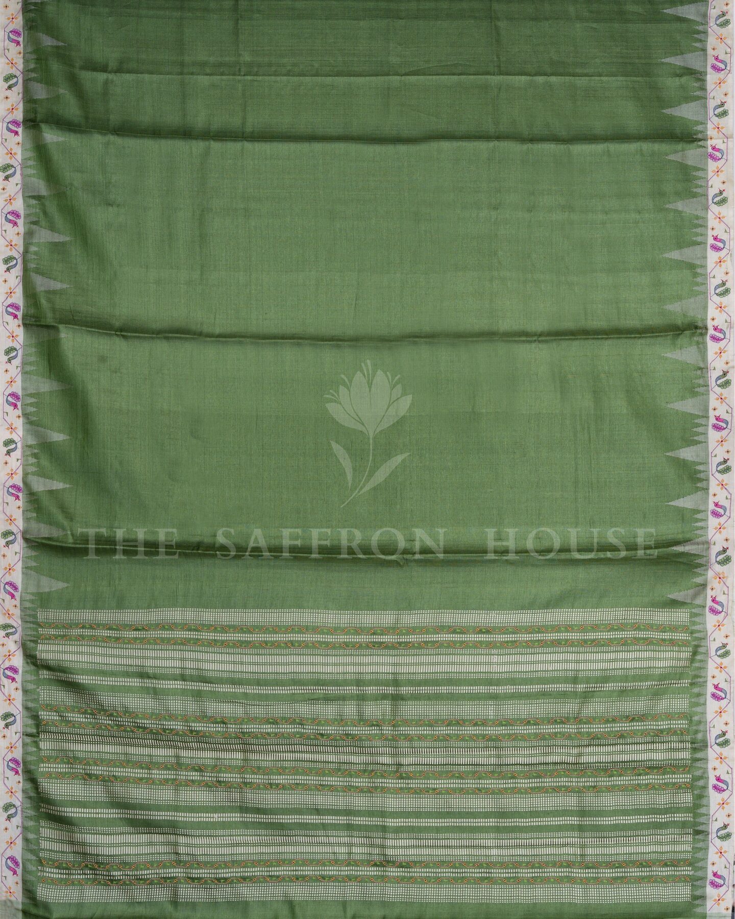 The body is woven with intricate traditional motifs, each thread placed with precision and purpose. A richly woven border frames the drape with confident definition, while real zari runs through the weave, catching light the way temple gold does — slowly, deeply, unforgettably.