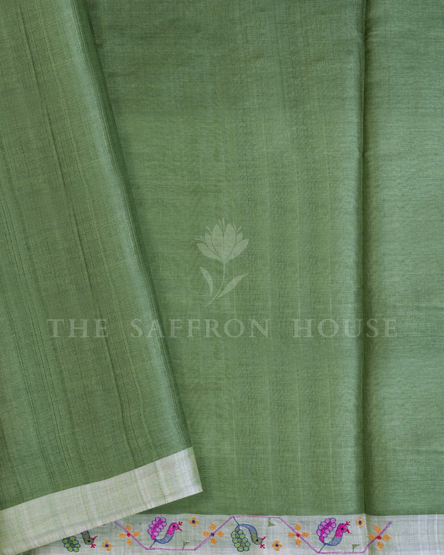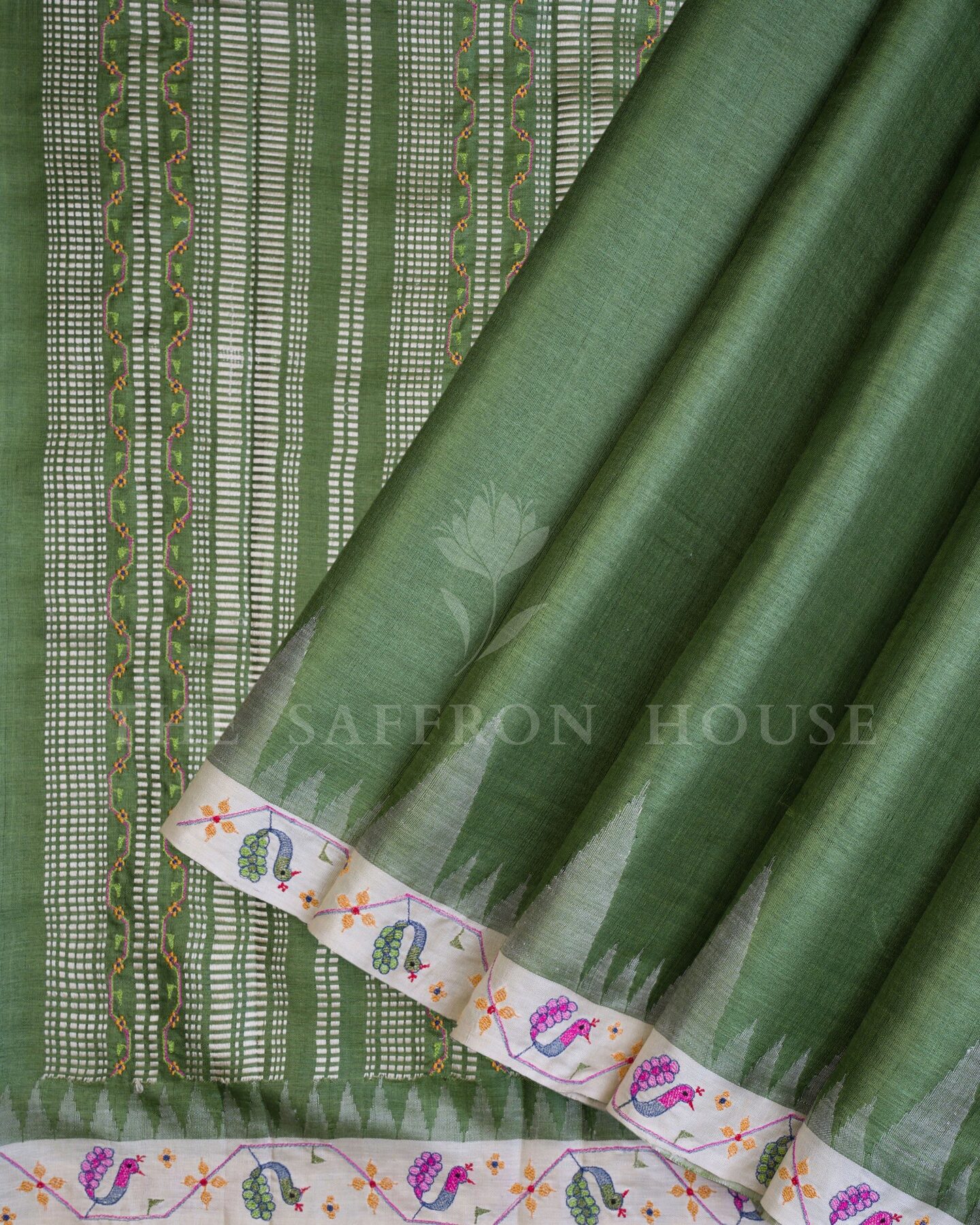 There is something about the interplay of parrot green and ivory that feels both ancient and alive. This Handwoven Kanjivaram silk saree opens with radiant in its own quiet way, its surface shimmering with the unhurried rhythm of the loom.