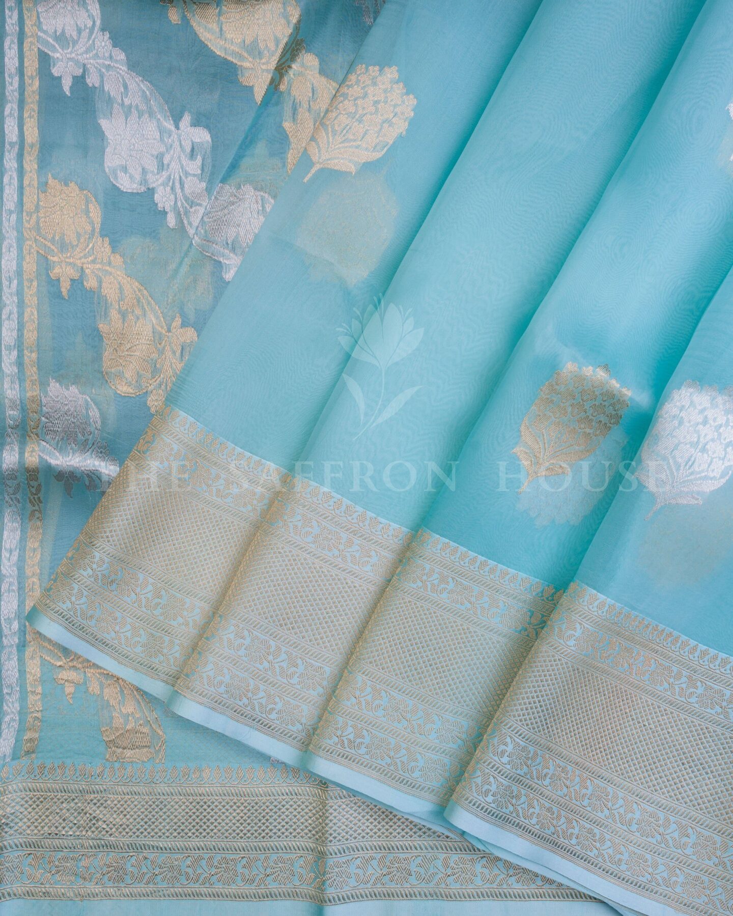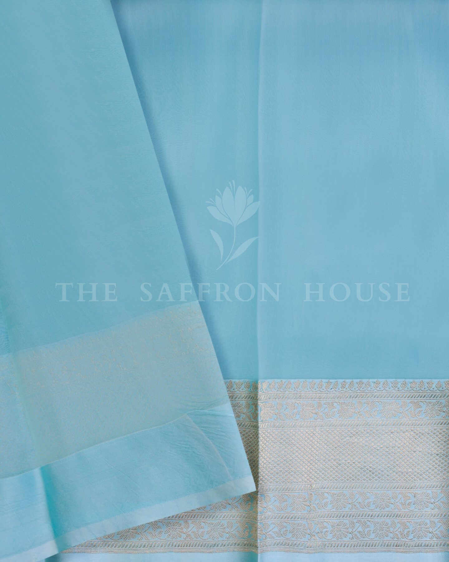 Some colours hold memory. Blue — calm and majestic as a monsoon sky — becomes something entirely new when woven into pure Kanjivaram silk. This Kora saree carries that colour with quiet authority and grace.