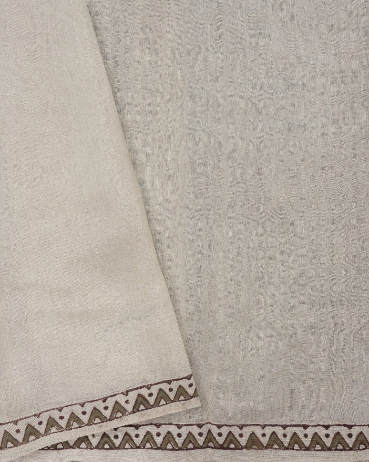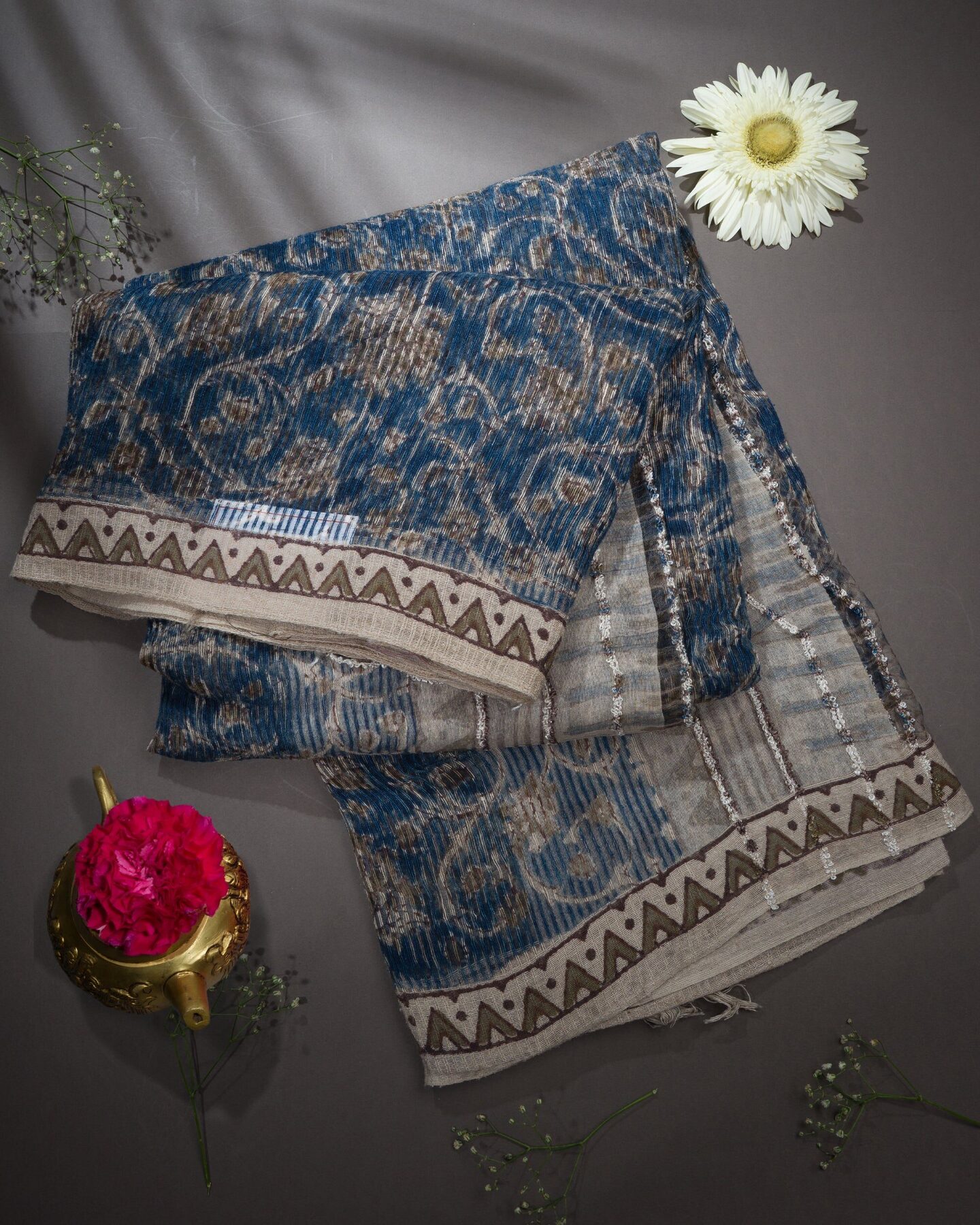 The body is adorned with floral printed, each thread placed with precision and purpose. The beige border frames the drape with confident definition, while no zari runs through the weave, catching light the way temple gold does — slowly, deeply, unforgettably.