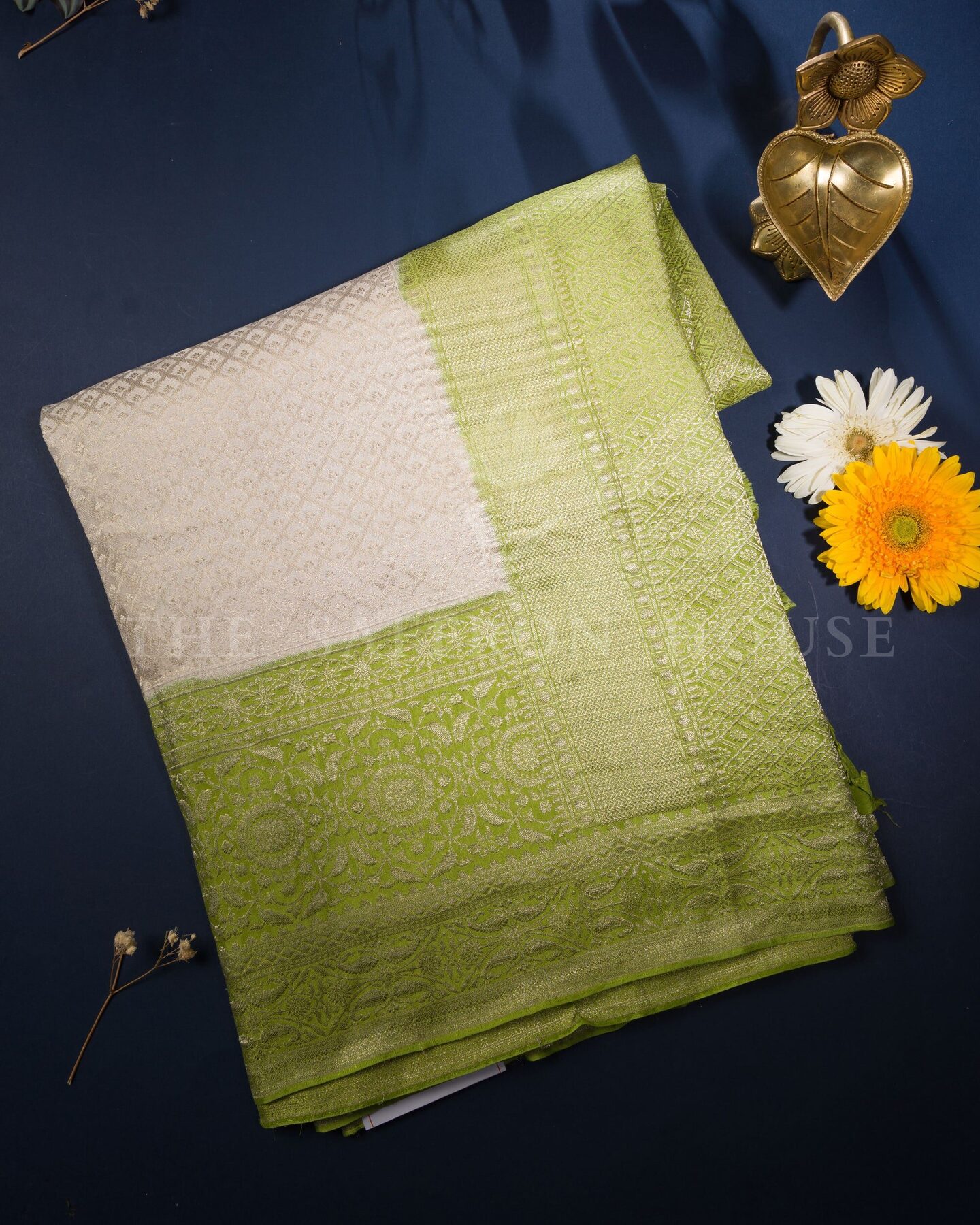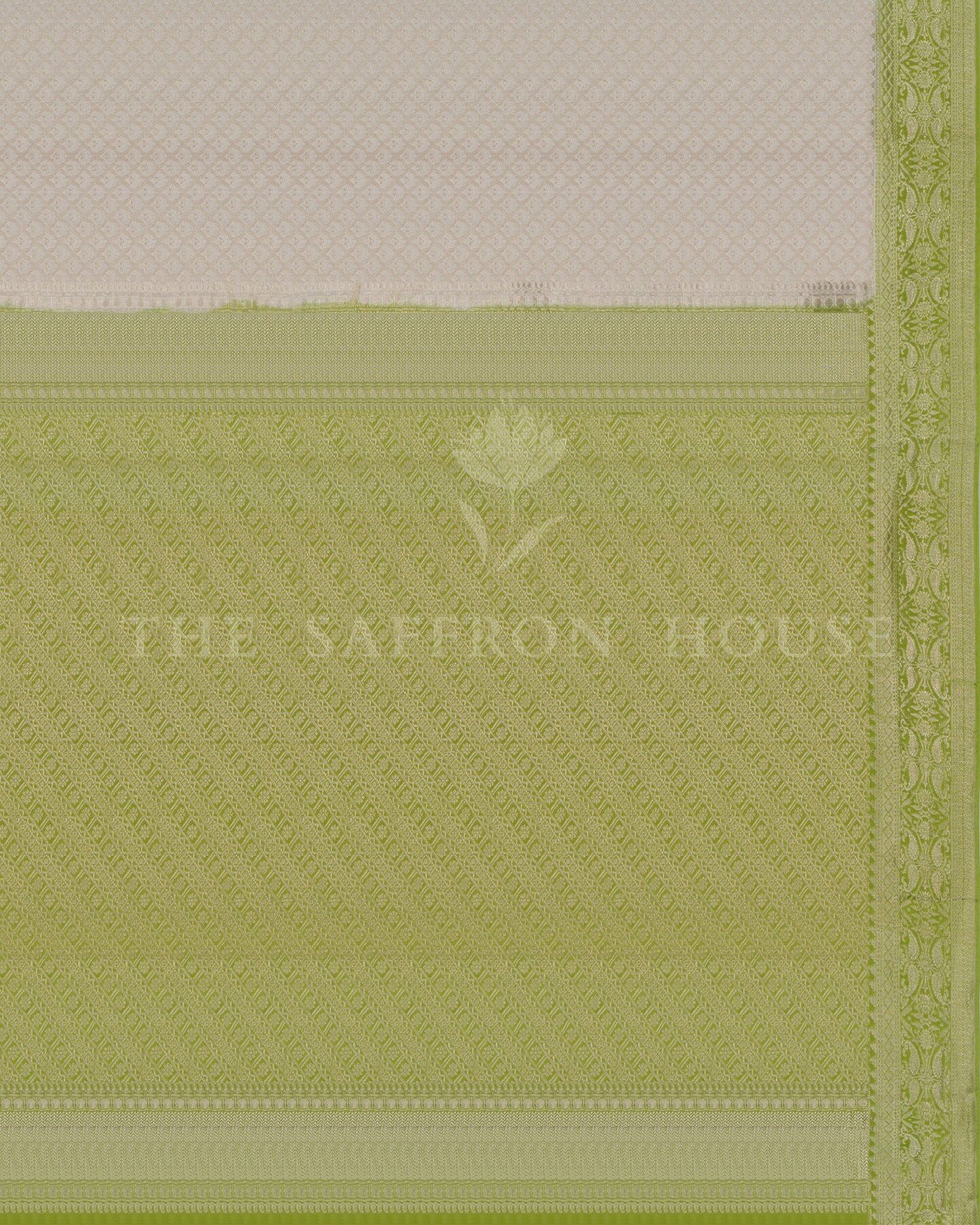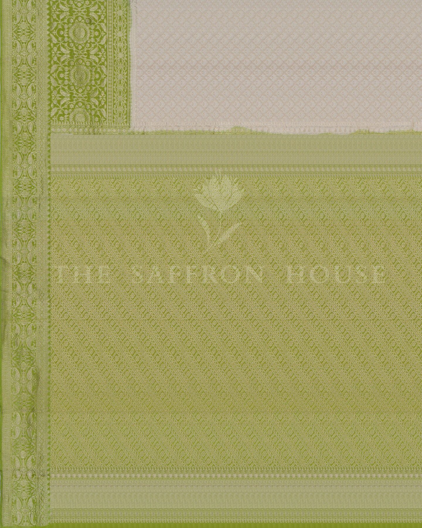 There is something about the interplay of ivory and lime green that feels both ancient and alive. This Brocade Kanjivaram silk saree opens with timeless as heirloom milk silk, its surface shimmering with the unhurried rhythm of the loom.