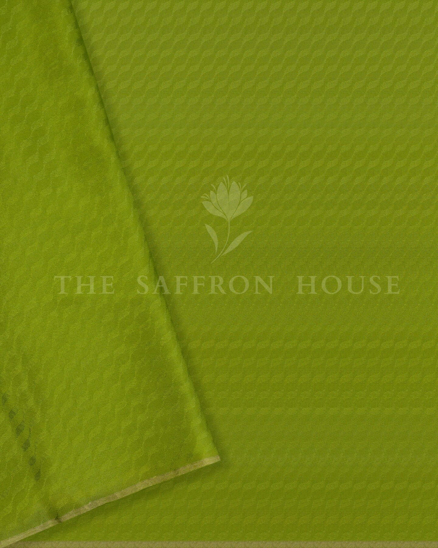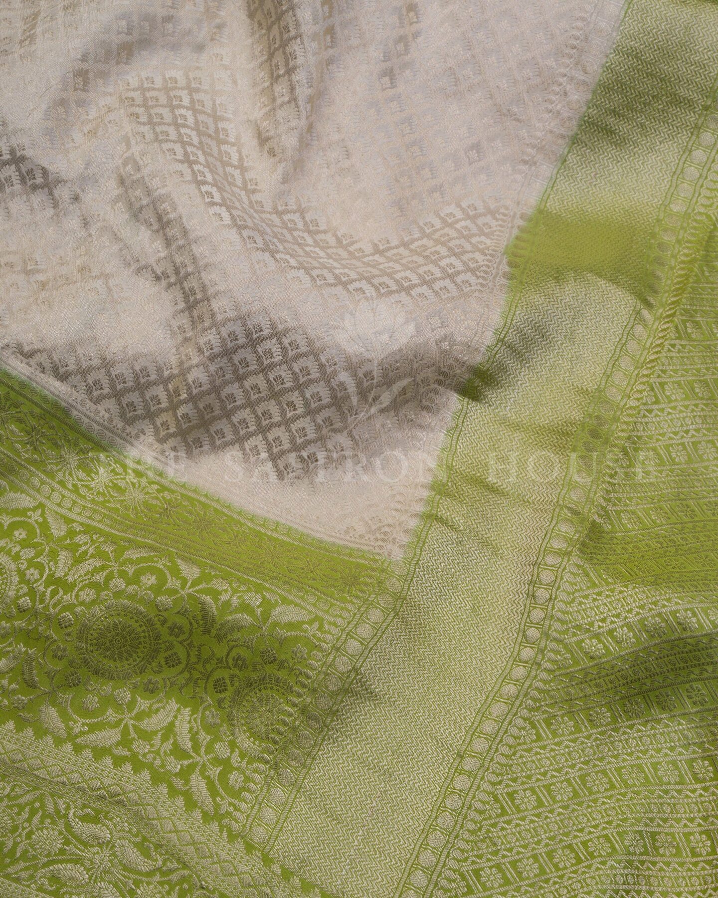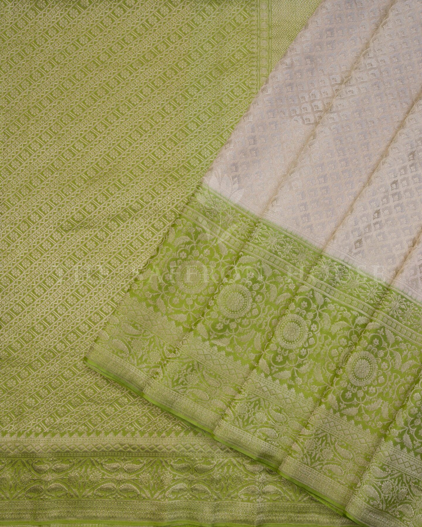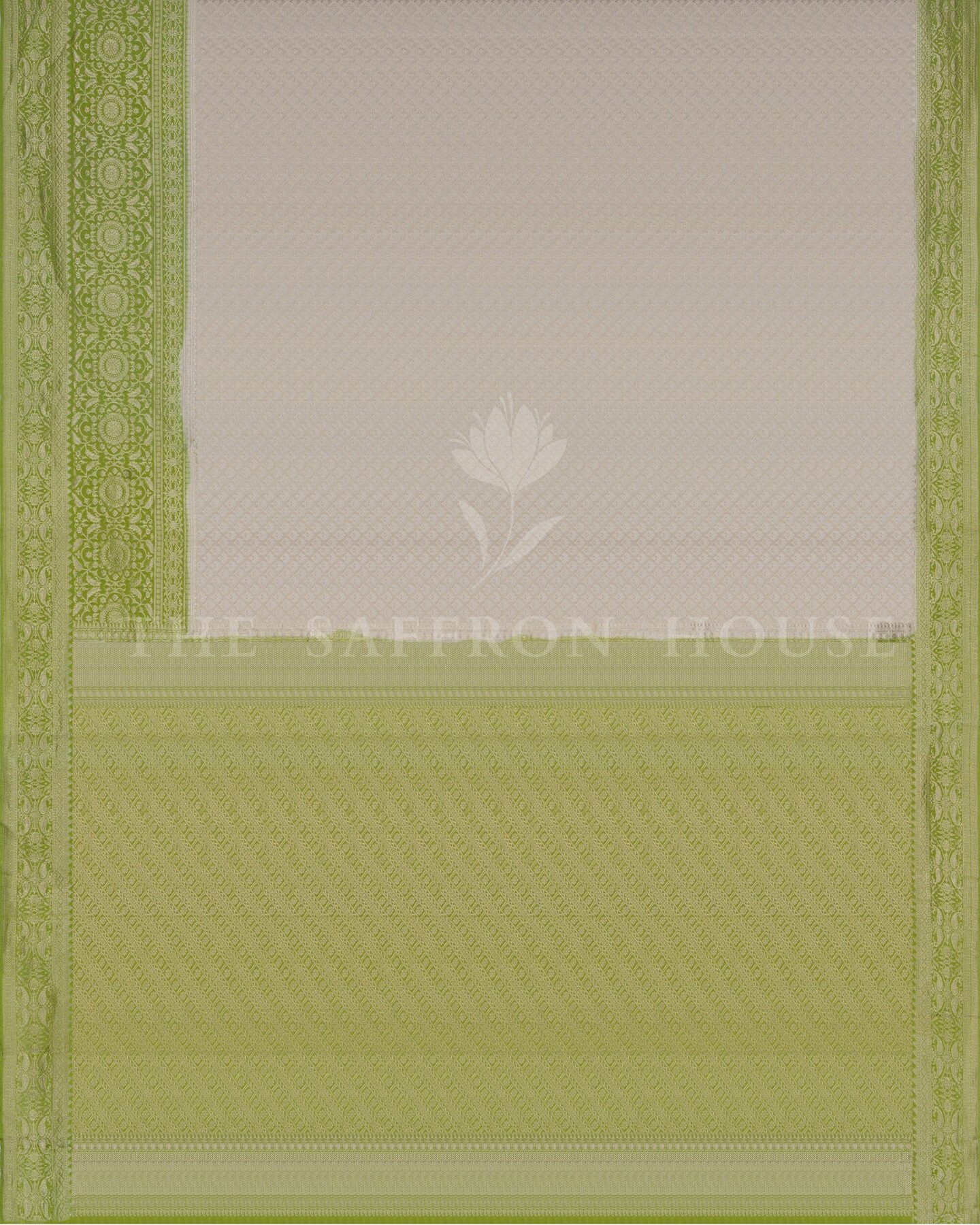 There is something about the interplay of ivory and lime green that feels both ancient and alive. This Brocade Kanjivaram silk saree opens with timeless as heirloom milk silk, its surface shimmering with the unhurried rhythm of the loom.