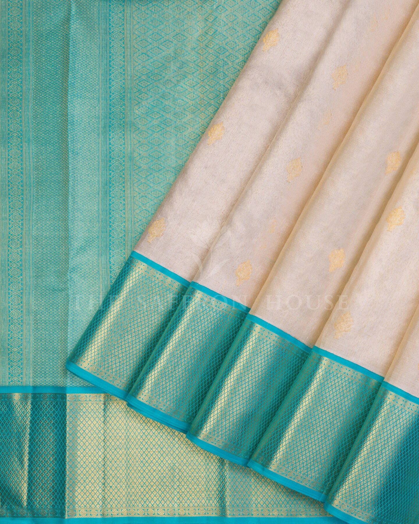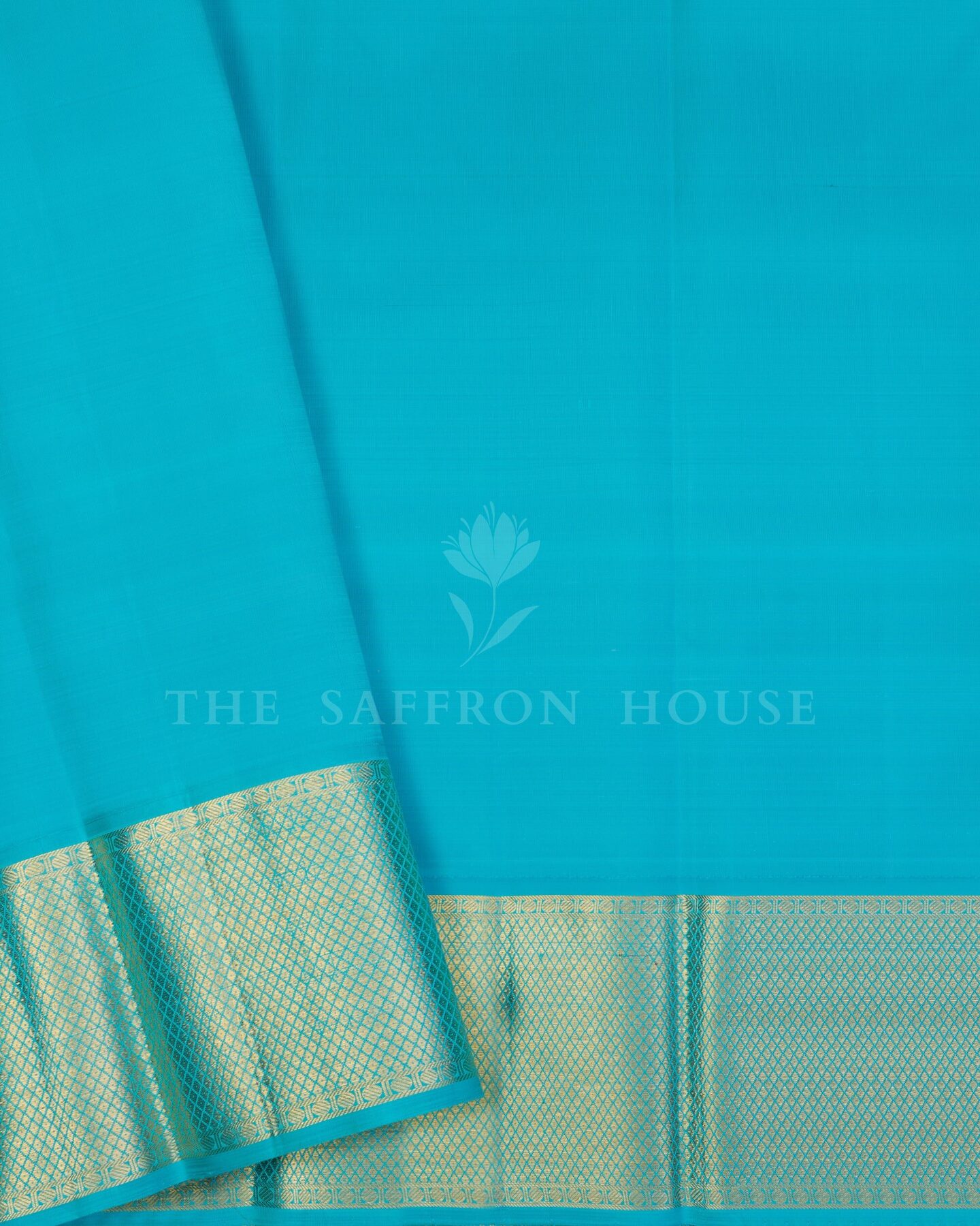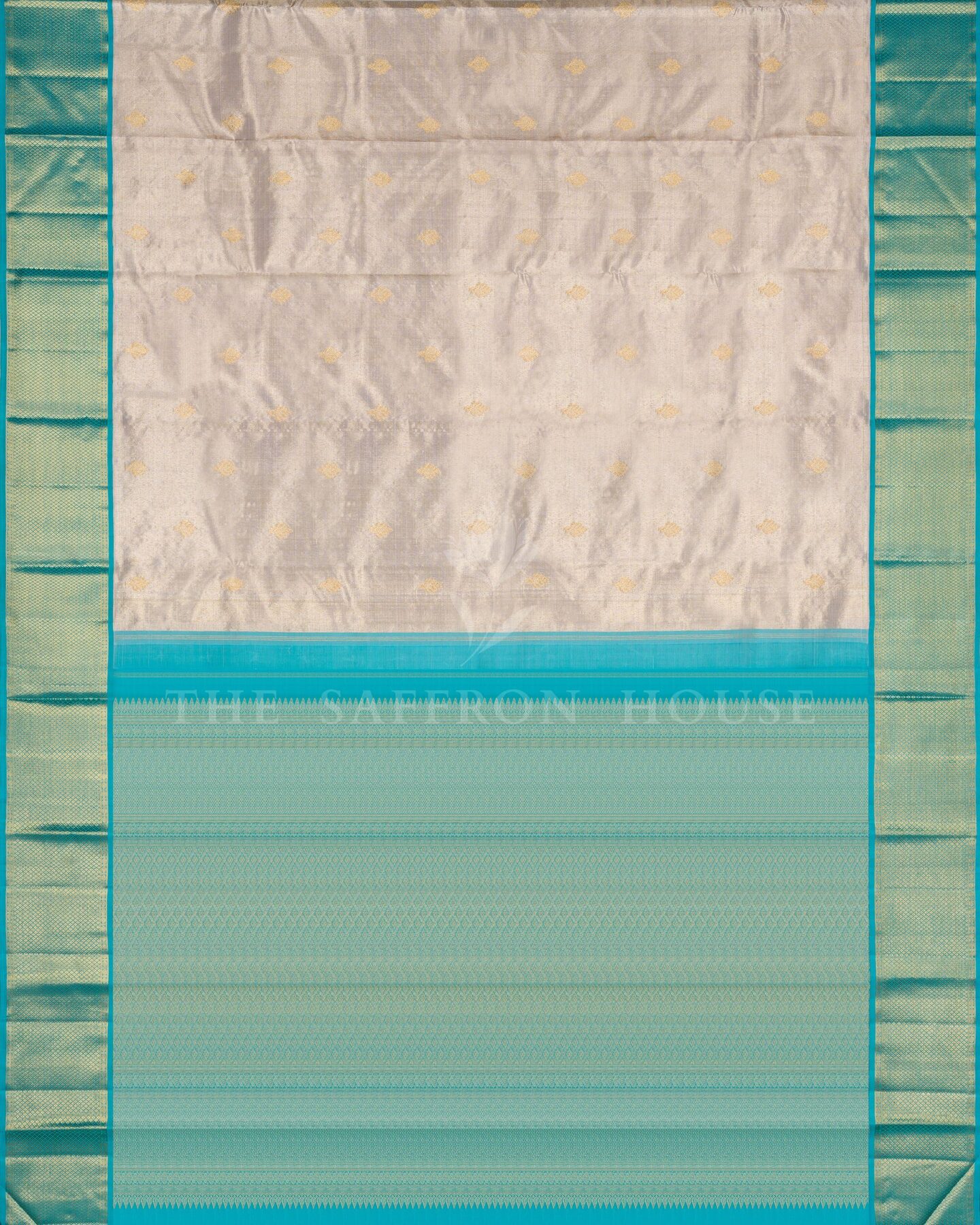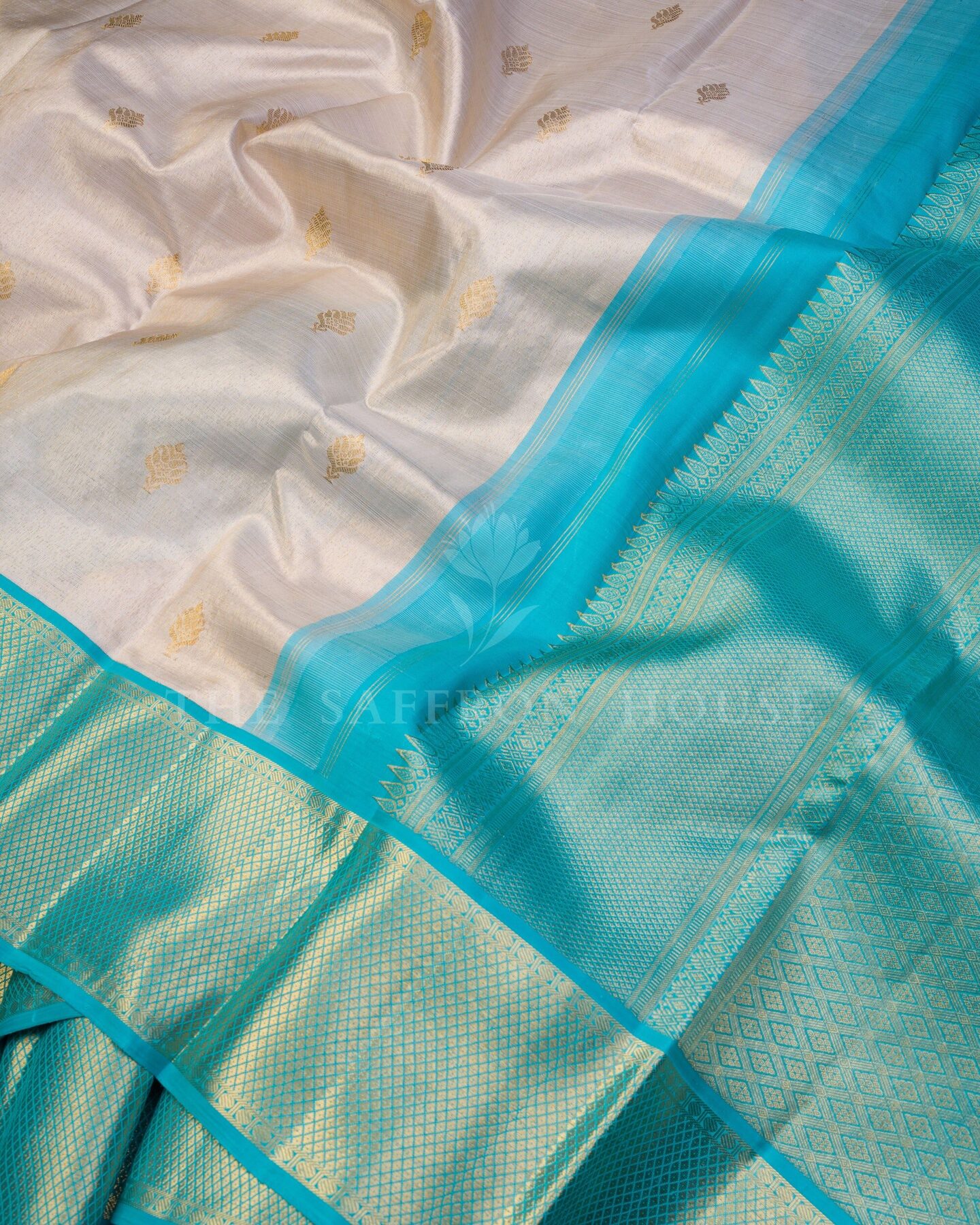 There is something about the interplay of sky blue and ivory that feels both ancient and alive. This Handwoven Kanjivaram silk saree opens with radiant in its own quiet way, its surface shimmering with the unhurried rhythm of the loom.
