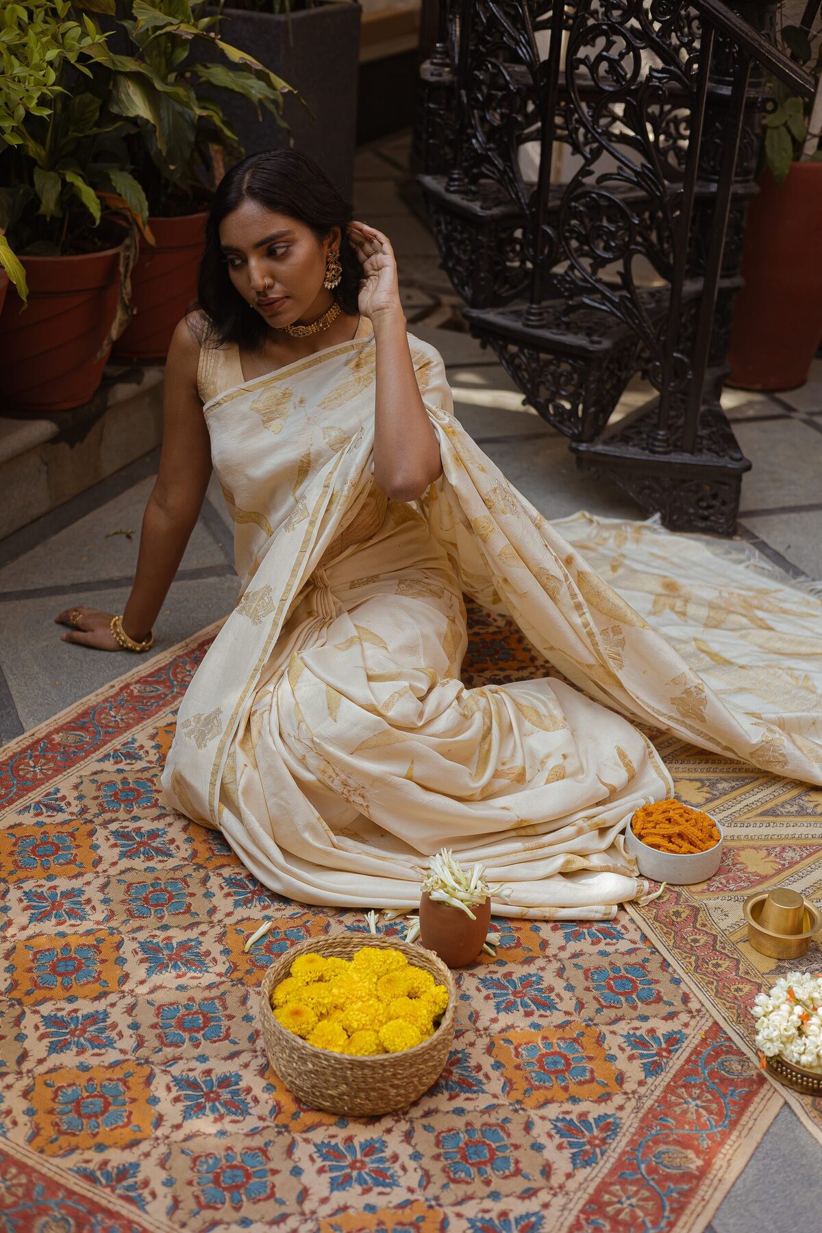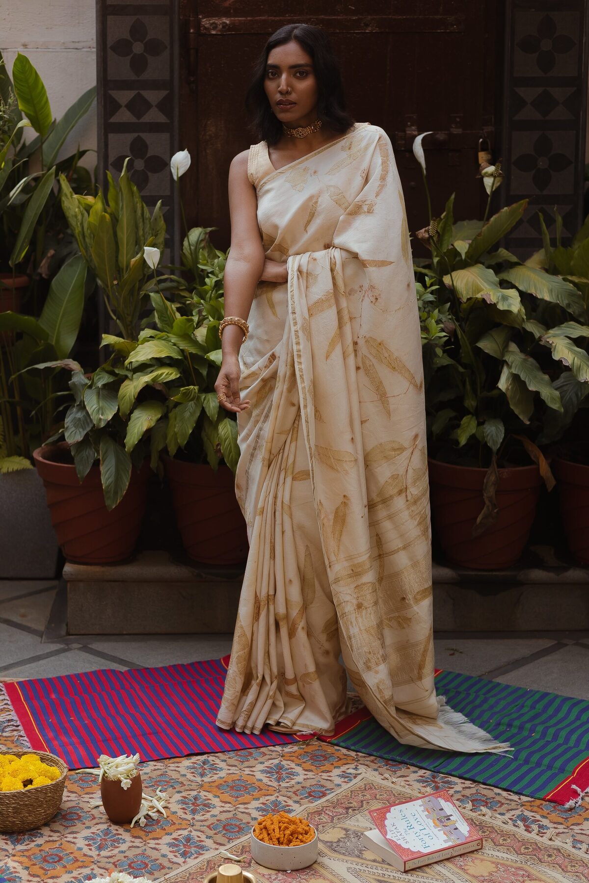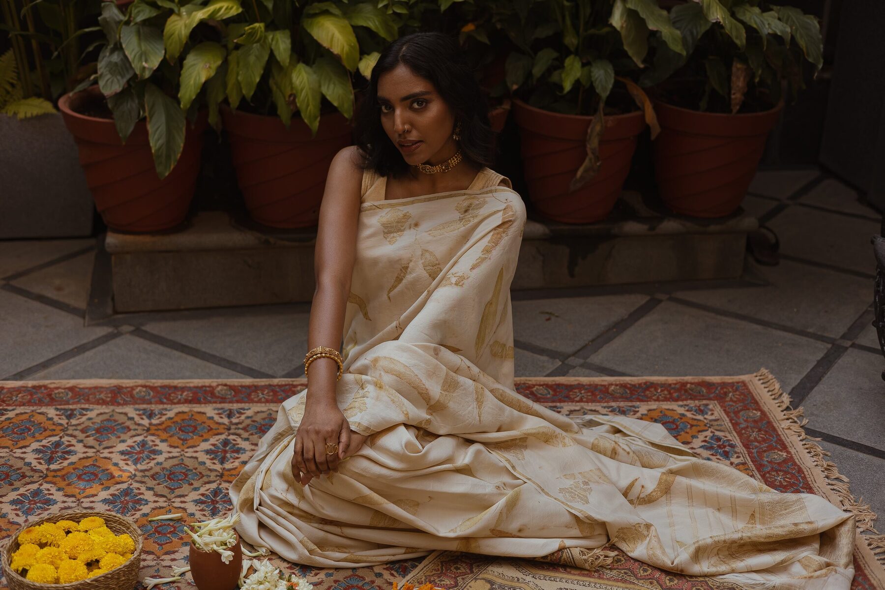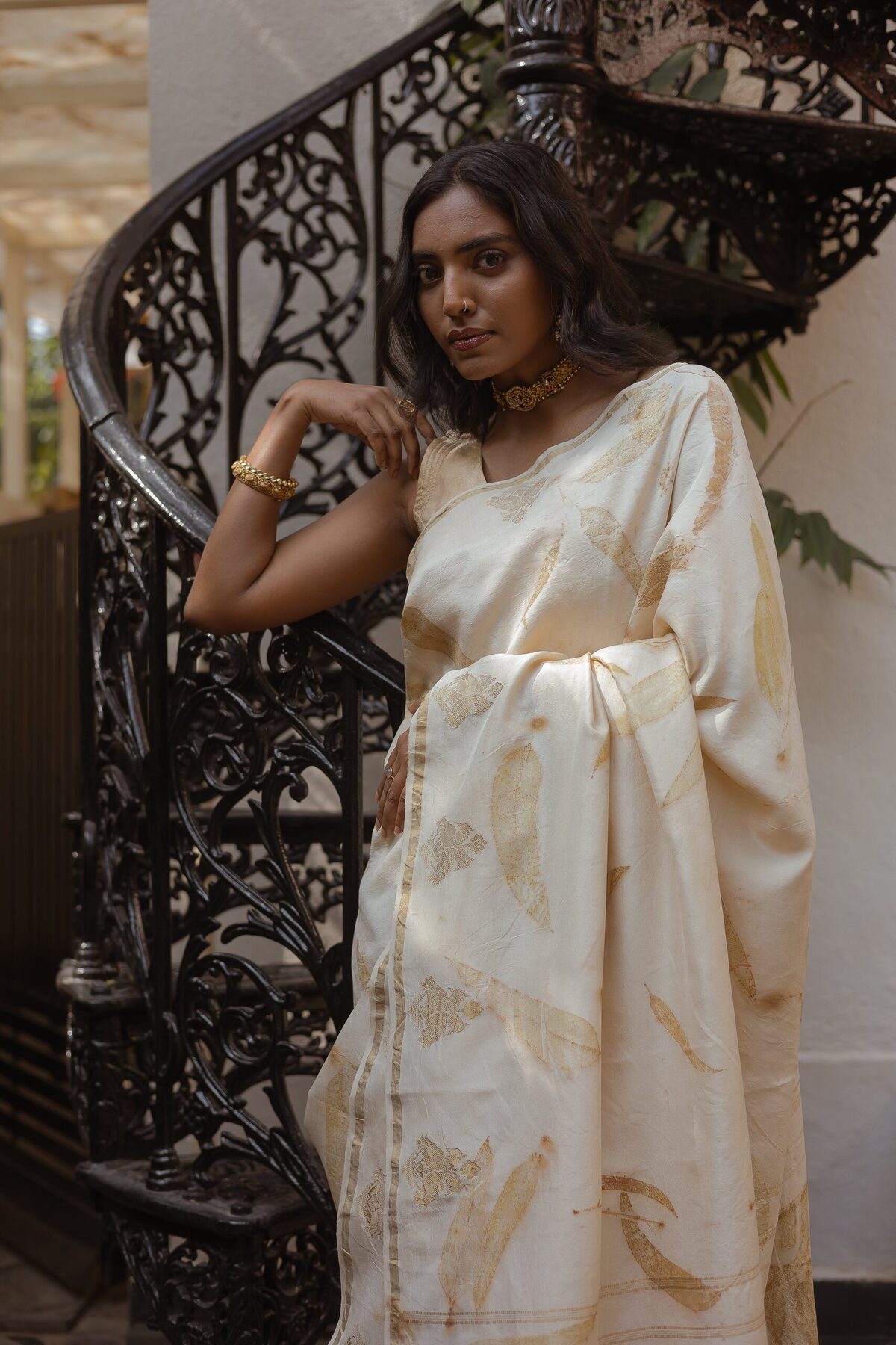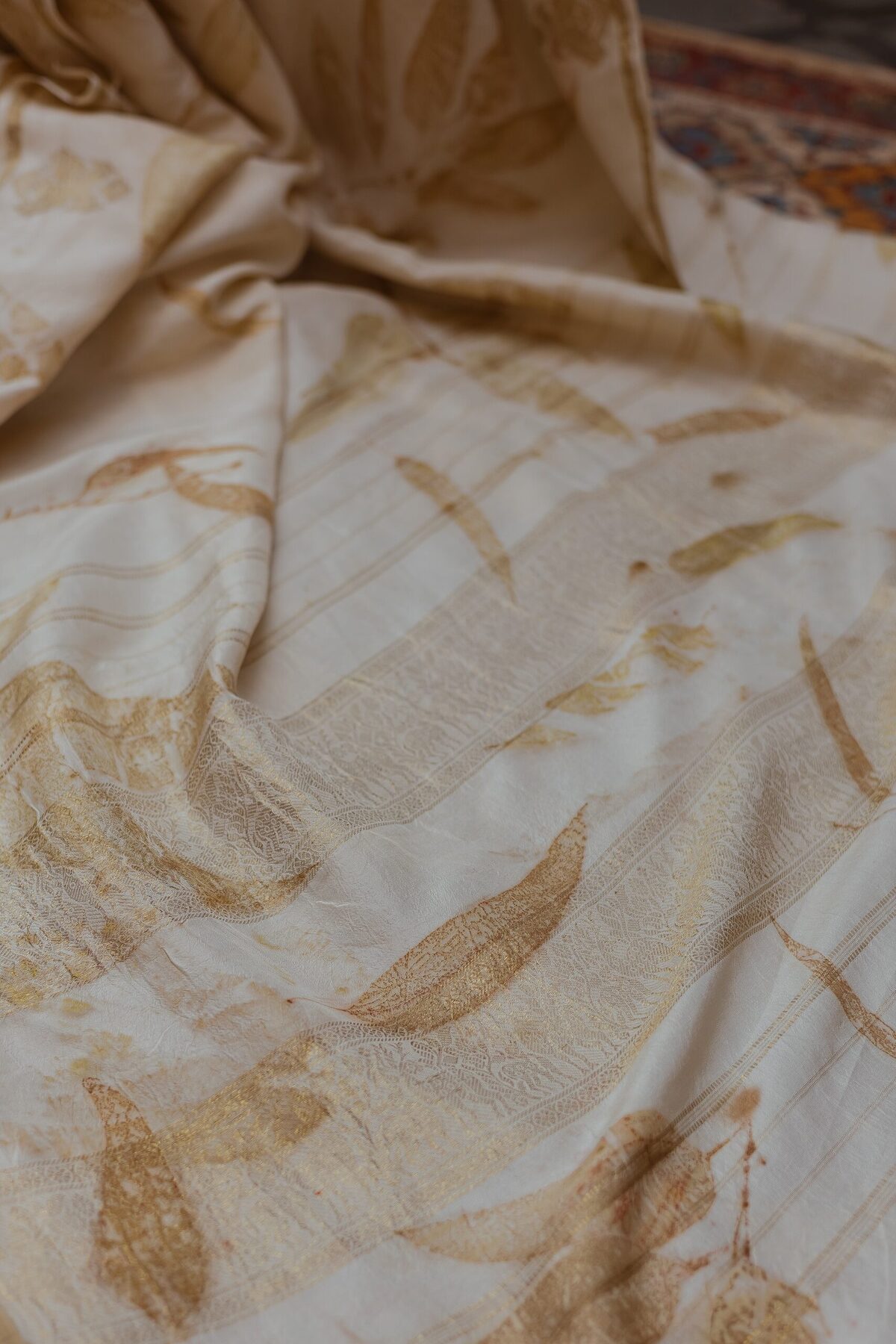 Made from 100% Pure Mulberry Silk, this saree is airy, luxurious, and kind to the skin.. Woven in Kanchipuram, Tamil Nadu, and finished with botanical eco-prints, this saree reflects a fusion of sacred handloom heritage and modern sustainability.