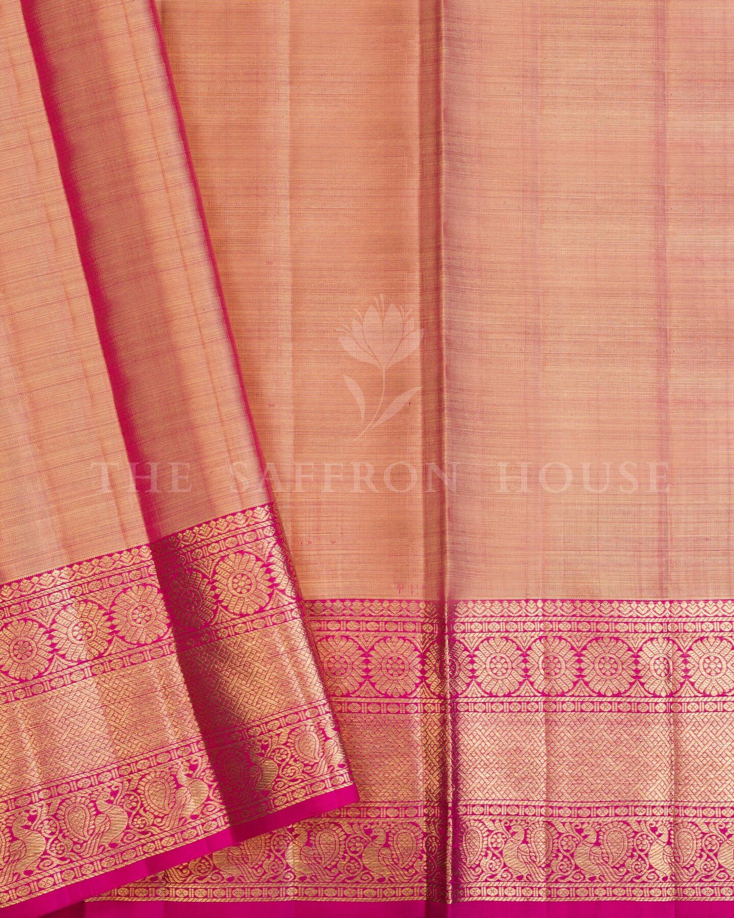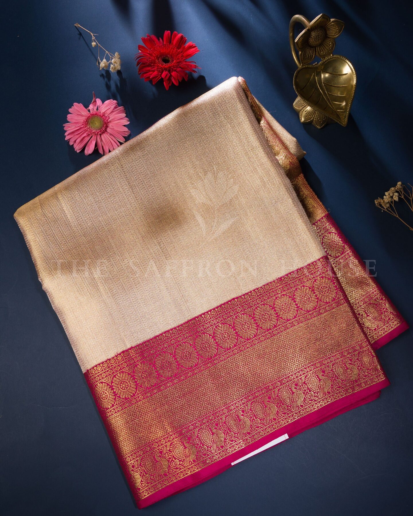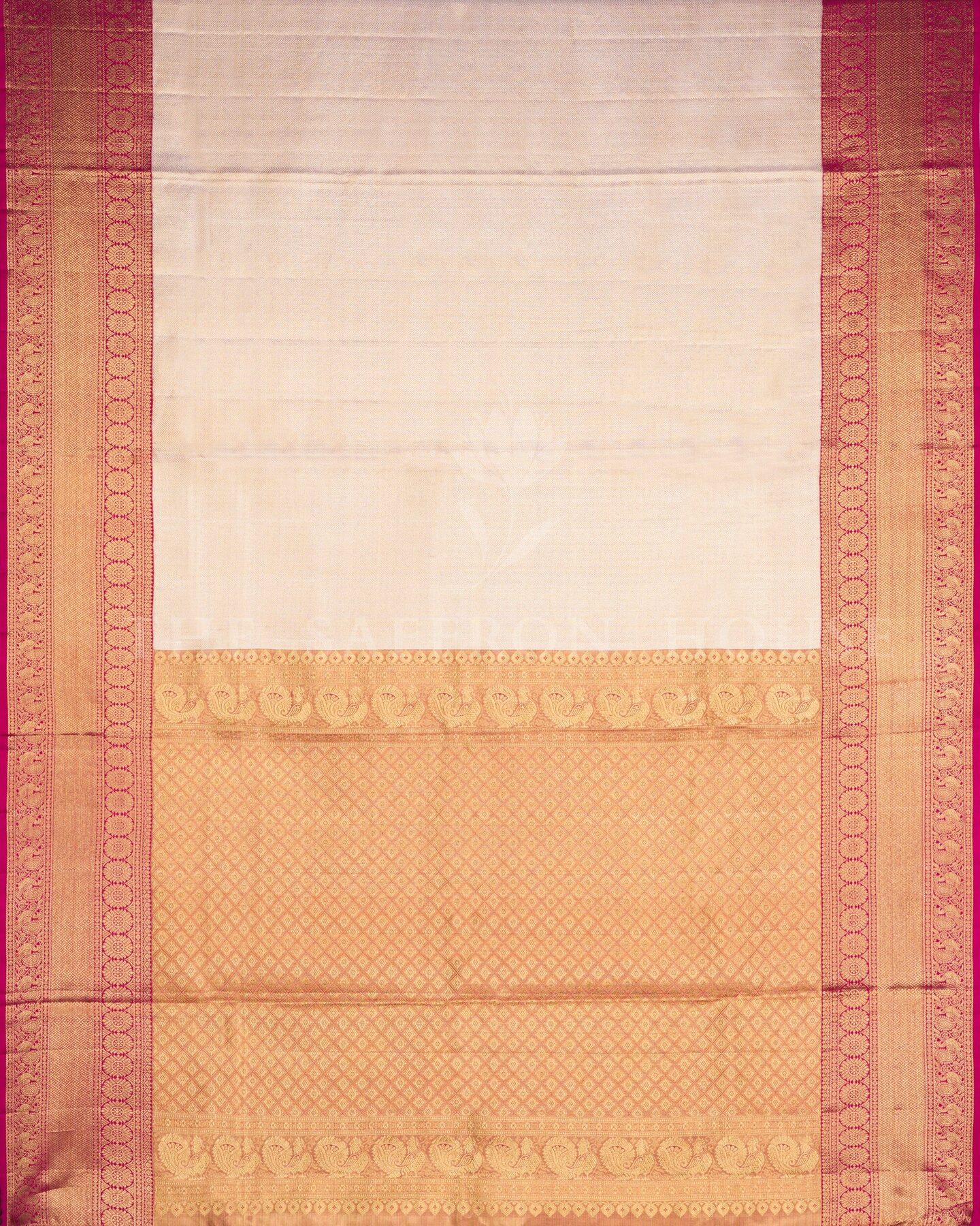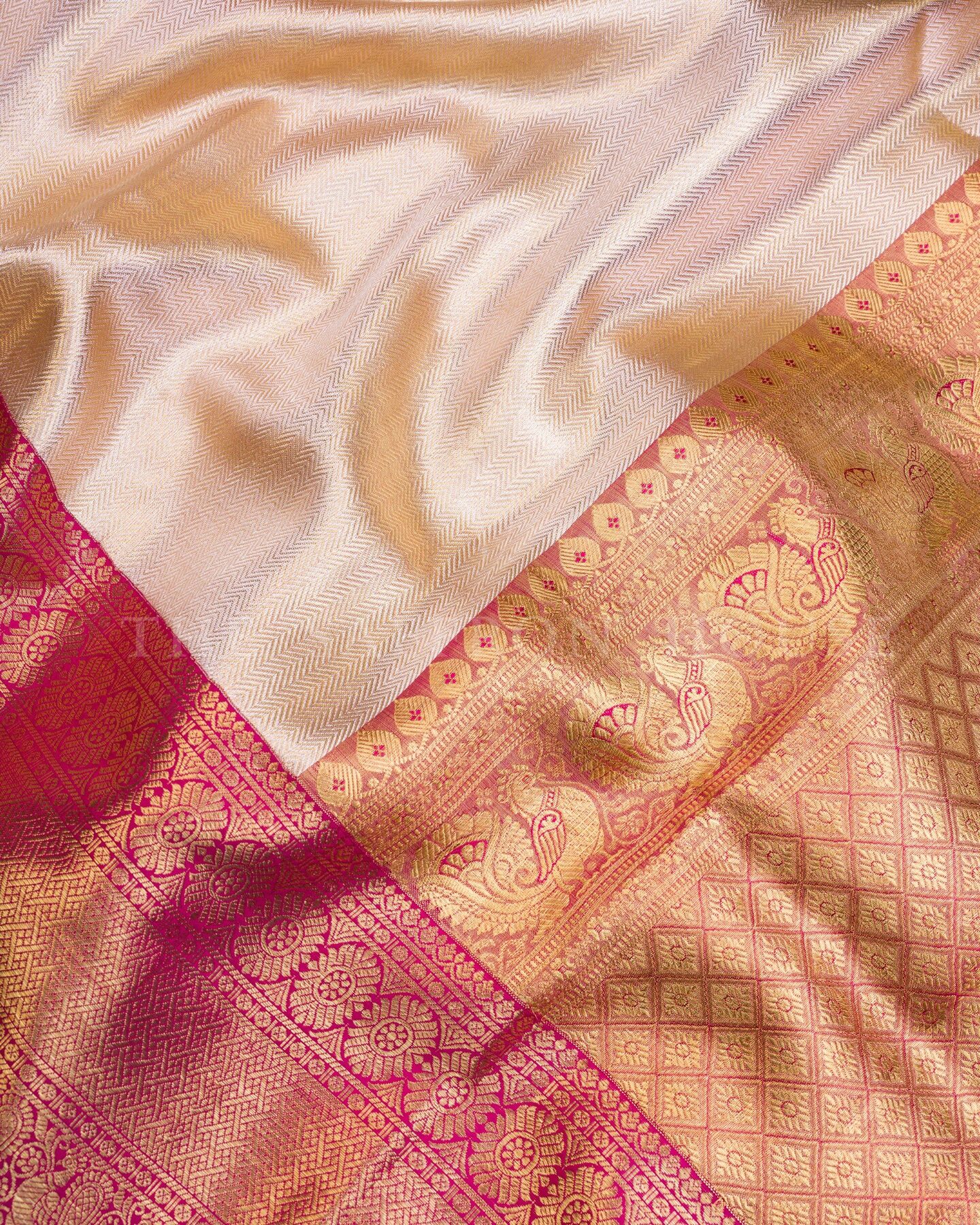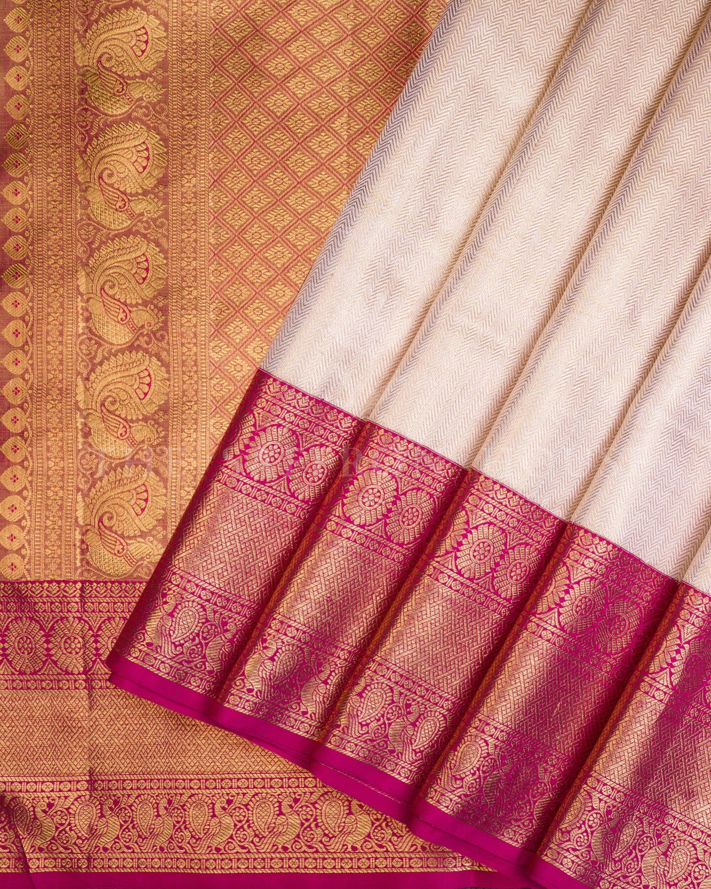 There is something about the interplay of ivory and rani pink that feels both ancient and alive. This Brocade Kanjivaram silk saree opens with timeless as heirloom milk silk, its surface shimmering with the unhurried rhythm of the loom.