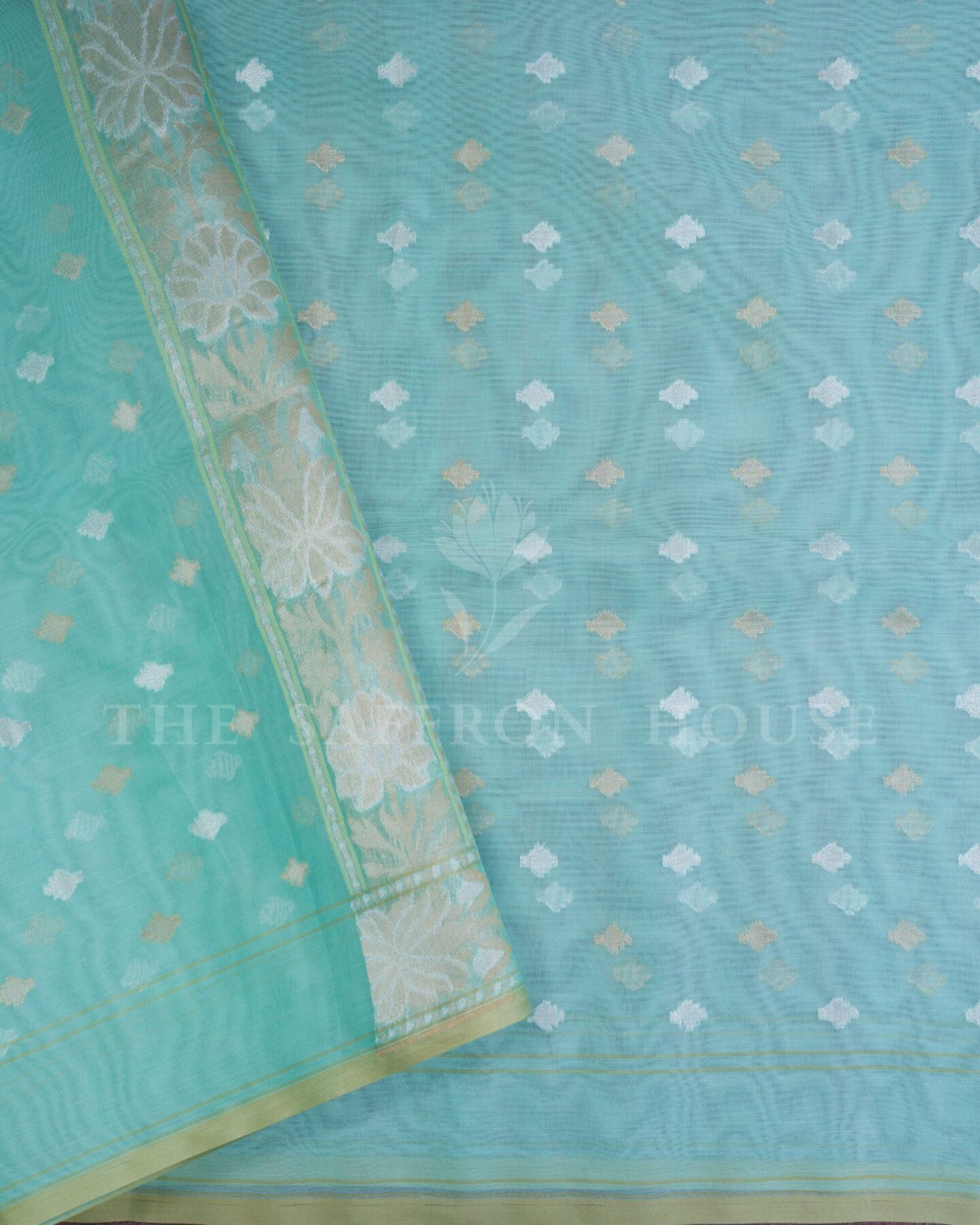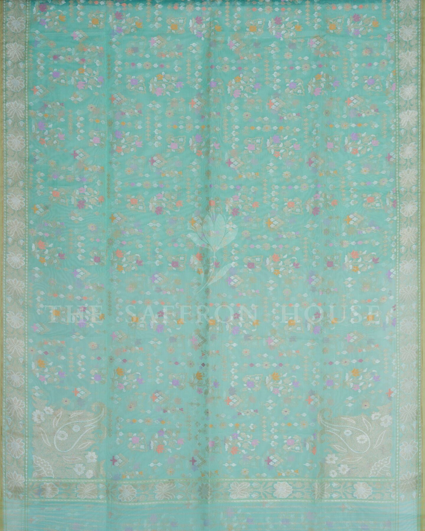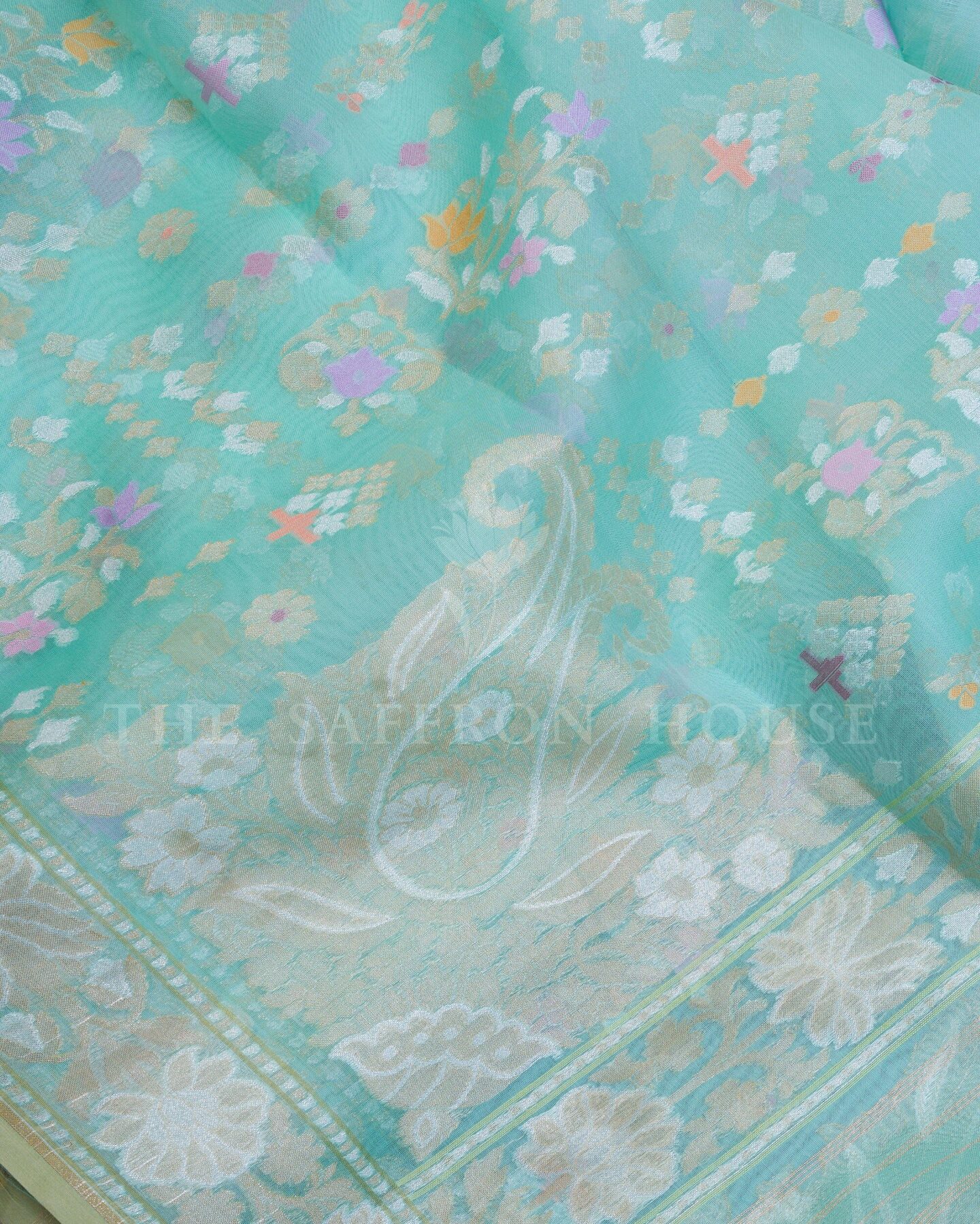 Some colours hold memory. Mint — radiant in its own quiet way — becomes something entirely new when woven into pure Kanjivaram silk. This Kora saree carries that colour with quiet authority and grace.
