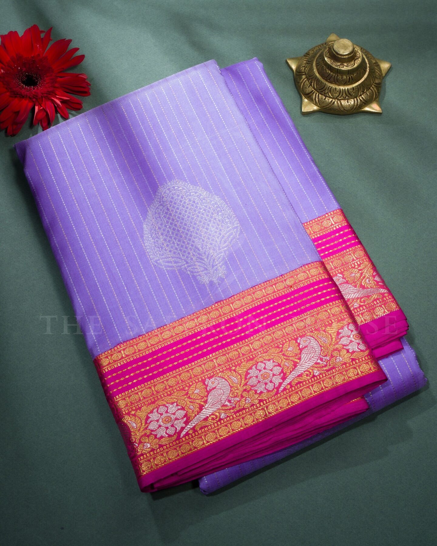 Pure mulberry silk with pure zari weaving, providing a rich, lustrous texture and structure that drapes like a dream — ideal for festive dressing.. From the looms of Kanchipuram, Tamil Nadu, where master weavers have passed down their skills over generations.