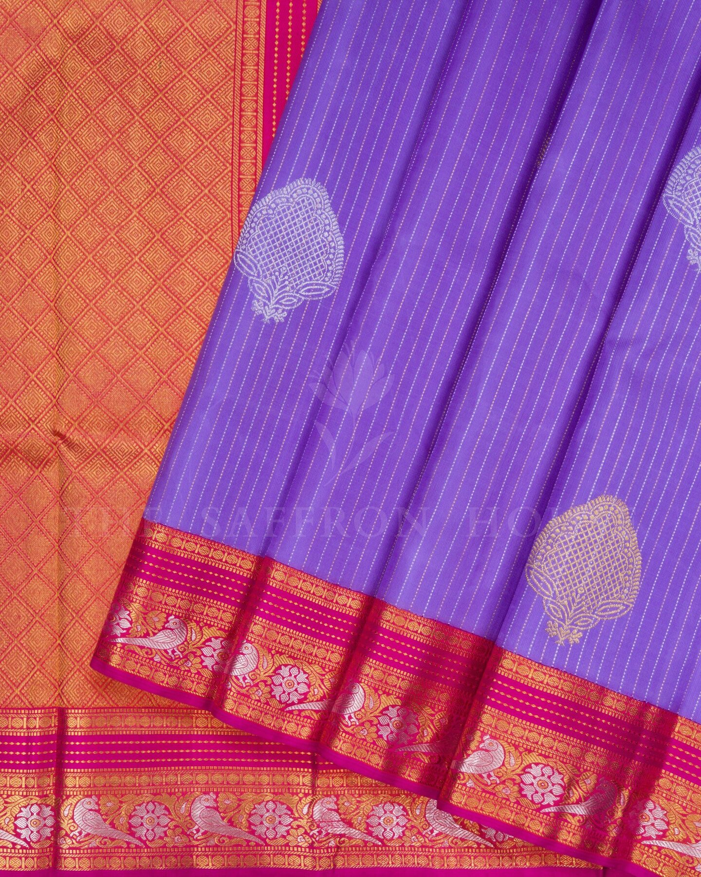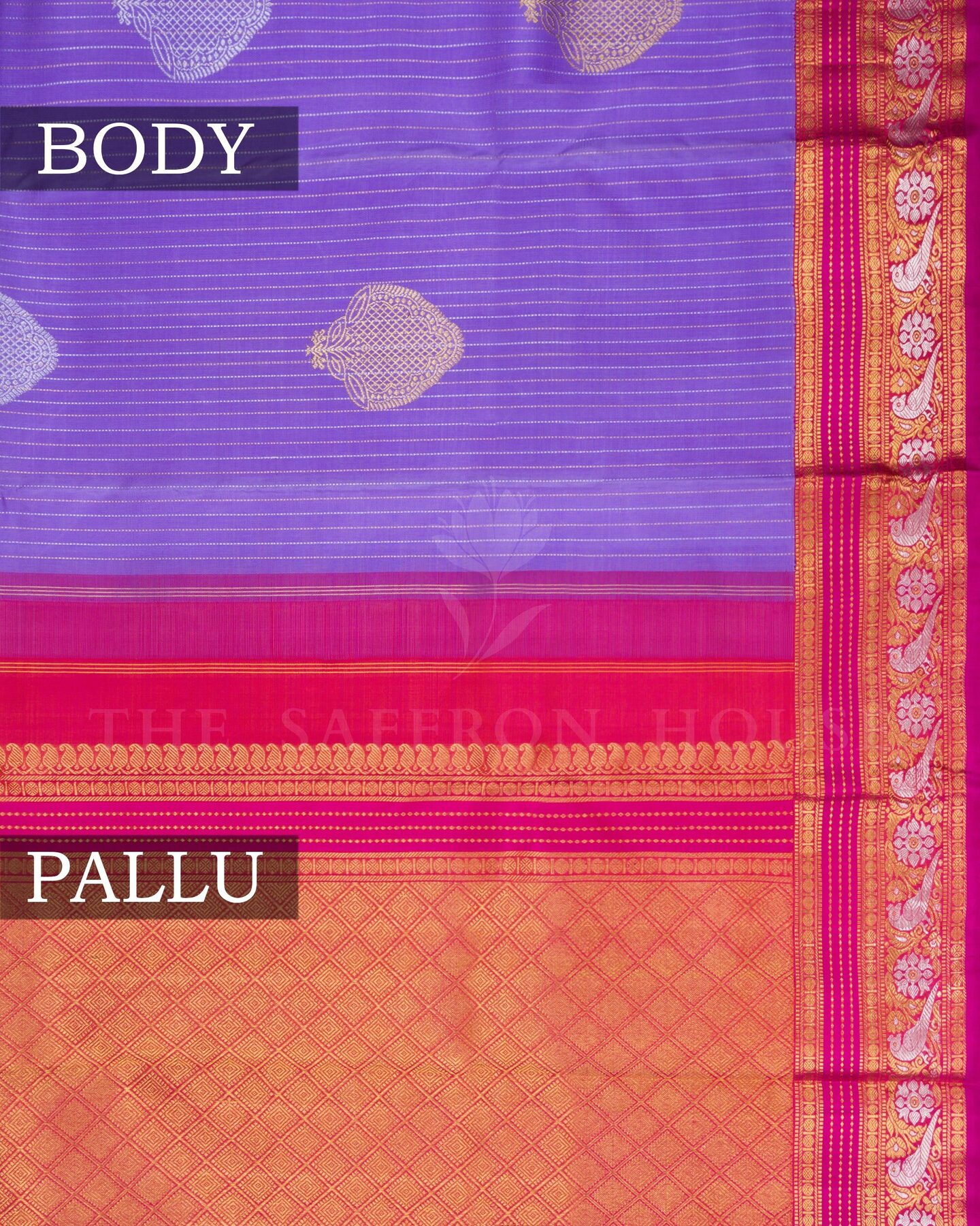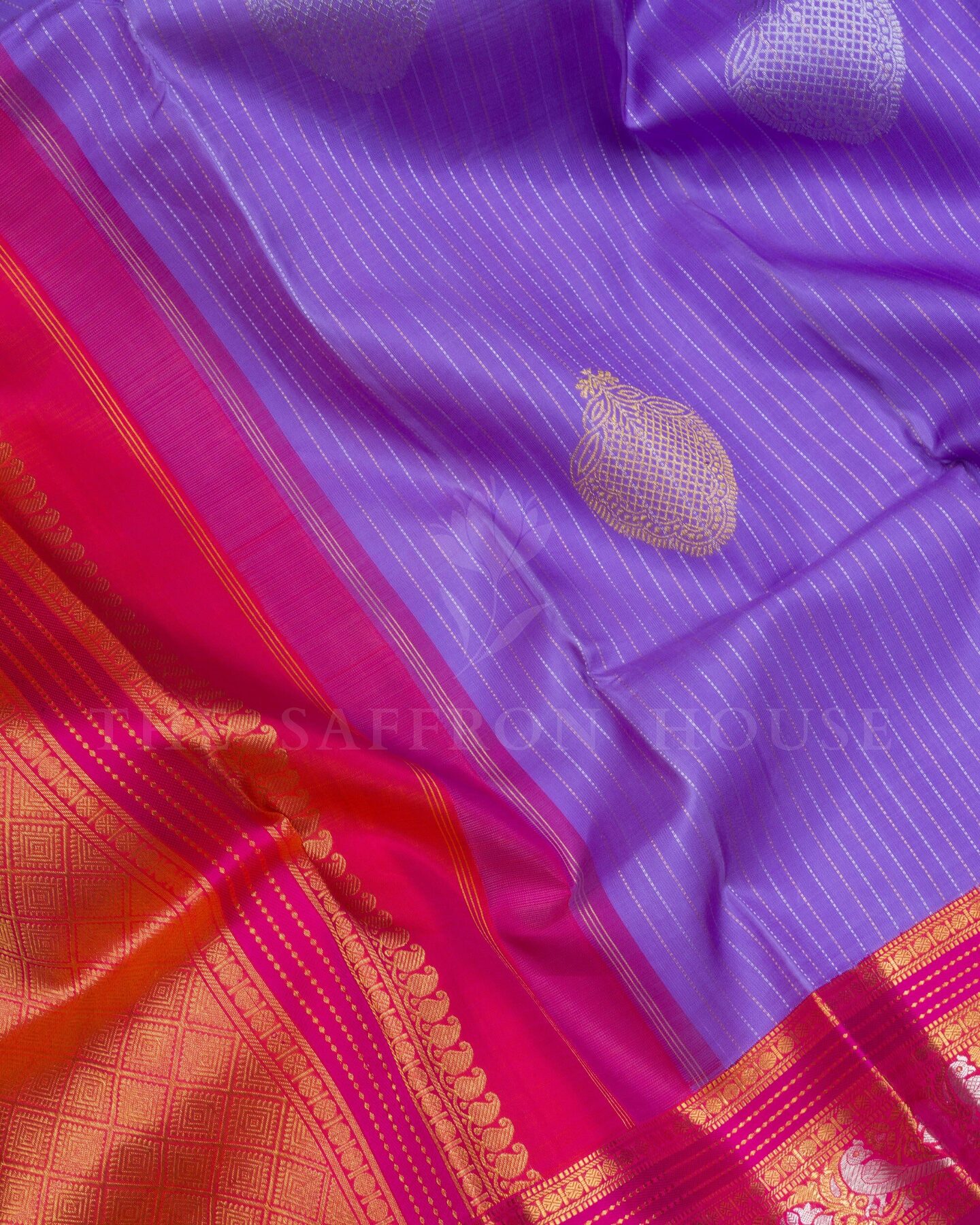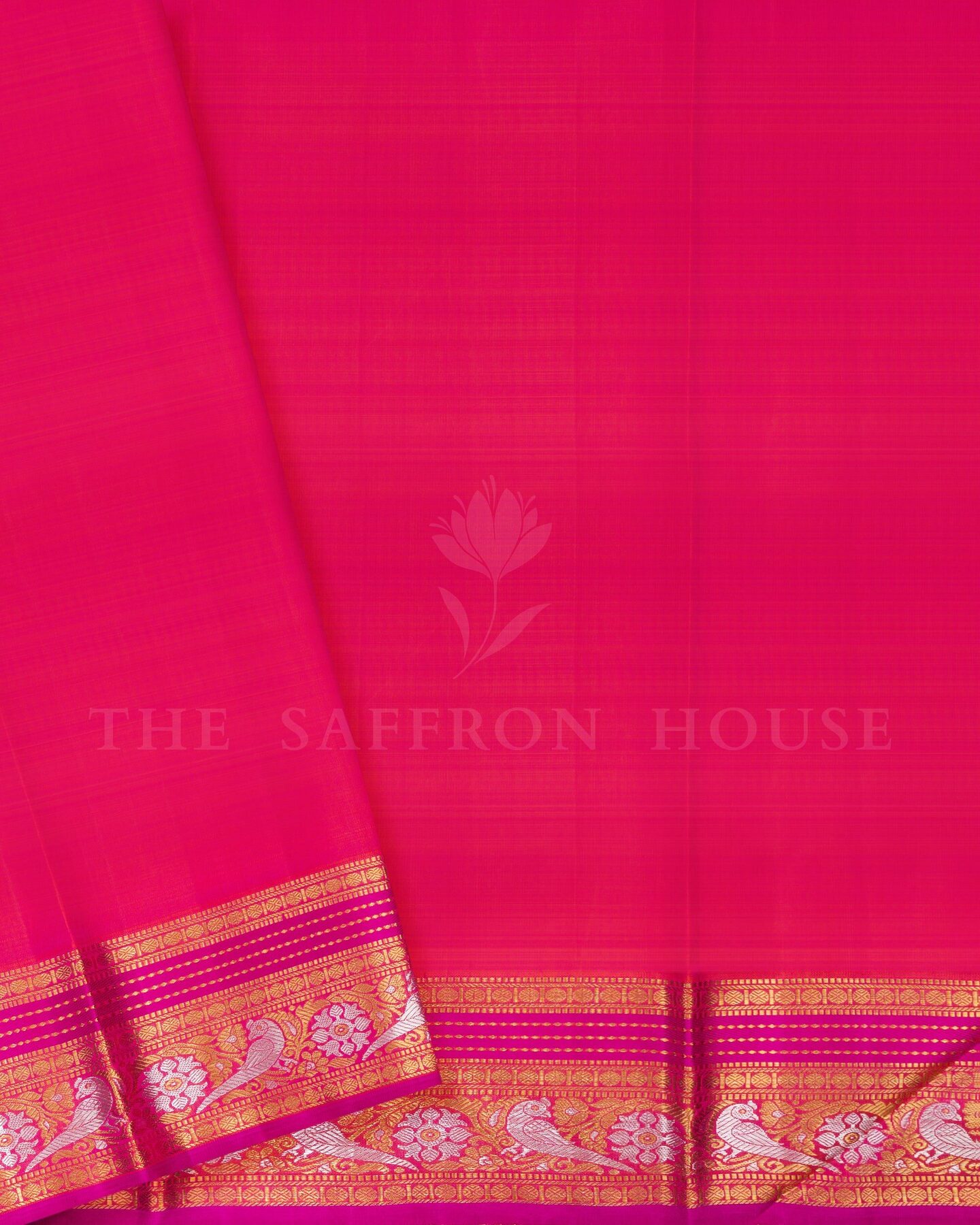 The body is adorned with silver & gold vertical small stripes with silver & gold big motifs, each thread placed with precision and purpose. The magenta pink border frames the drape with confident definition, while silver and gold zari runs through the weave, catching light the way temple gold does — slowly, deeply, unforgettably.