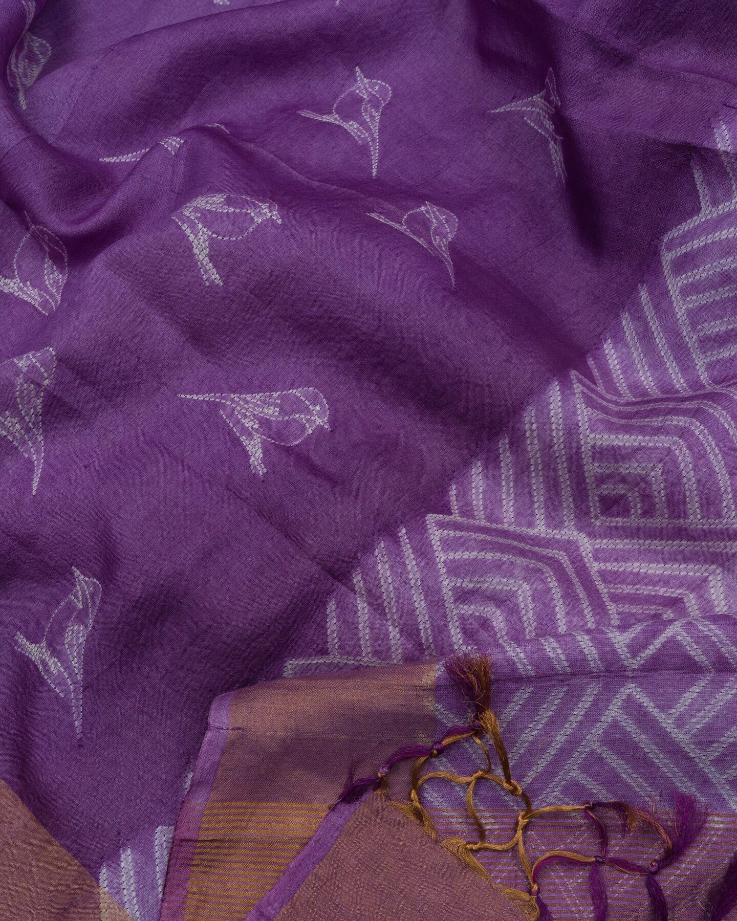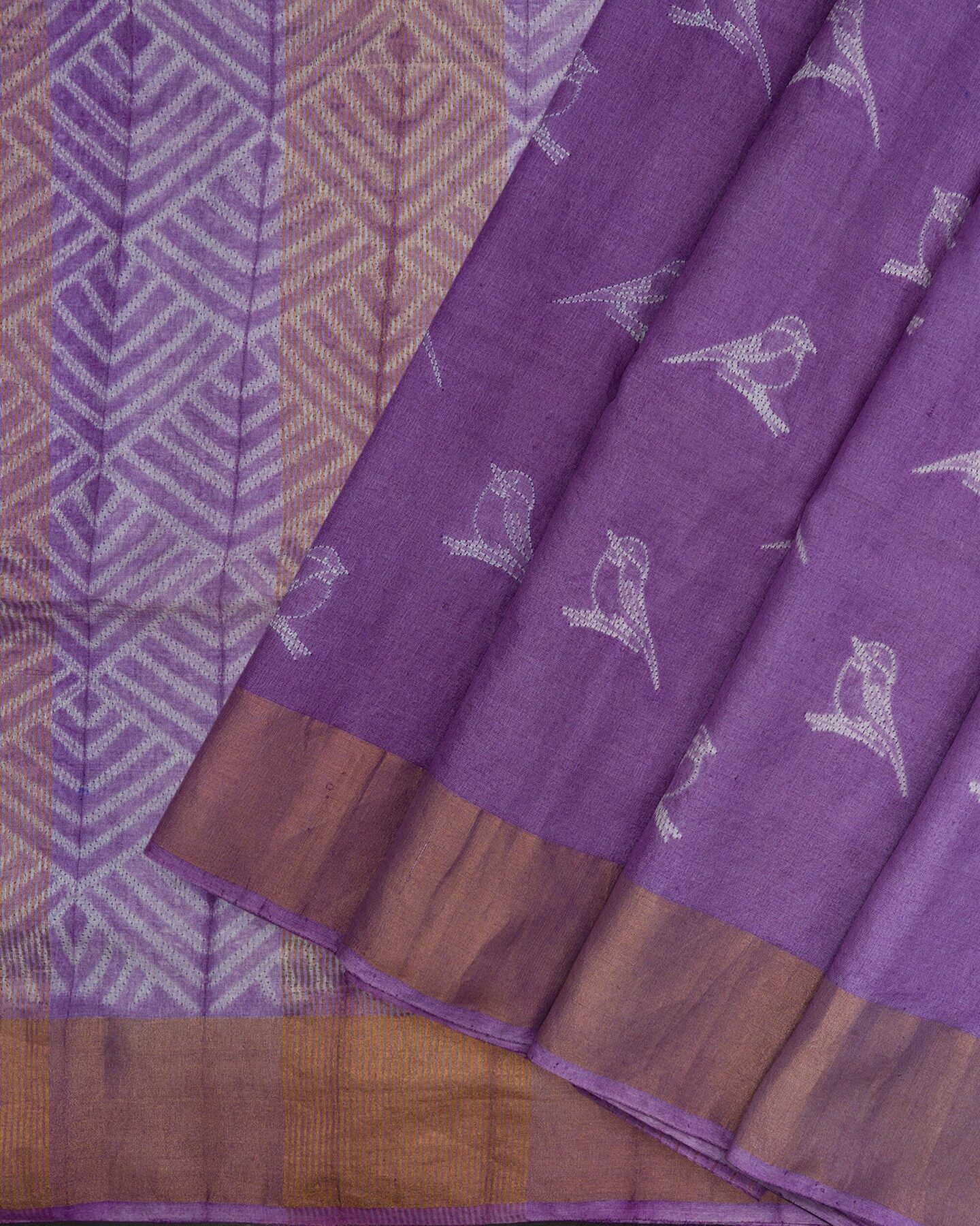 The body is adorned with bird motif shibori print, each thread placed with precision and purpose. The self border frames the drape with confident definition, while gold zari runs through the weave, catching light the way temple gold does — slowly, deeply, unforgettably.