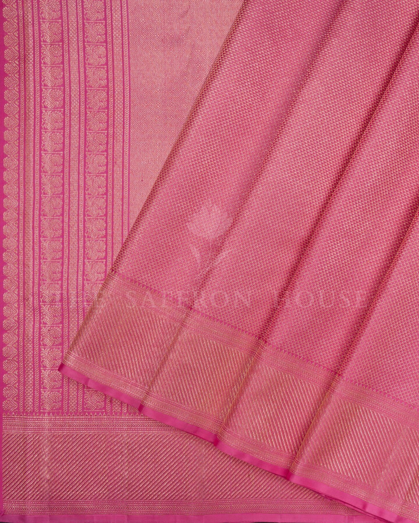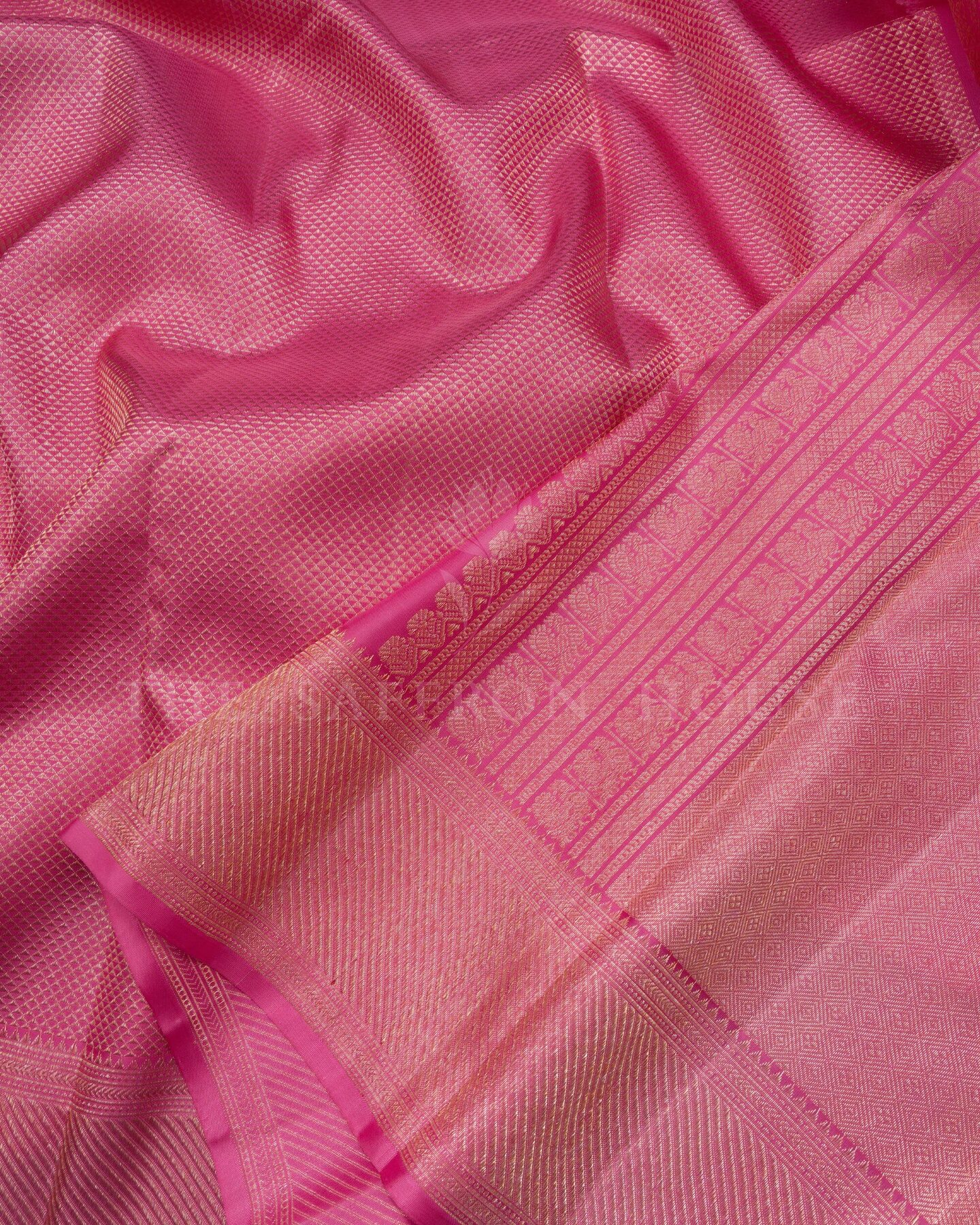 The body is adorned with geometric diamond brocade, each thread placed with precision and purpose. The self border frames the drape with confident definition, while gold zari runs through the weave, catching light the way temple gold does — slowly, deeply, unforgettably.