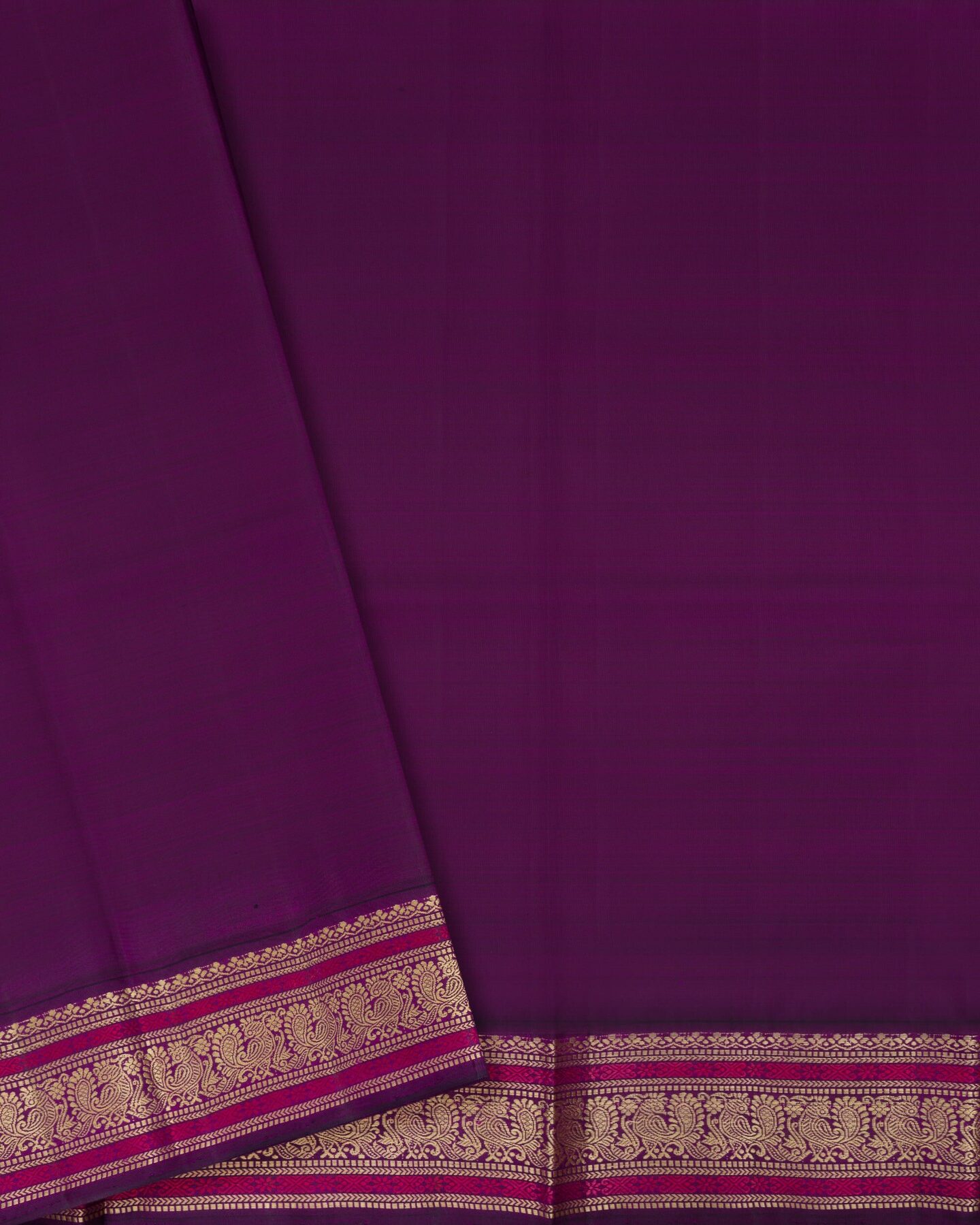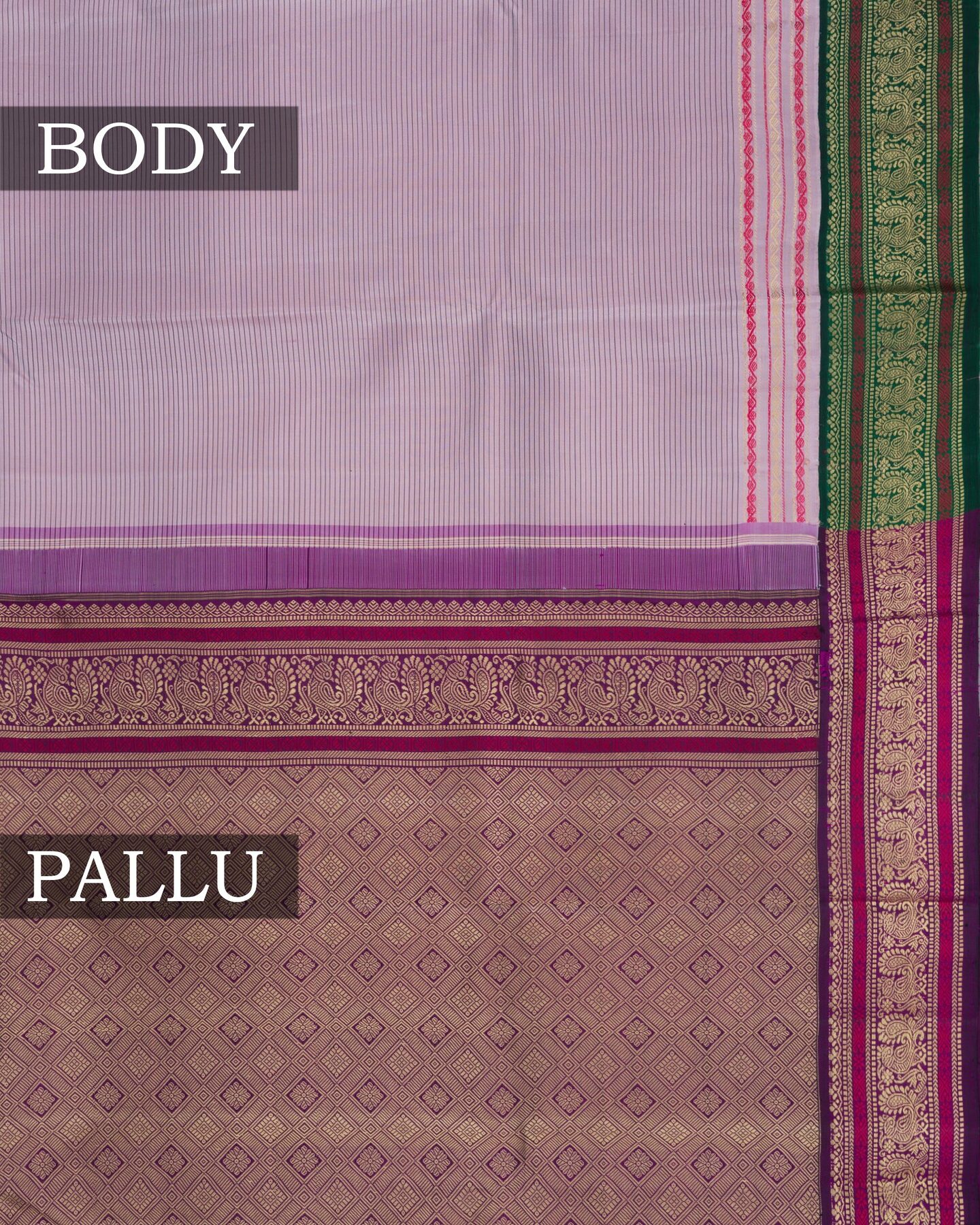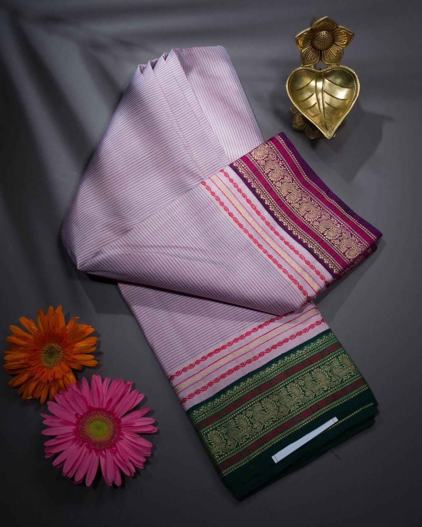 The body is adorned with vairaoosi lines, each thread placed with precision and purpose. The ganga jamuna green & purple border frames the drape with confident definition, while gold zari runs through the weave, catching light the way temple gold does — slowly, deeply, unforgettably.