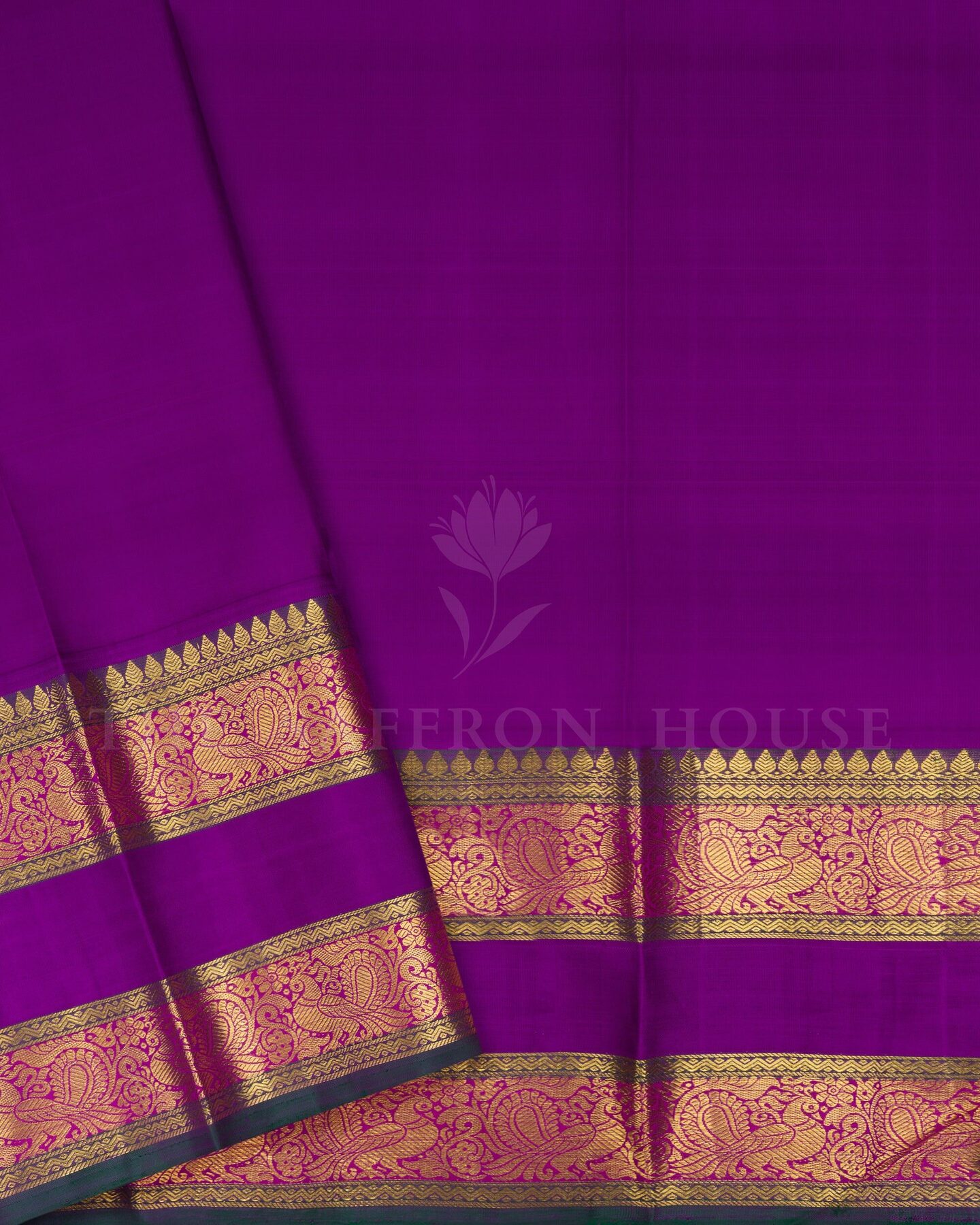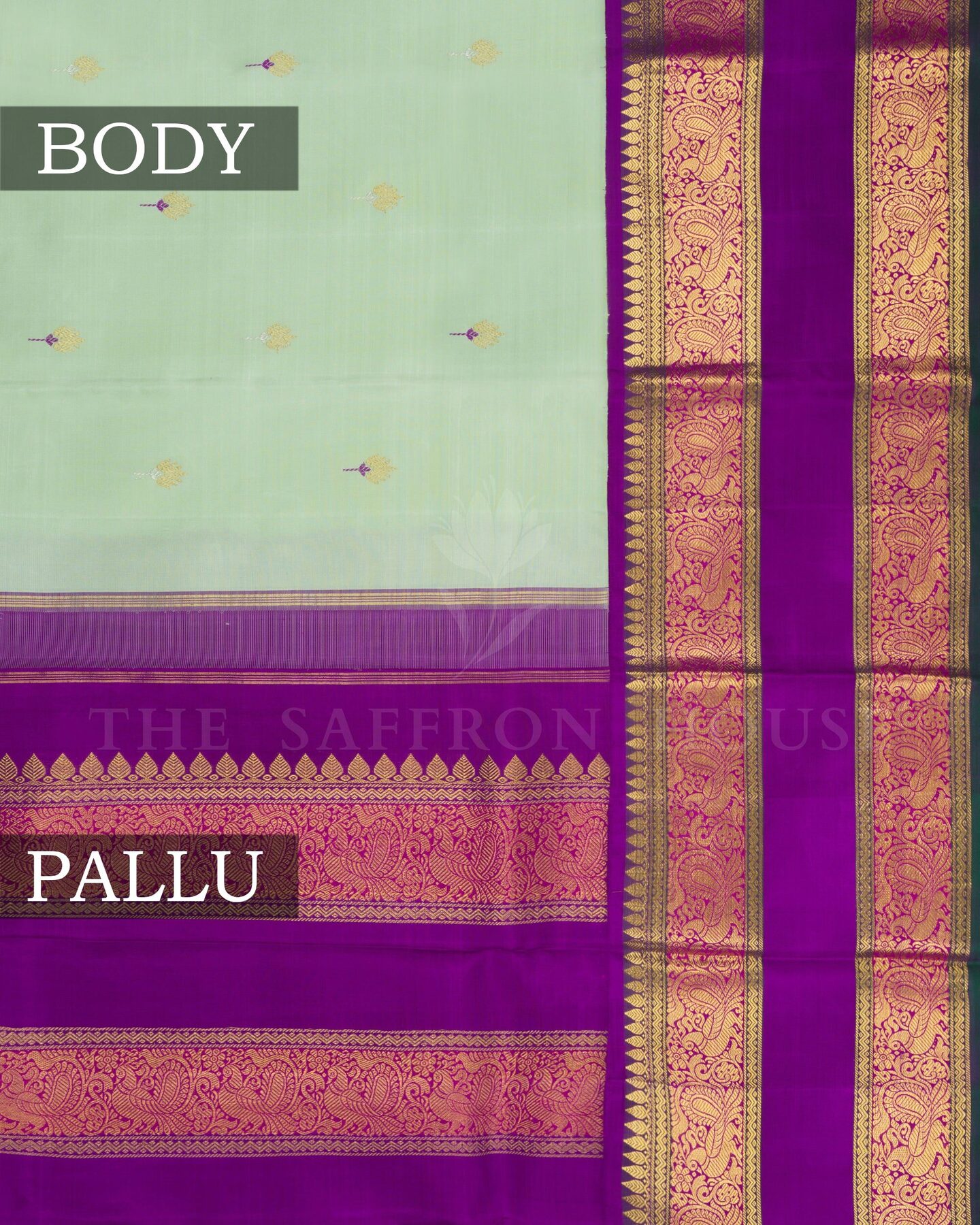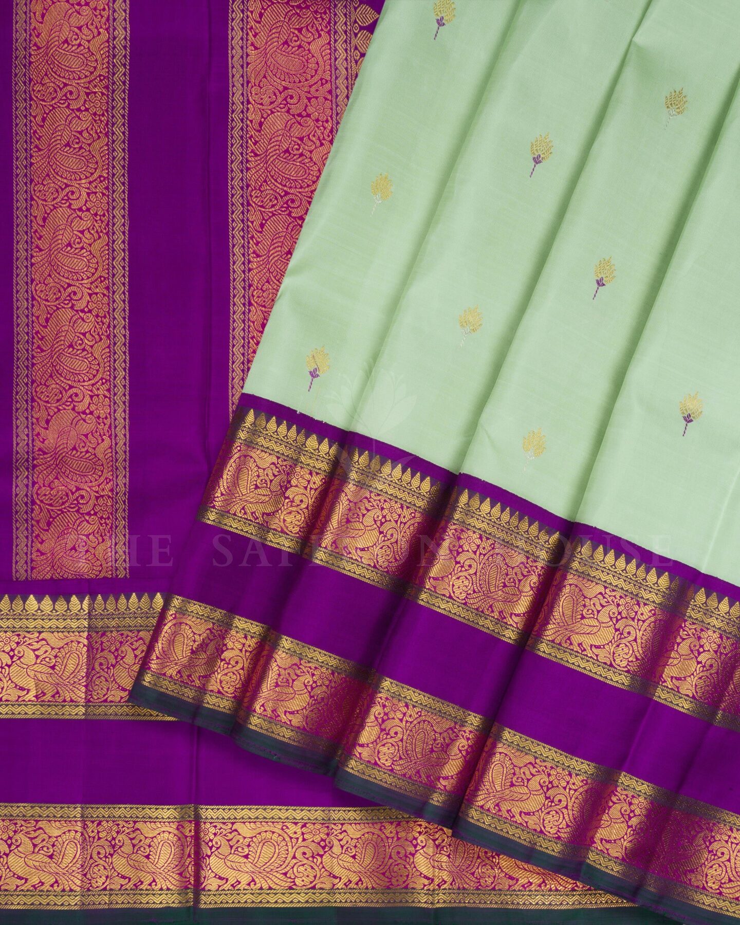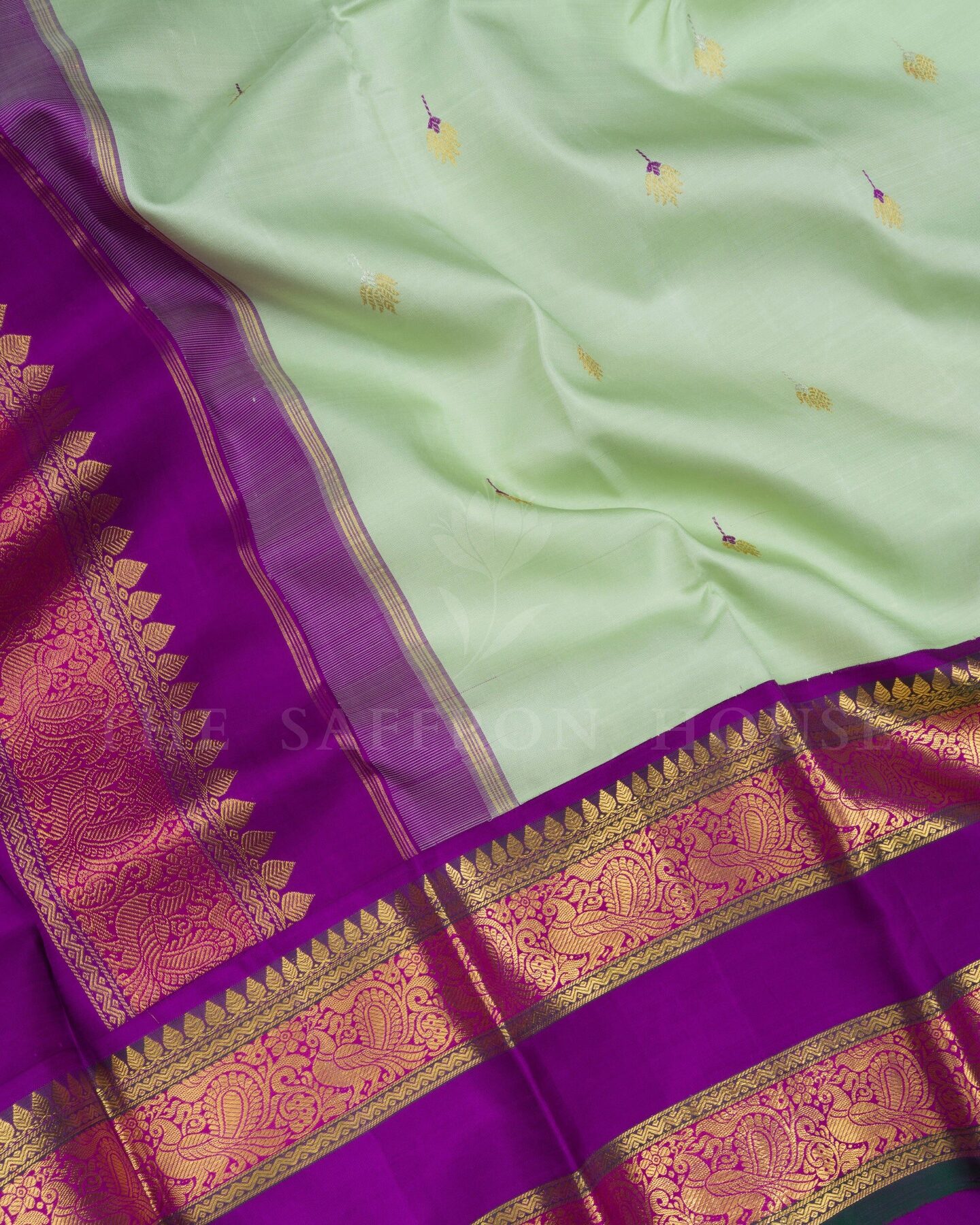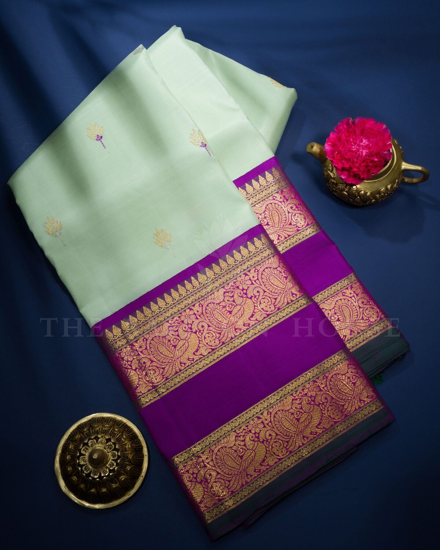There is something about the interplay of pista green and violet that feels both ancient and alive. This Handwoven Kanjivaram silk saree opens with radiant in its own quiet way, its surface shimmering with the unhurried rhythm of the loom.