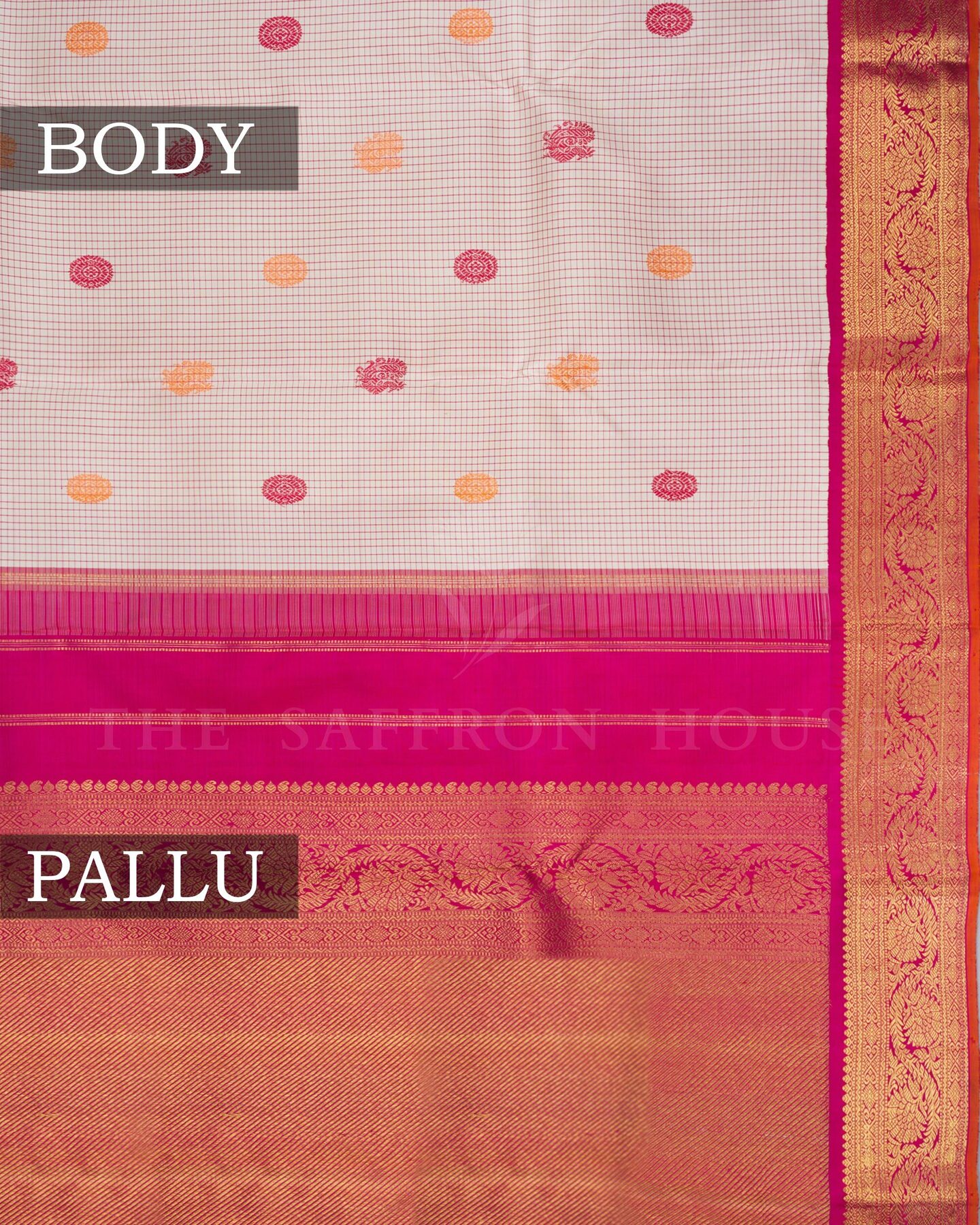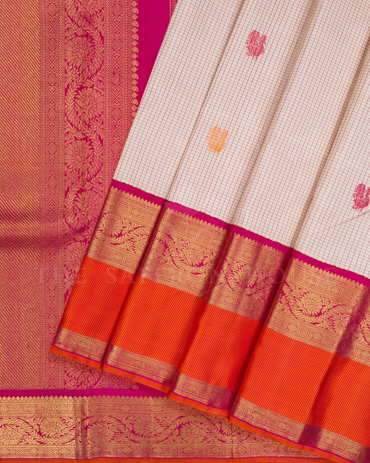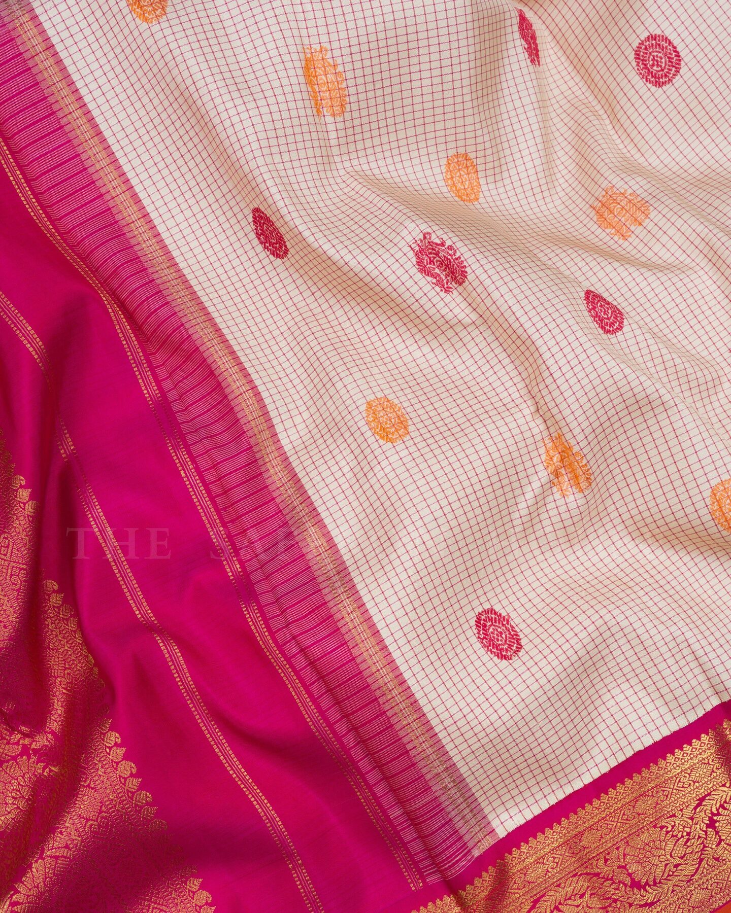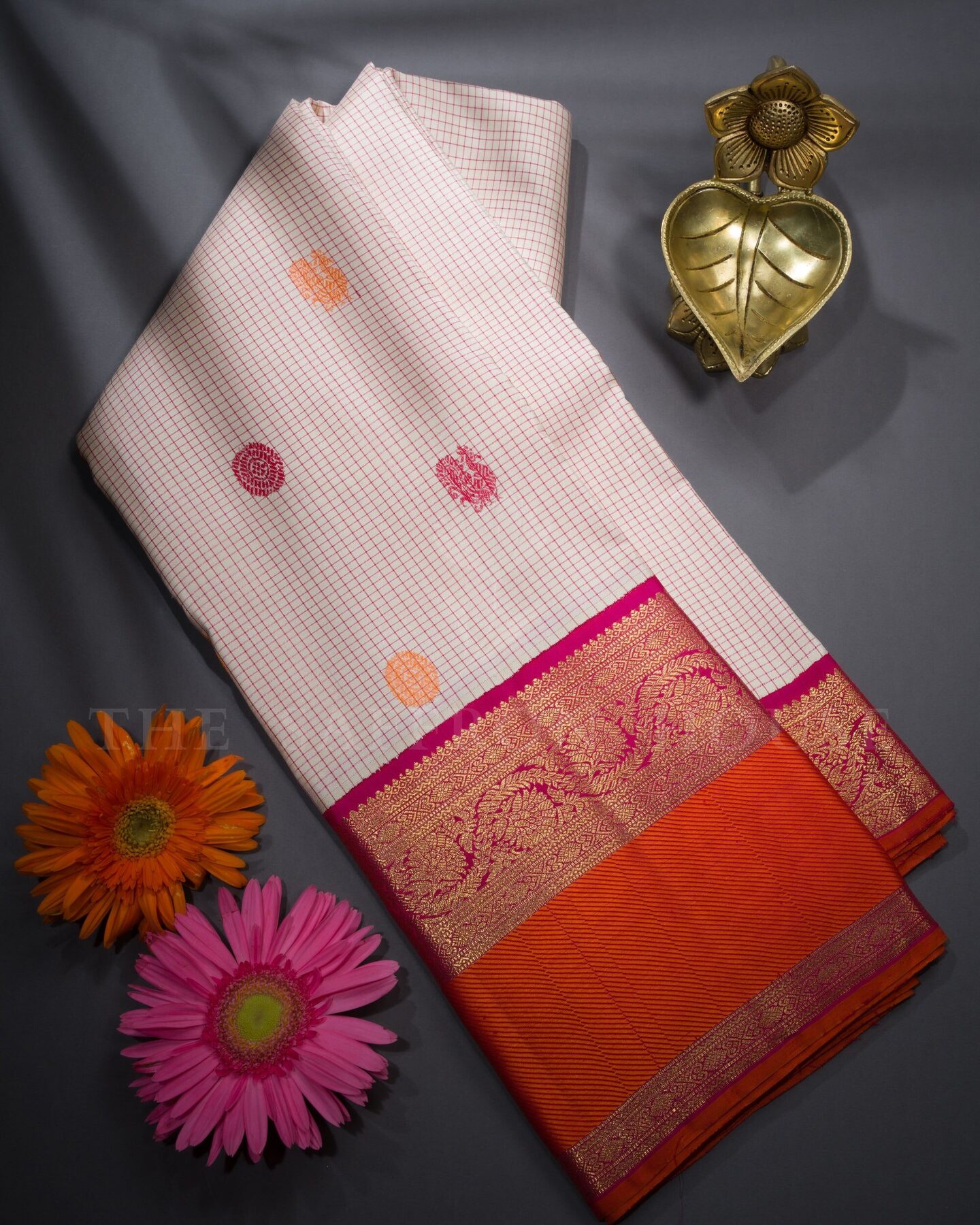 The body is adorned with peacock & rudrakshi with small checks, each thread placed with precision and purpose. The magenta pink with orange border frames the drape with confident definition, while real zari runs through the weave, catching light the way temple gold does — slowly, deeply, unforgettably.