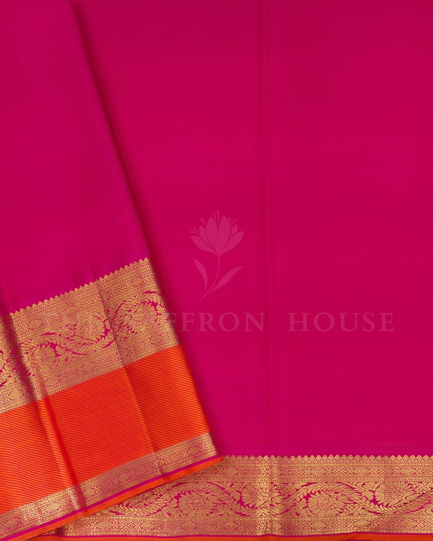 Some colours hold memory. Magenta Pink — radiant in its own quiet way — becomes something entirely new when woven into pure Kanjivaram silk. This Korvai saree carries that colour with quiet authority and grace.