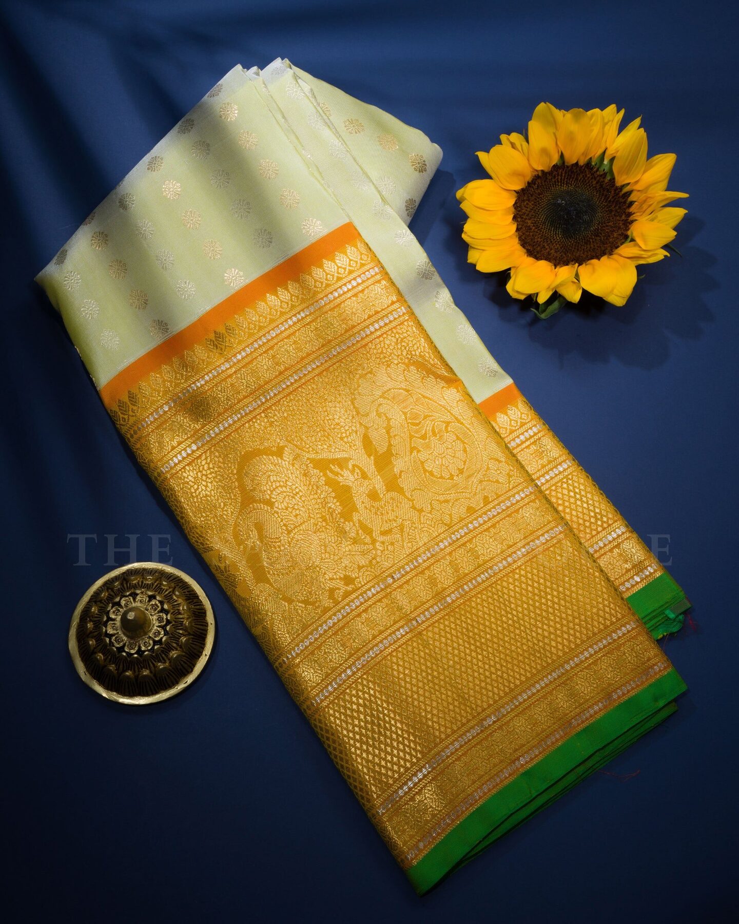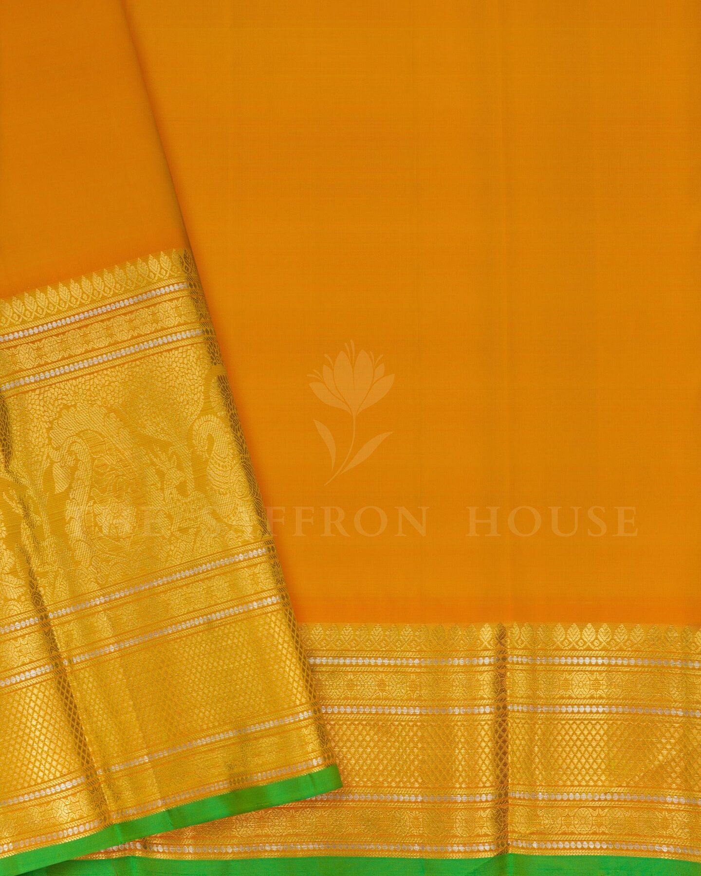 The body is adorned with silver & gold rudrakshi, each thread placed with precision and purpose. The orangish yellow border frames the drape with confident definition, while silver and gold zari runs through the weave, catching light the way temple gold does — slowly, deeply, unforgettably.
